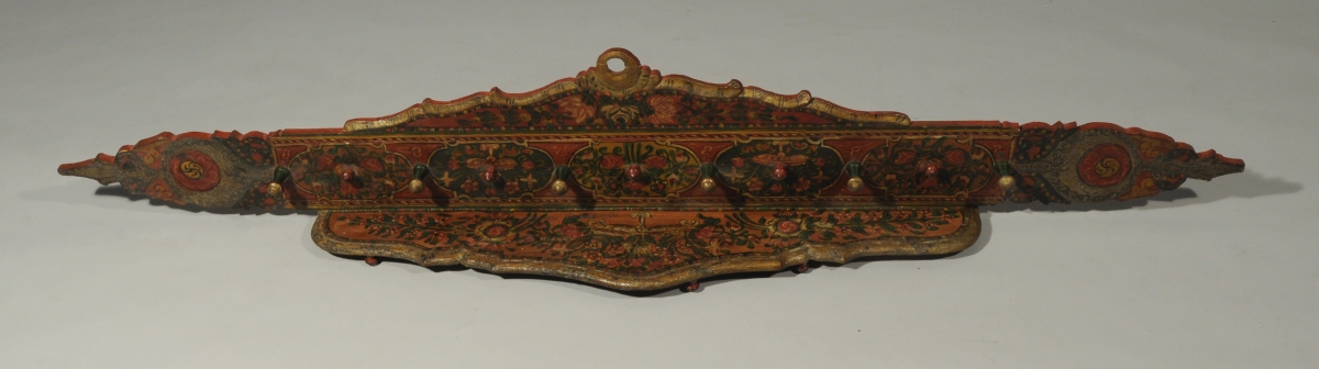 PORTE-MANTEAUX de forme mouvemetée à 11 attaches en bois peint à décor polychrome et or de vases fleuris, fleurs et feuillages.