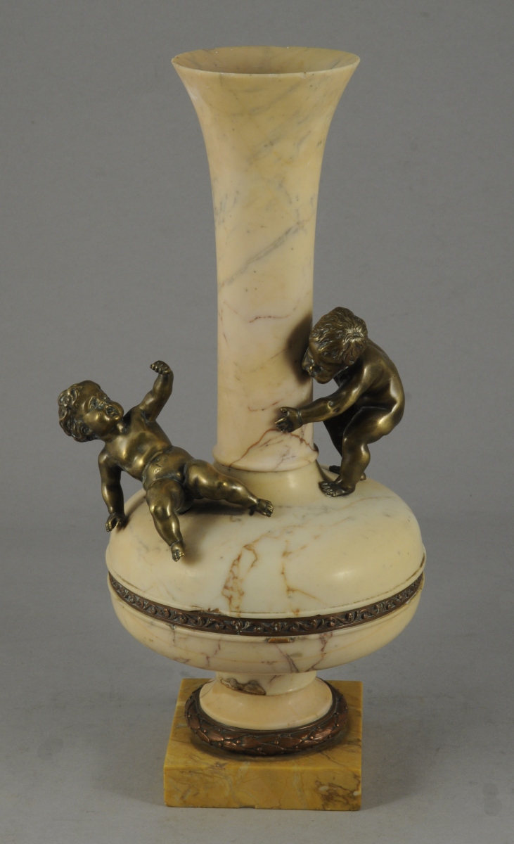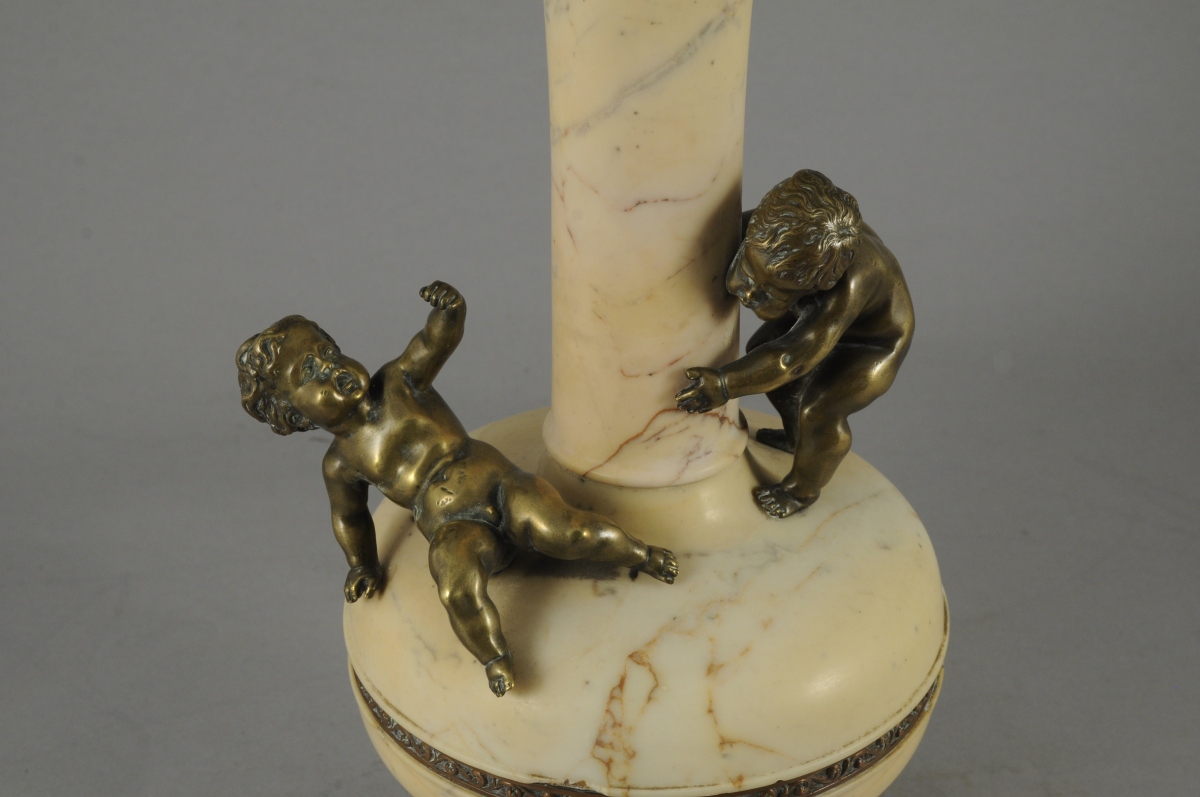 VASE en marbre beige, sur piédouche à panse et col tubulaire évasé. Repose sur une base carrée en marbre jaune. Deux amours en bronze prés du col, cerclage et base bronze à décor néo-classique de style XVIIIème.