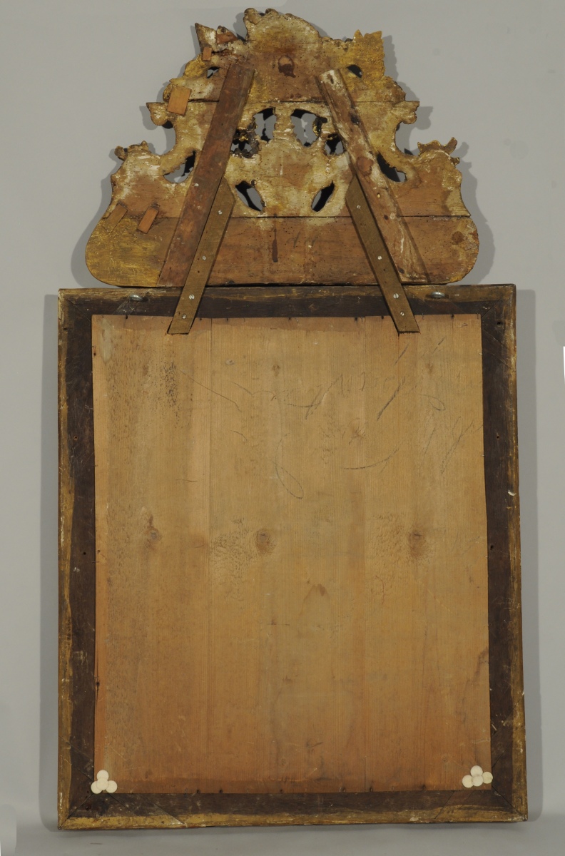 MIROIR À FRONTON de forme rectangulaire en bois sculpté, stuqué et doré. Décor de coquilles, quadrillages, volutes et rinceaux feuillagés. Le fronton de forme mouvementée orné d'un casque à l'antique, d'un panier fleuri et flanqué de deux dauphins. Travail ancien.