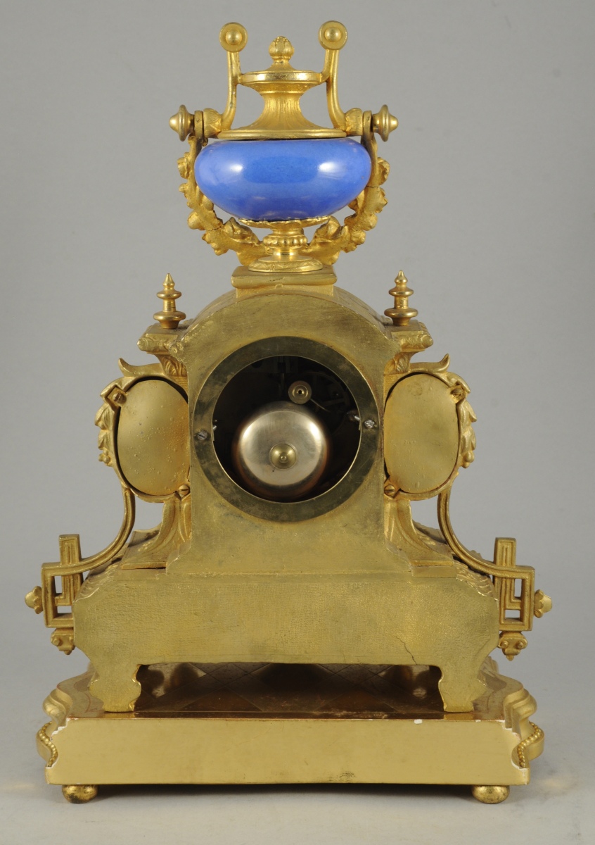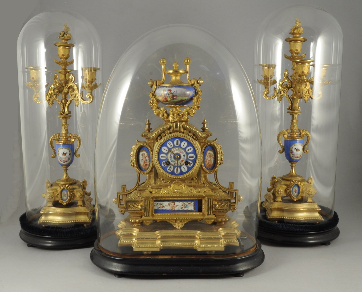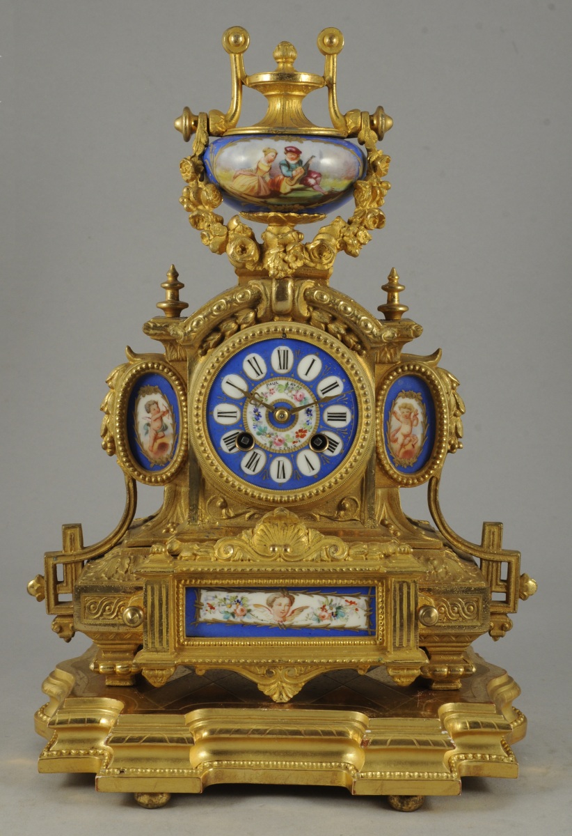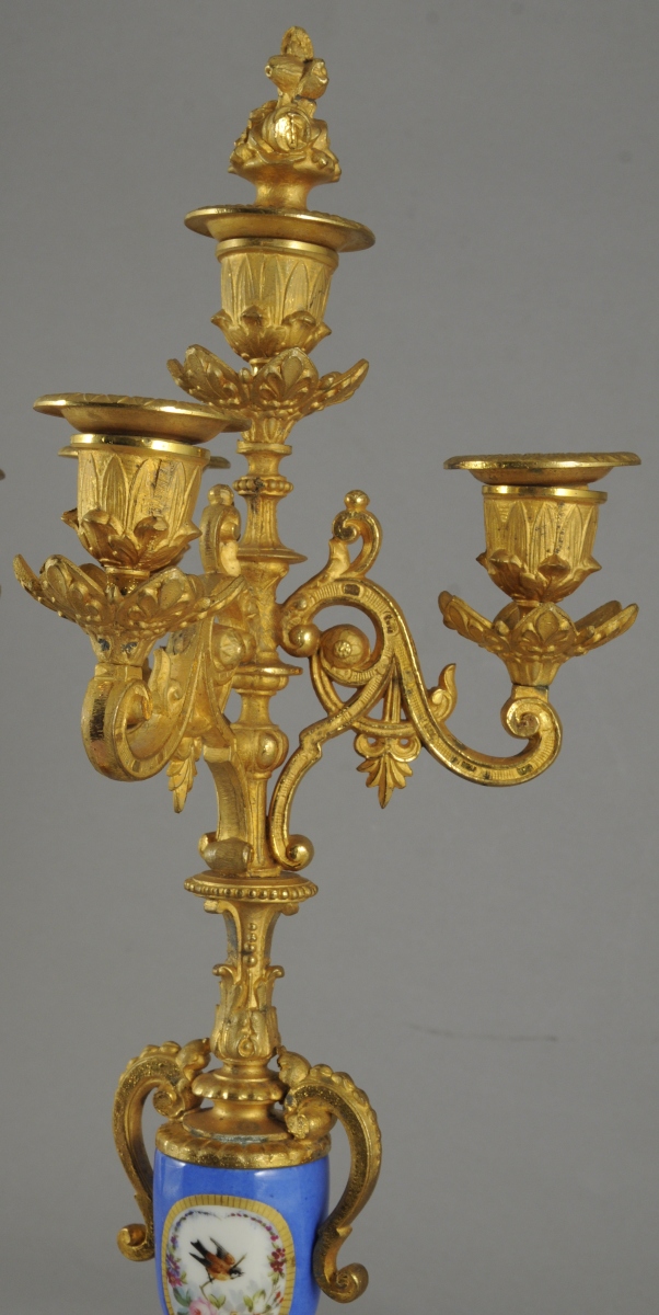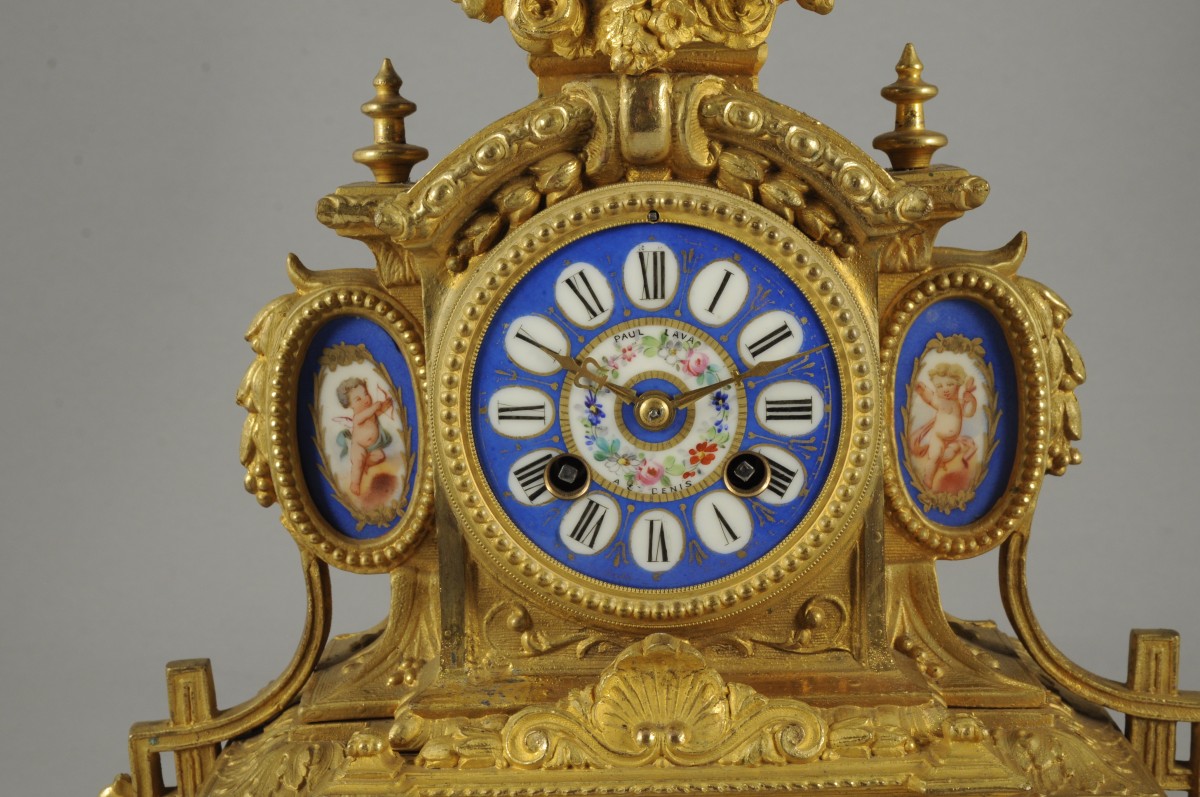 GARNITURE DE CHEMINÉE en bronze doré composée d'une pendule et d'une paire de candélabres. La pendule de forme architecturée reçevant un riche décor de raies de perles, feuilles d'acanthe, volutes feuillagées, coquilles stylisées et guirlande fleurie, elle est sommée d'une urne. Les candélabres à quatre lumières en bronze ciselé et doré. Ornementation de plaques de porcelaine à décor de putti, scène galante, oiseaux et fleurs. Cadran en porcelaine indiquant les heures en chiffres romains signé "Paul Lava à St Denis".