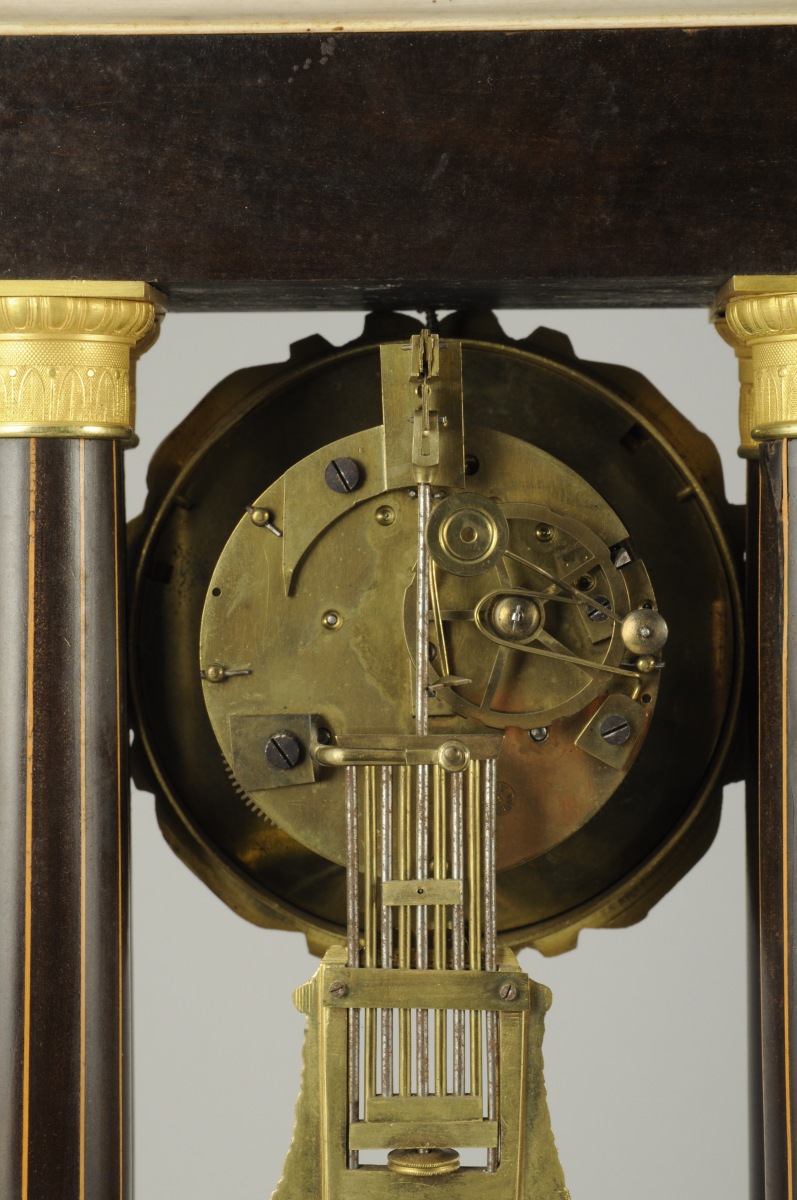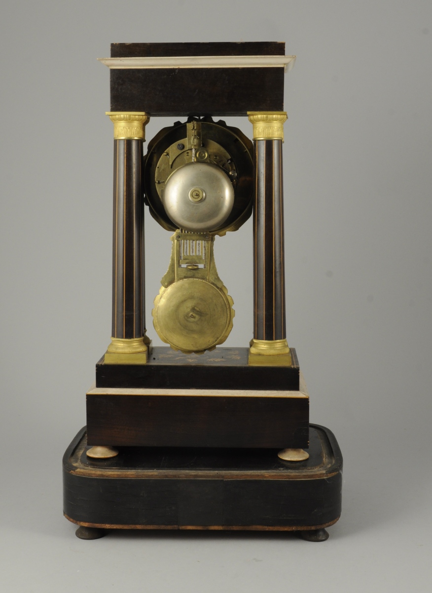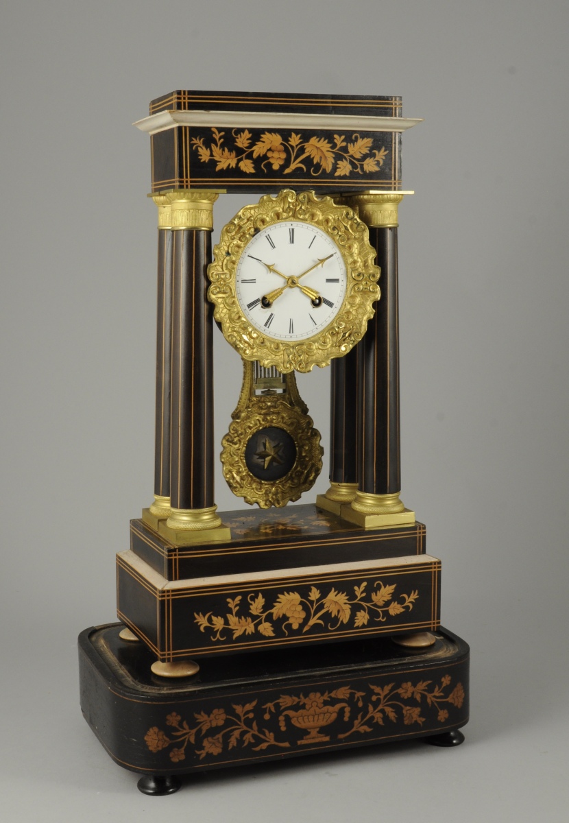 PENDULE PORTIQUE en forme de temple en bois noirci. Décor en marqueterie de bois clair de pampres et filets. Cadran émaillé blanc à chiffres romains bordé d'une frise en bronze ciselé, aiguilles en forme de flèches. Ornementation de bronzes dorés: chapiteaux et bases. Sur un socle à décor de panier fleuri et sous un globe de verre.