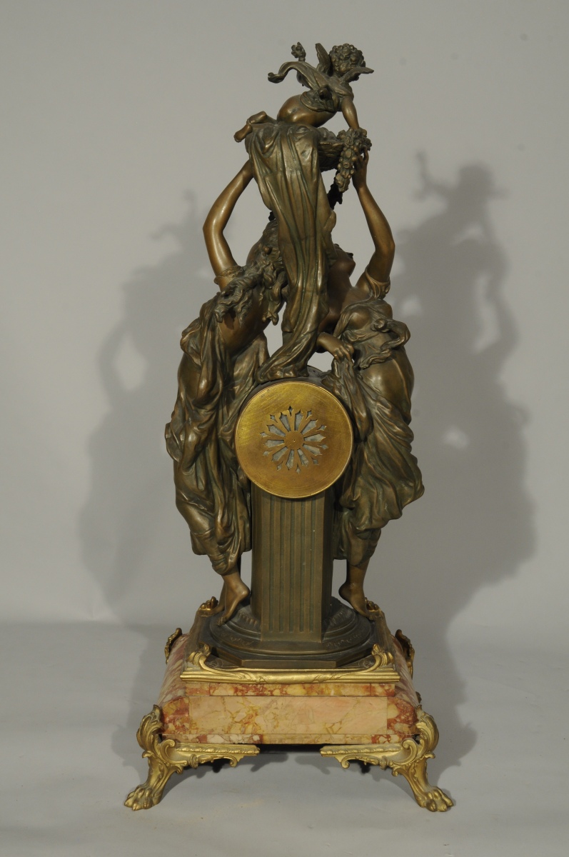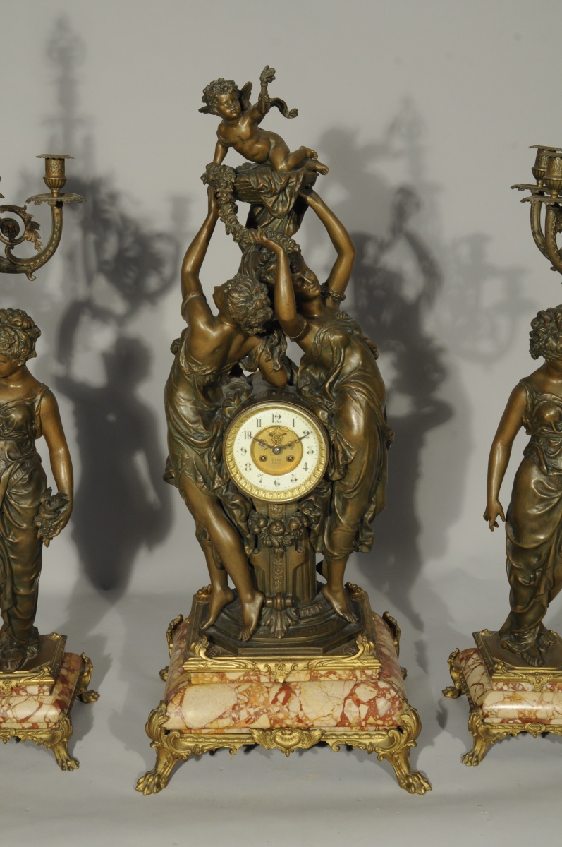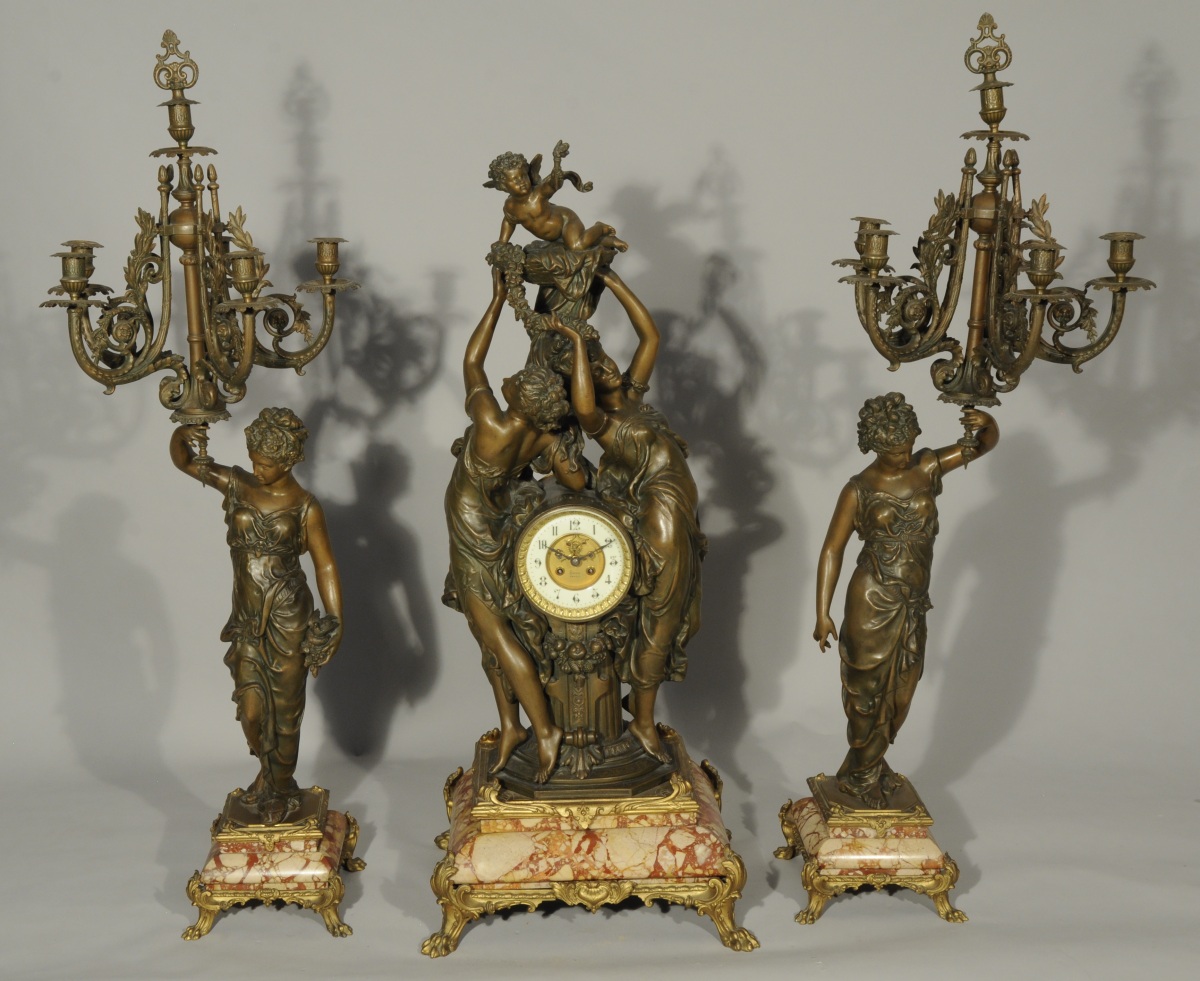 GARNITURE DE CHEMINÉE en régule comprenant une pendule figurant deux jeunes femmes vêtues à l'antique portant un putto et deux candélabres à cinq lumières ornés de rinceaux arborés par une jeune femme vêtue de même. Socle de marbre rouge à monture en régule ornée de rinceaux, coquilles et pattes de lions. Cadran émaillé signé Roux à Valence. XIXème.