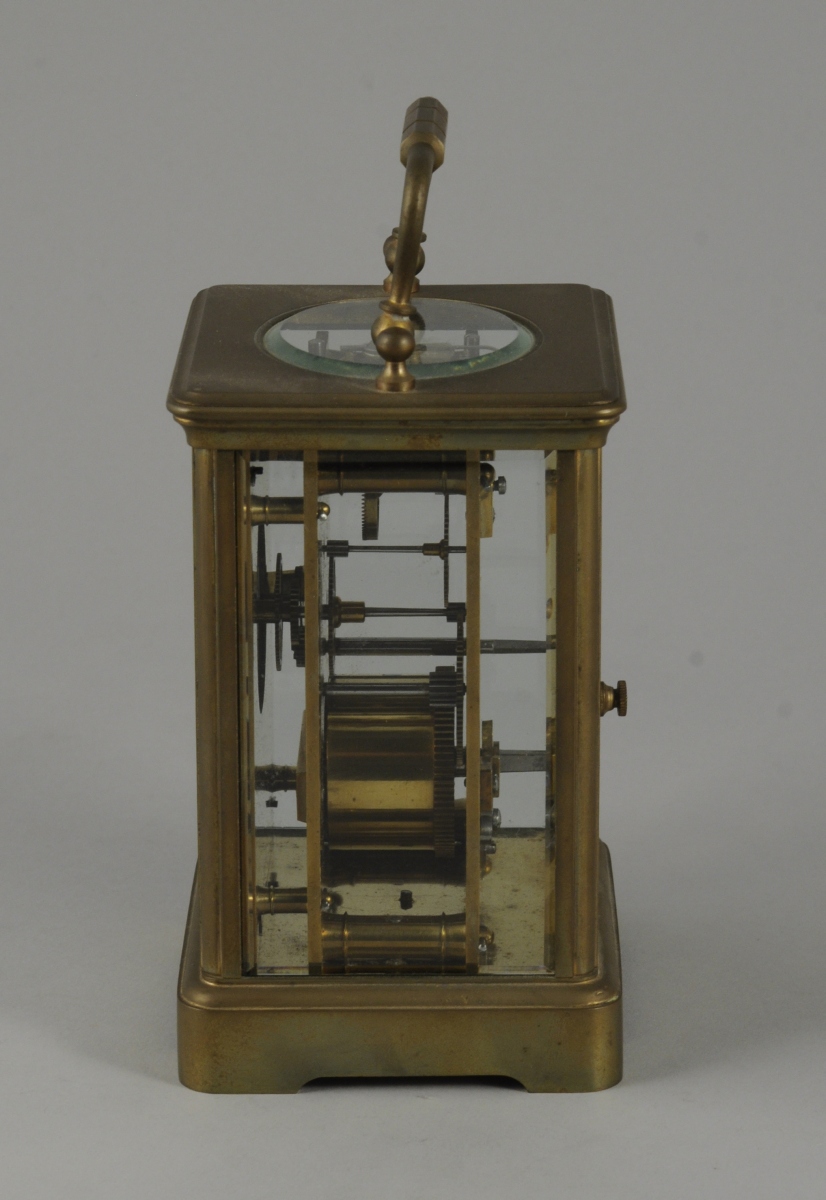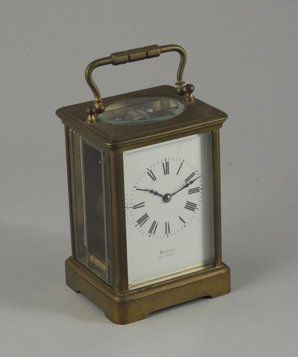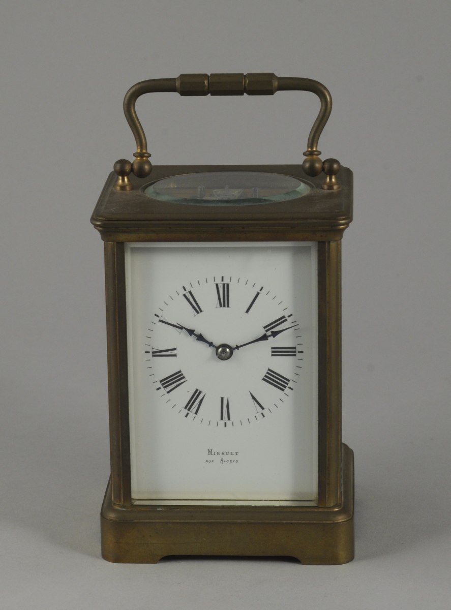 PENDULETTE D'OFFICIER en laiton. Cadran émaillé blanc, indiquant les heures en chiffres romains. Signée "Mirault aux Riceys".