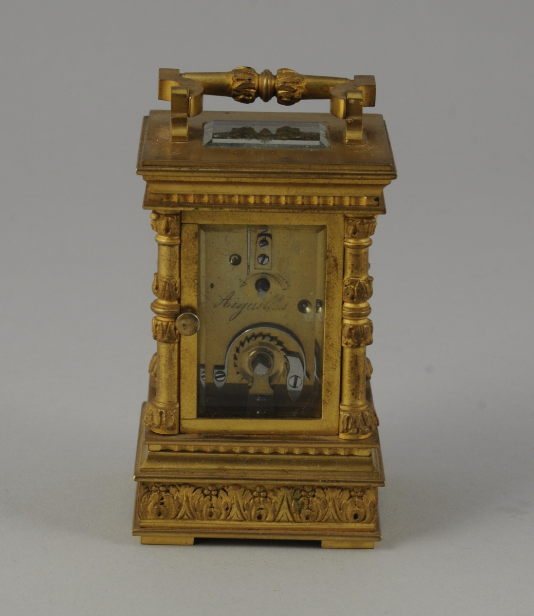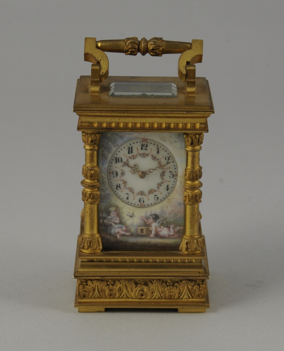 PENDULETTE D'OFFICIER en bronze ciselé et doré. Le cadran émaillé blanc indiquant les heures et les quarts en chiffres arabes orné de guirlandes de fleurs polychromes. Il s'incrit dans une plaque émaillée à décor polychrome figurant deux amours jouant avec un oiseau. Les côtés sont également garnis d'une plaque émaillée figurant pour l'un une jeune femme lisant et pour l'autre une jeune femme à la colombe. Montants à demi-colonnes engagées ornées de bagues feuillagées. La base ciselée d'une frise de feuilles d'acanthe stylisées. Panneaux vitrés en biseau, celui du sommet gravé d'une couronne de marquis. Dans son coffret en maroquin orné de croisillons et d'une couronne de marquis.