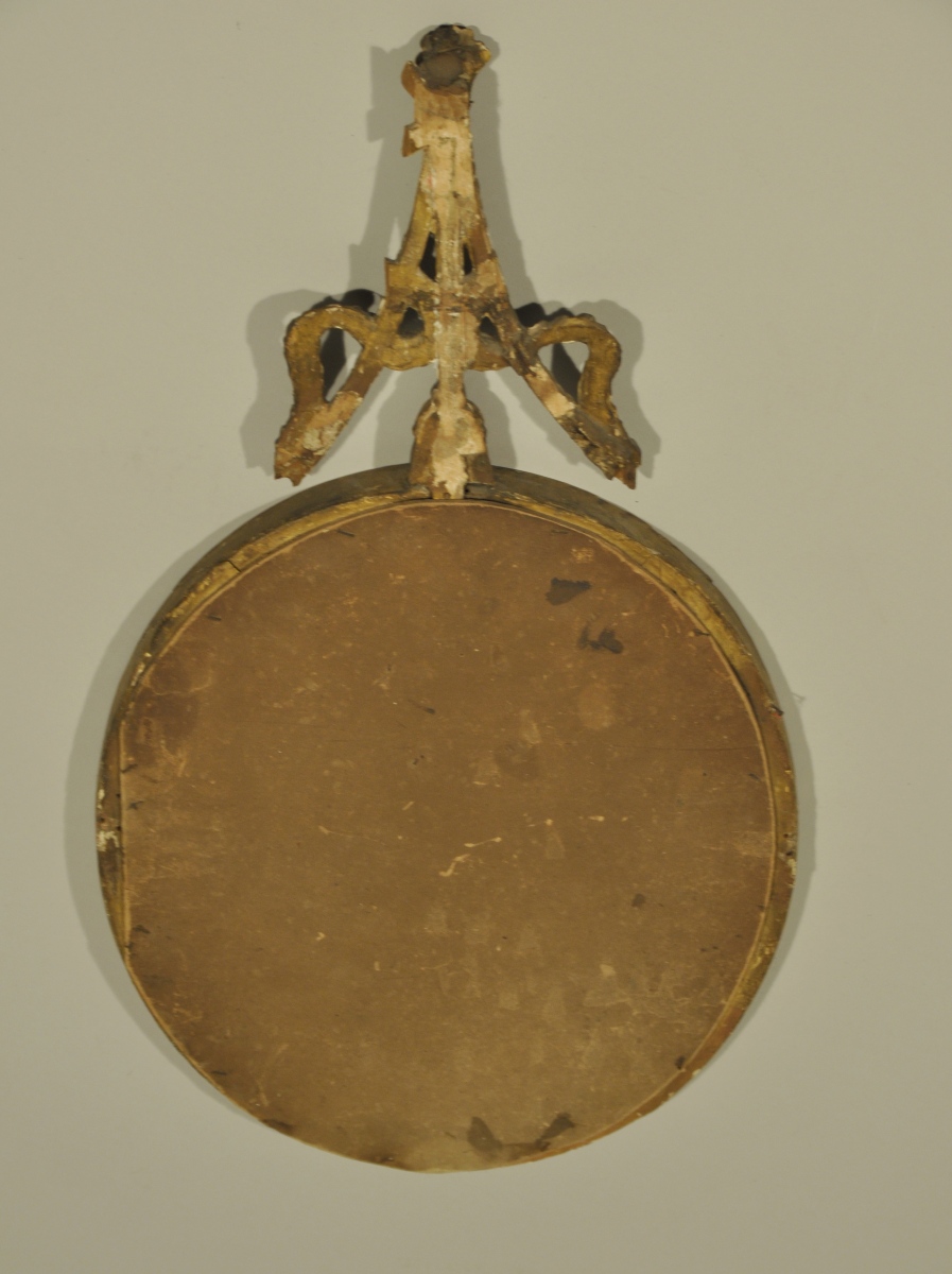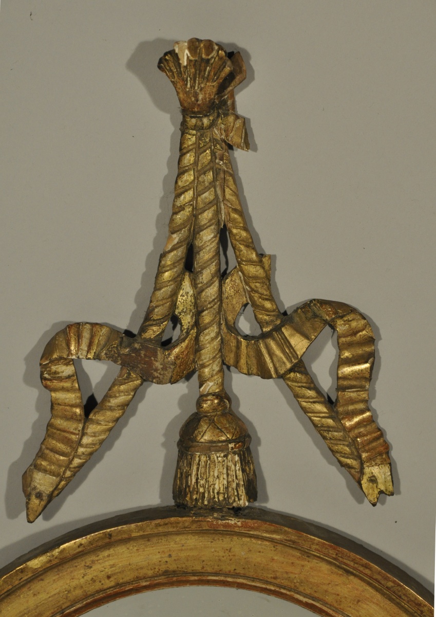 MIROIR ovale en bois stuqué et doré. Fronton à décor ajouré de cordes nouées, gland et coquille.