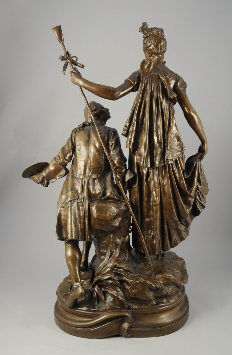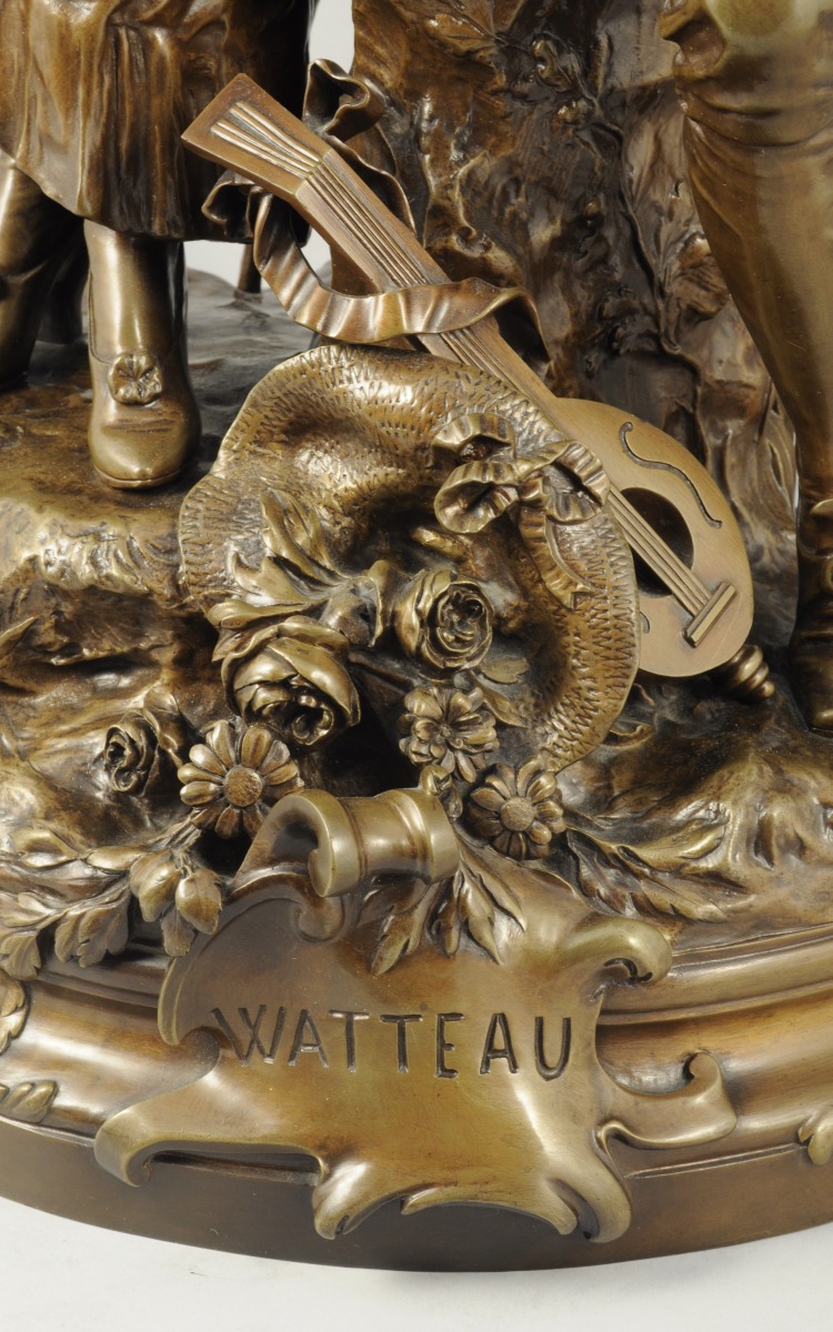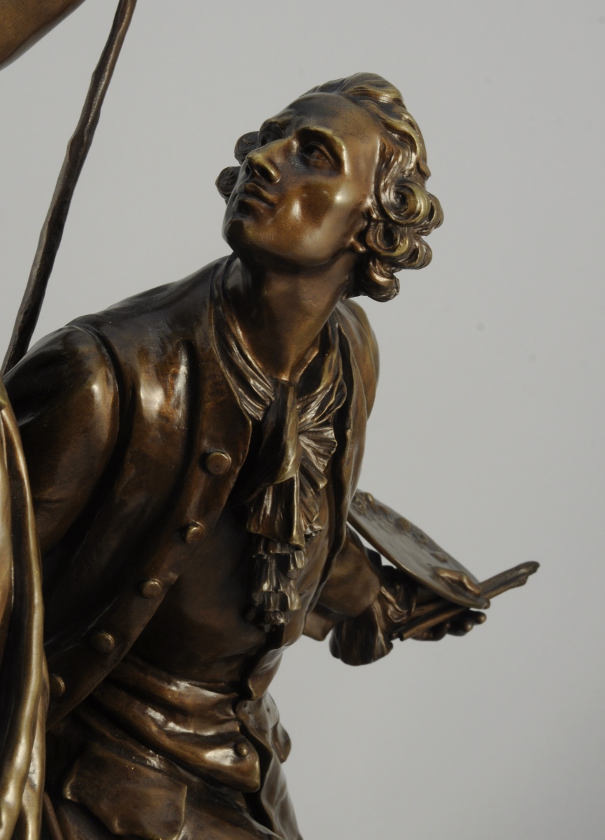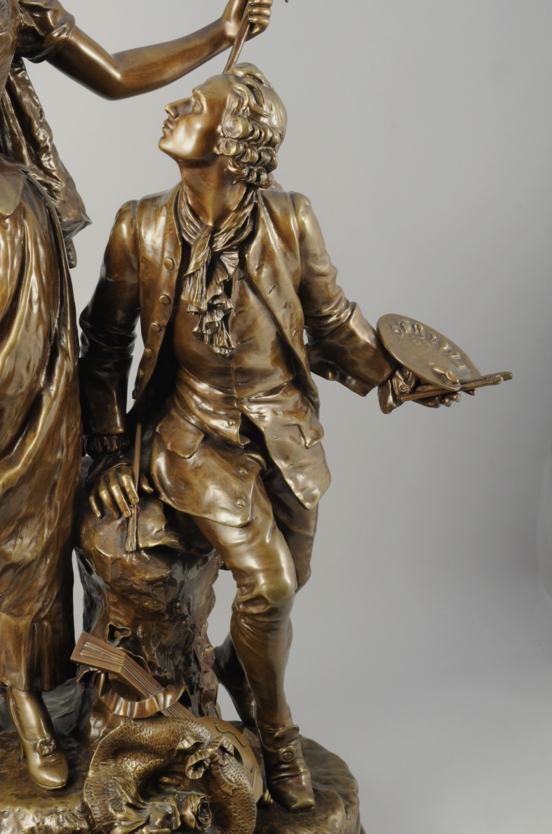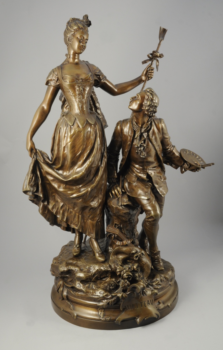 Élève de François Jouffroy à l'École des beaux-arts de Paris en 1862, Adrien Gaudez, peuple la France de Monuments à la mémoire de ses grands hommes. Ce modèle de Watteau fut créé en 1890 en hommage au célèbre peintre portraitiste de talent du XVIIIème siècle. Les dimensions exceptionnelles de ce bronze le font tutoyer la sculpture monumentale chère à l'oeuvre de Gaudez.
