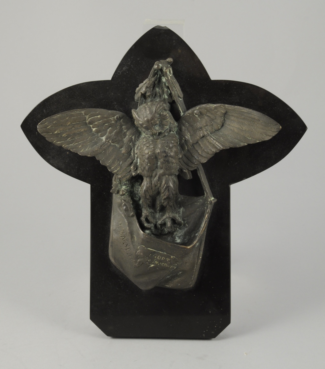 Bronze (?) ciselé à patine brune, titré et signé dans le décor "A. BARYE Fils. Sur une croix de marbre noir.