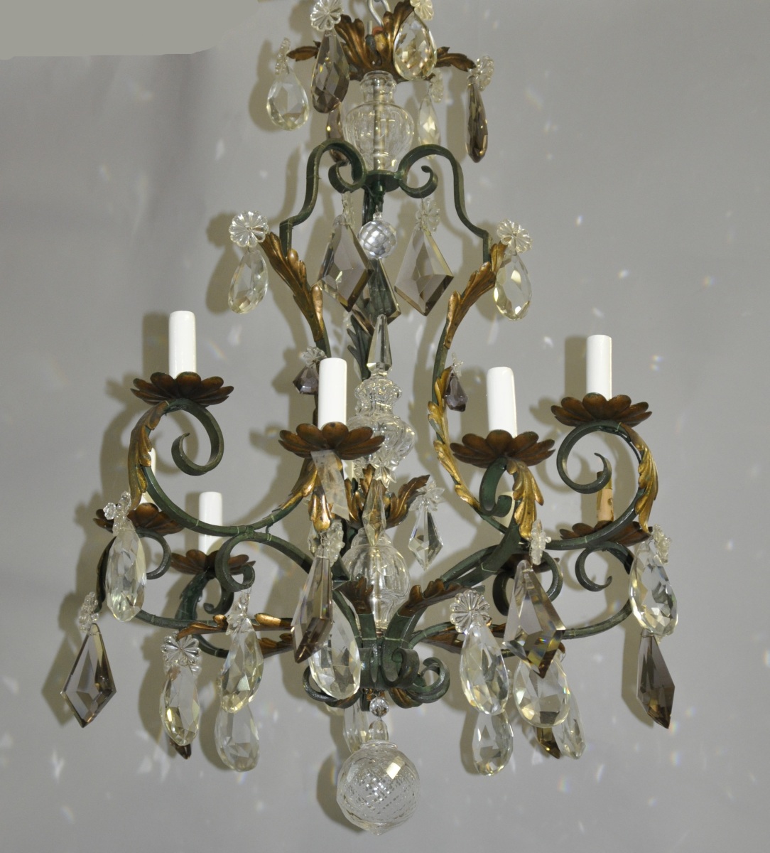 LUSTRE à neuf lumières, en fer forgé à patine verte et doré, orné de pampilles, de rosettes et d'une boule en cristal incolore et améthyste clair.