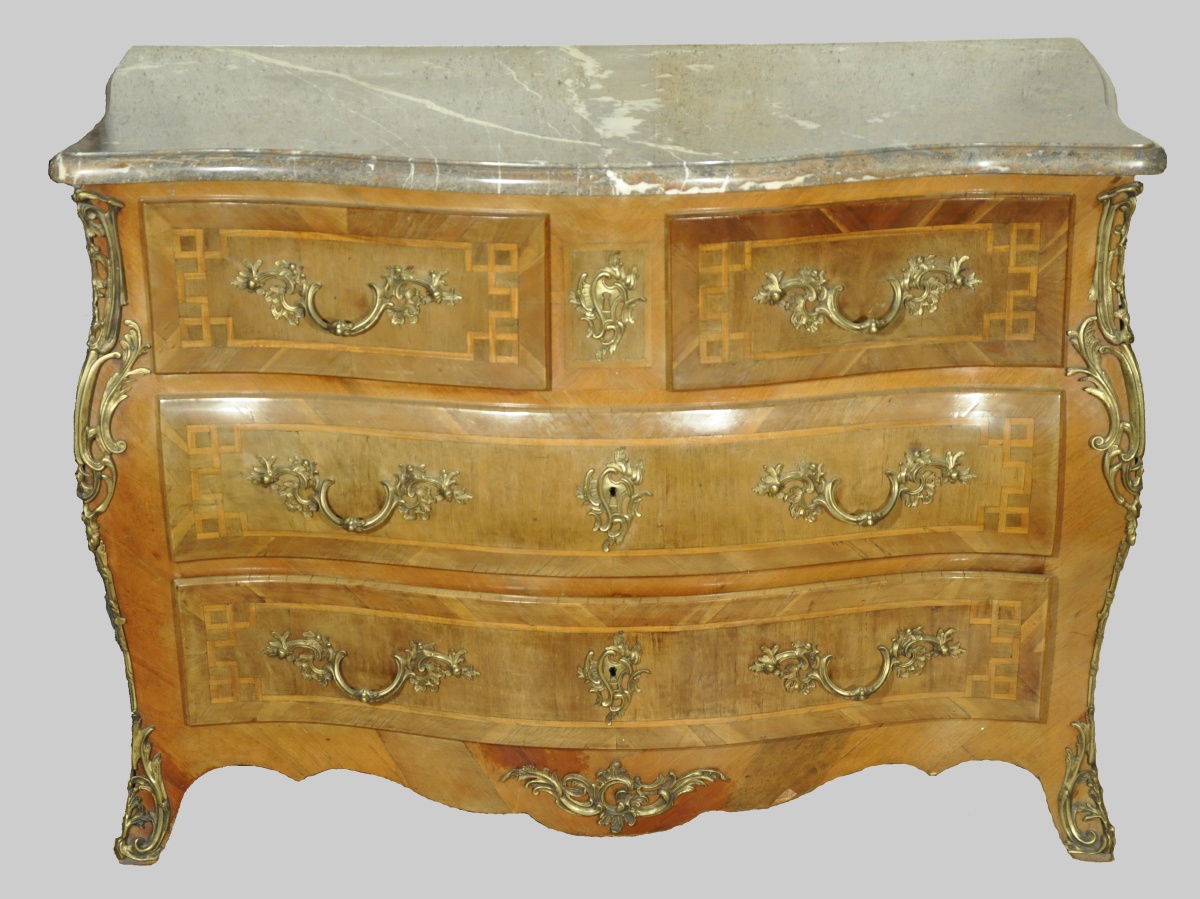 COMMODE galbée en bois de placage en frise ouvrant en façade par quatre tiroirs sur trois rangs. Décor de filets de bois clair. Garnitures de bronze ciselés et dorés: chutes d'angle, poignées de tirage, entrées de serrure et sabots. Dessus de marbre gris-rose.