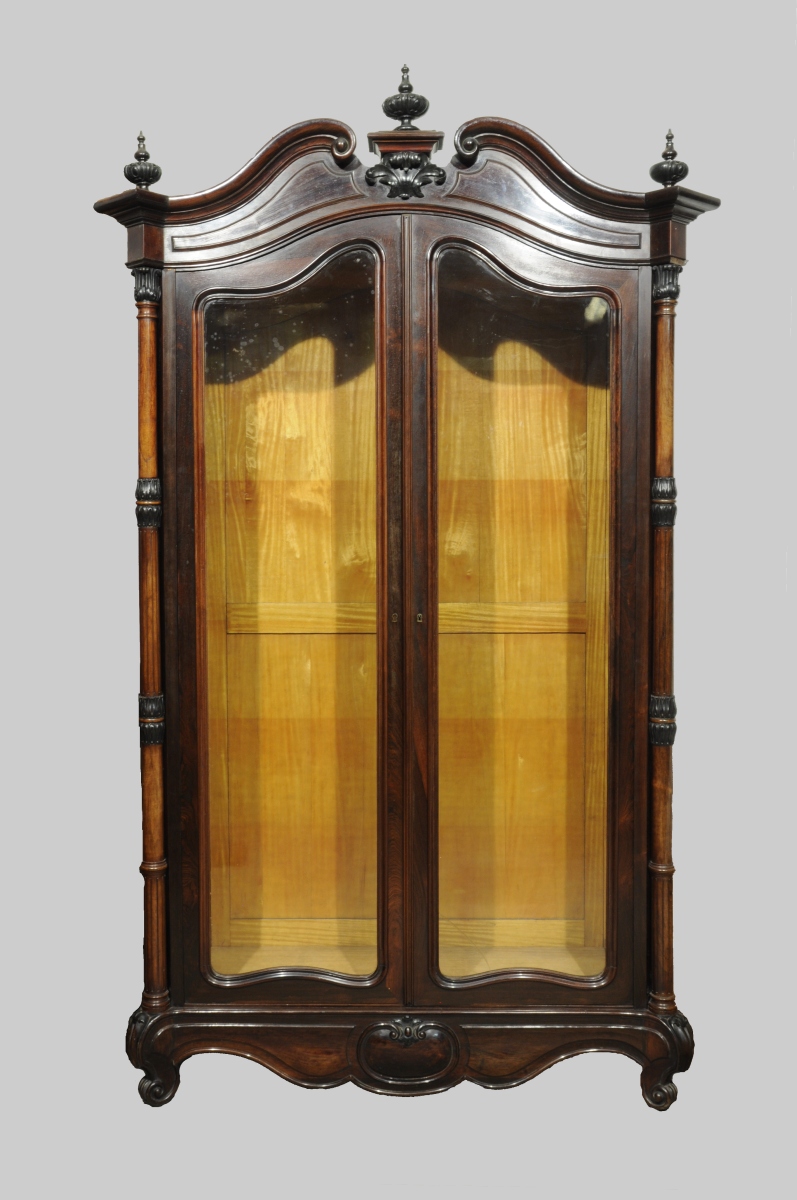 BIBLIOTHÈQUE en bois mouluré, sculpté et teinté. Elle ouvre à deux vantaux partiellement vitrés. L'intérieur plaqué de bois de citronnier. Corniche en forme de volutes affrontées centrées d'une feuille d'acanthe, elle-même sommée d'un entablement. Montants à colonnes détachées moulurées et sculptées. Traverse mouvementée ornée d'agrafes et d'une feuille d'acanthe. Pieds cambrés se terminant en volute.