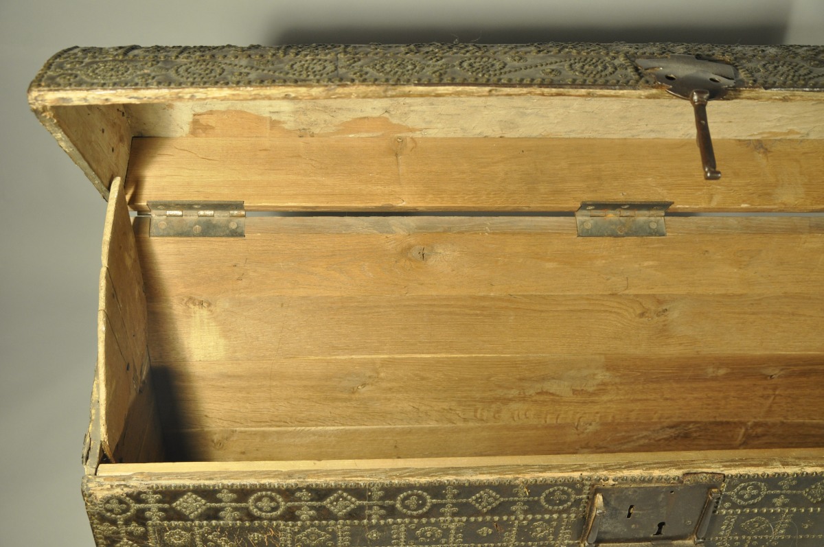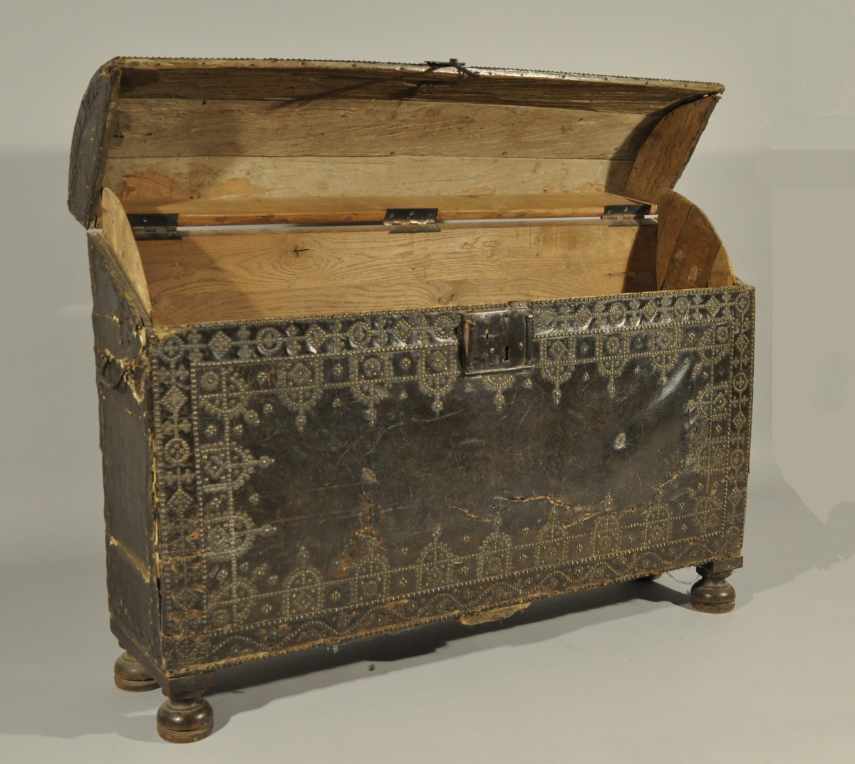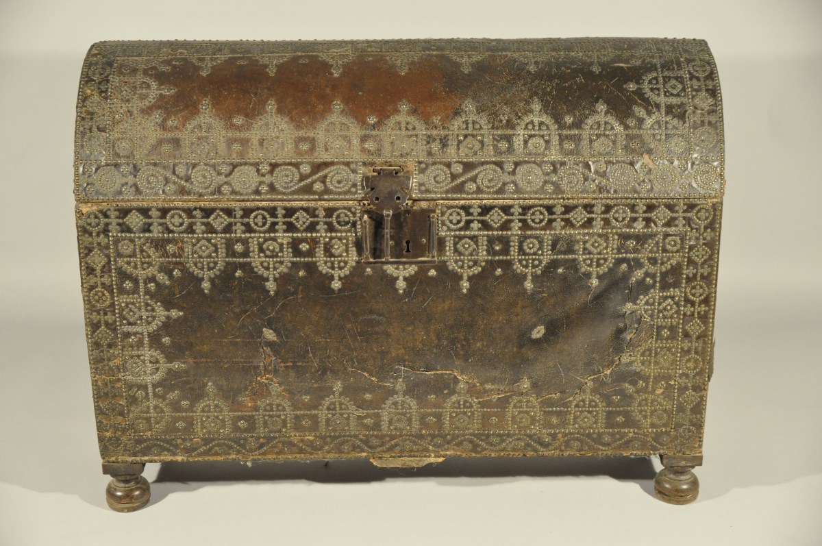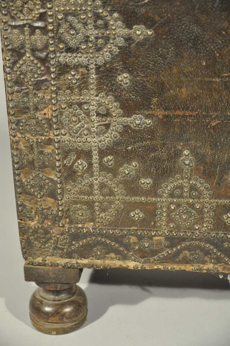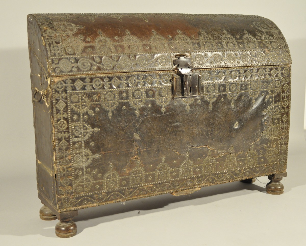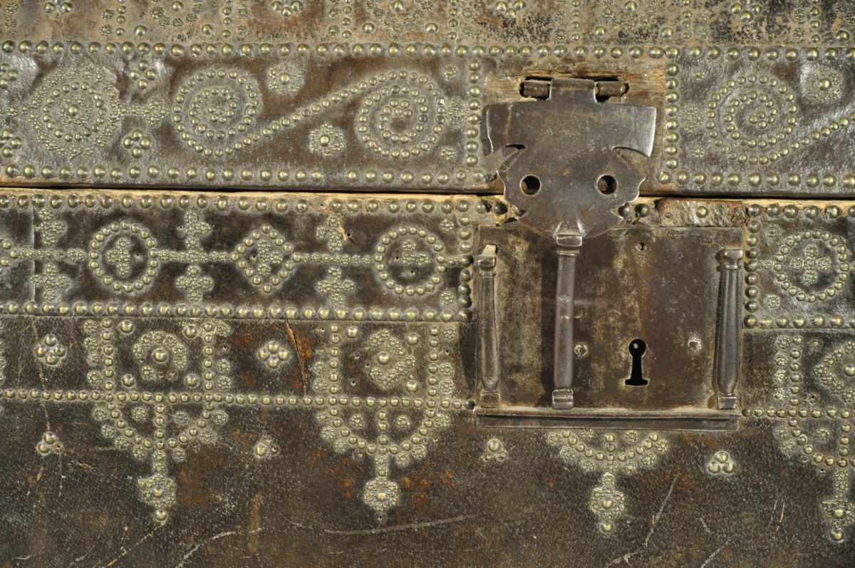 COFFRE en bois gainé de cuir clouté. Poignées latérales en métal. serrure à moraillon.
