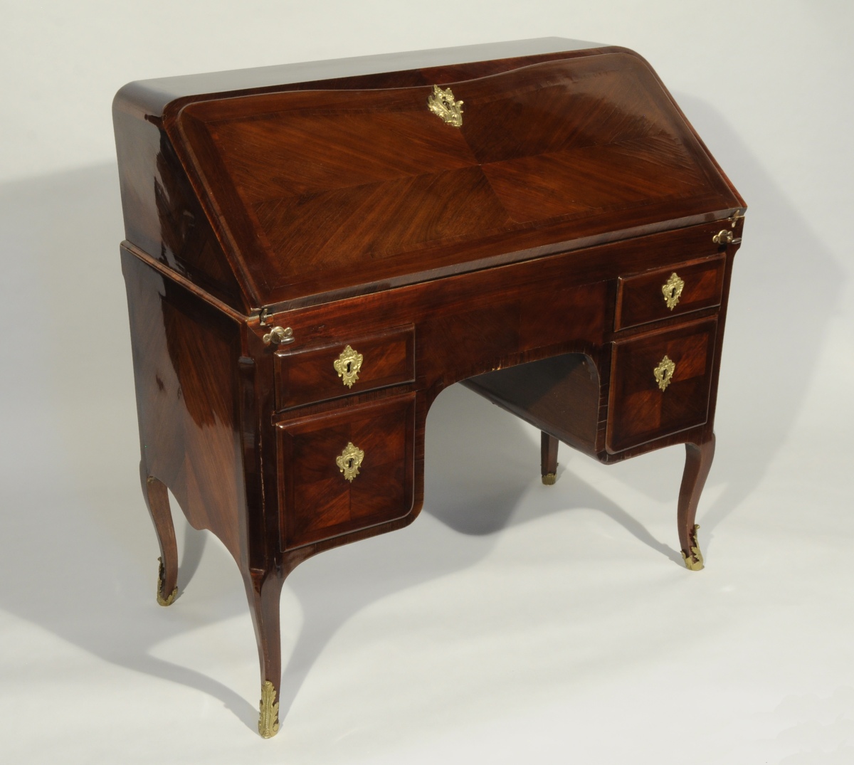 Reçu maître vers 1725-1730, Pierre II Migeon (1701-1758) appartient à une grande famille protestante d'ébénistes sous le règne de Louis XV. Pierre Kjellberg explique ainsi la prospérité de l'atelier: "Les oeuvres qui en sont sorties révèlent toutes un goût très sur, des formules souvent originales et caractéristiques, ainsi qu'un grand souci de la qualité" (in "Le mobilier Français du XVIIème siècle", éd. de l'Amateur, Paris, 1989, p. 570). Les Migeons livrent une riche clientèle aristocratique en France et en Europe, comme le duc d'Orléans, la Marquise de Pomadour mais aussi les gardes meubles de la Couronne et des Menus Plaisrs. La prédilection de Pierre II pour les vastes panneau de placage l'incite à privilégier les formes pleines, comme pour notre bureau de pente.