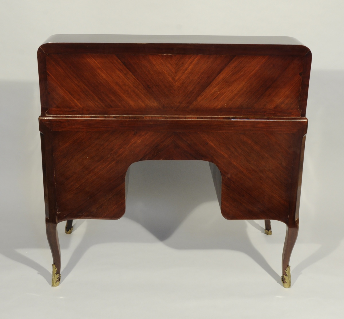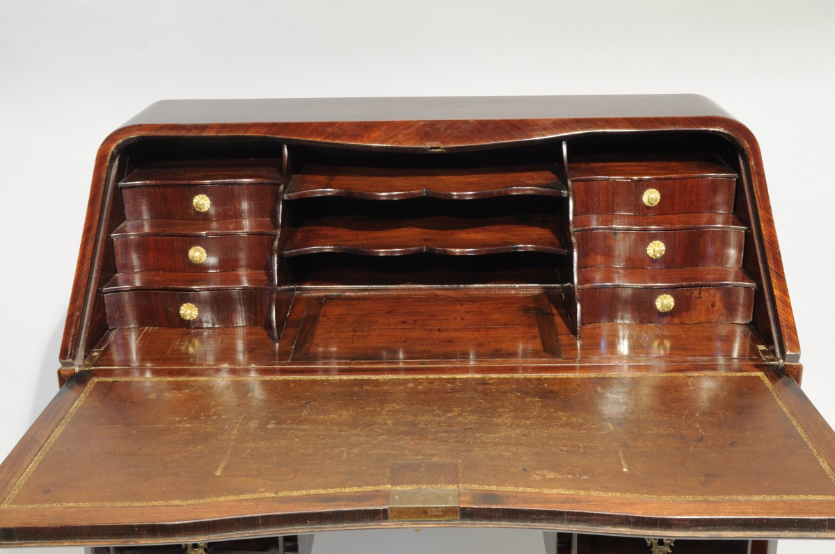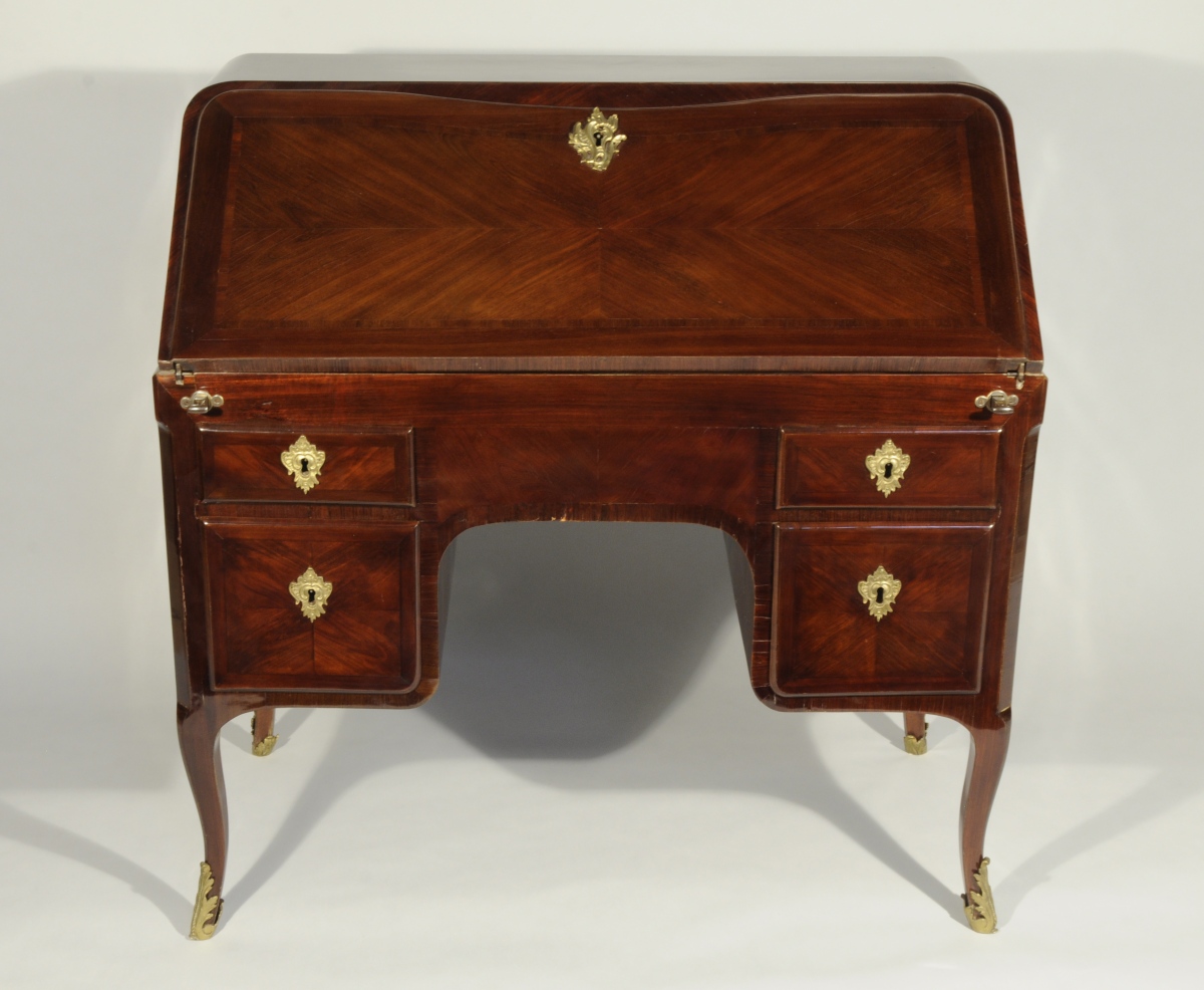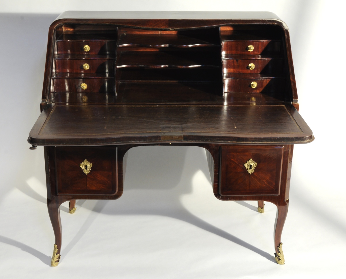 BUREAU DOS D'ÄNE en placage de palissandre, toutes faces, ouvrant en façade par un abattant et quatre tiroirs dans deux caissons. La marqueterie de l'abatant est frisée en aile de papillon. L'intérieur formant écritoire est foncé d'un cuir fauve. L'abattant reposant sur deux tirettes métalliques découvre cinq casiers, six tiroirs galbés en gradins et, dans sa partie centrale, un double fond secret. Le tiroir inférieur du caisson droit dissimule un coffre-fort, fermé par une serrure à trois points. Le bureau repose sur quatre pieds cambrés, dont les montants supérieurs sont pans coupés. Estampille sous le caisson droit MIGEON.