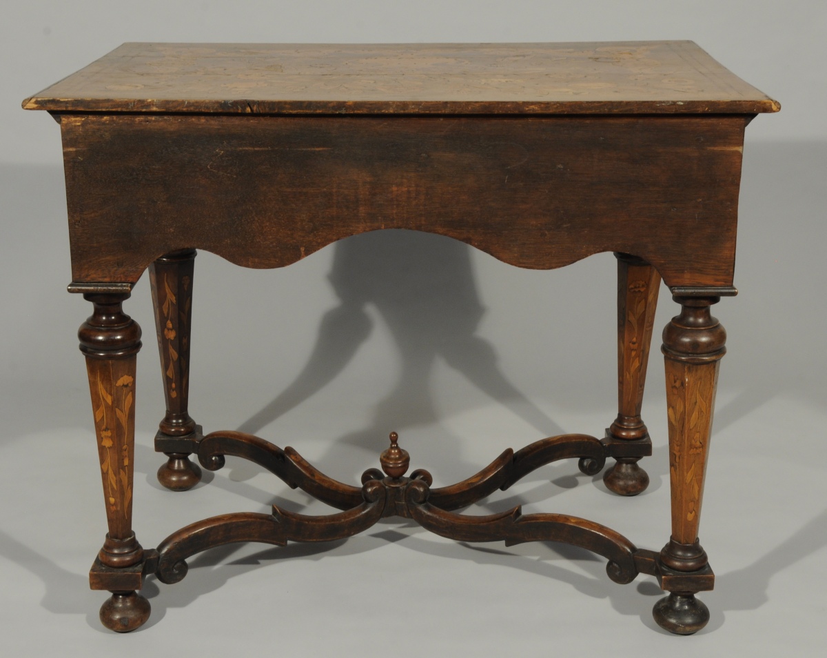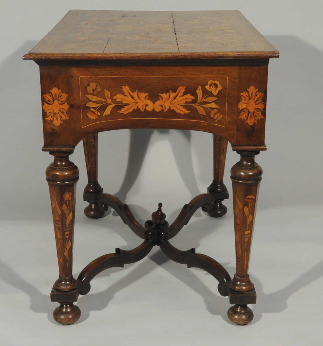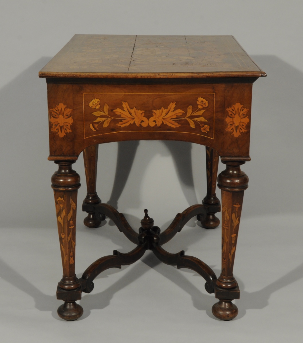 TABLE-BUREAU de forme rectangulaire en noyer à décor d'une riche marqueterie florale dite "jasmin". Elle ouvre en façade par trois tiroirs en ceinture, cette dernière de forme chantournée. Le plateau est orné d'un vase fleuri et d'oiseaux posés sur des rinceaux feuillagés. Elle repose sur quatre pieds ballustres à pans coupés réunis par une entretoise en X marquetée. Garniture de laiton en entrée de serrure et boutons de tirage goutte. Travail ancien dans le goût des productions flamandes du XVIIème.