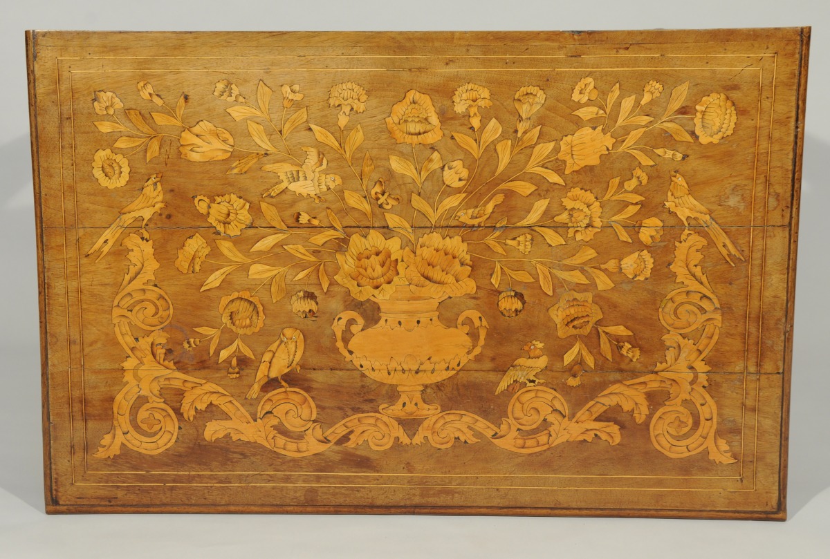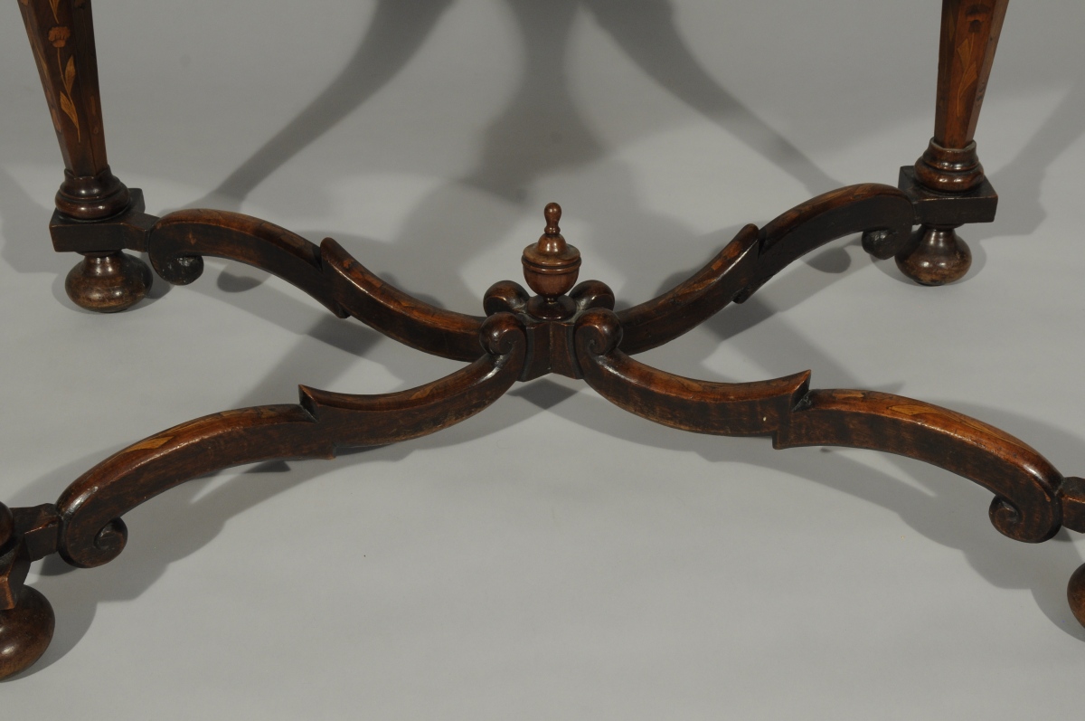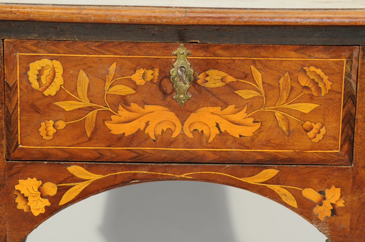 TABLE-BUREAU de forme rectangulaire en noyer à décor d'une riche marqueterie florale dite "jasmin". Elle ouvre en façade par trois tiroirs en ceinture, cette dernière de forme chantournée. Le plateau est orné d'un vase fleuri et d'oiseaux posés sur des rinceaux feuillagés. Elle repose sur quatre pieds ballustres à pans coupés réunis par une entretoise en X marquetée. Garniture de laiton en entrée de serrure et boutons de tirage goutte. Travail ancien dans le goût des productions flamandes du XVIIème.