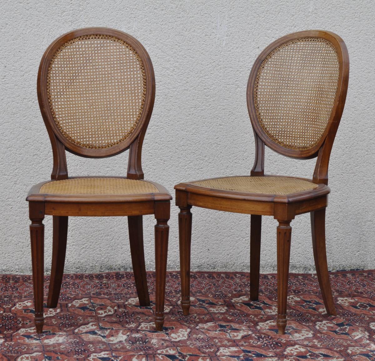 PAIRE DE CHAISES cannées à dossier médaillon en noyer mouluré. Pieds antérieurs cannelés et pieds postérieurs en sabres. Ceinture et dossier reçoivent une ornementation de filets marquetés de bois clair.