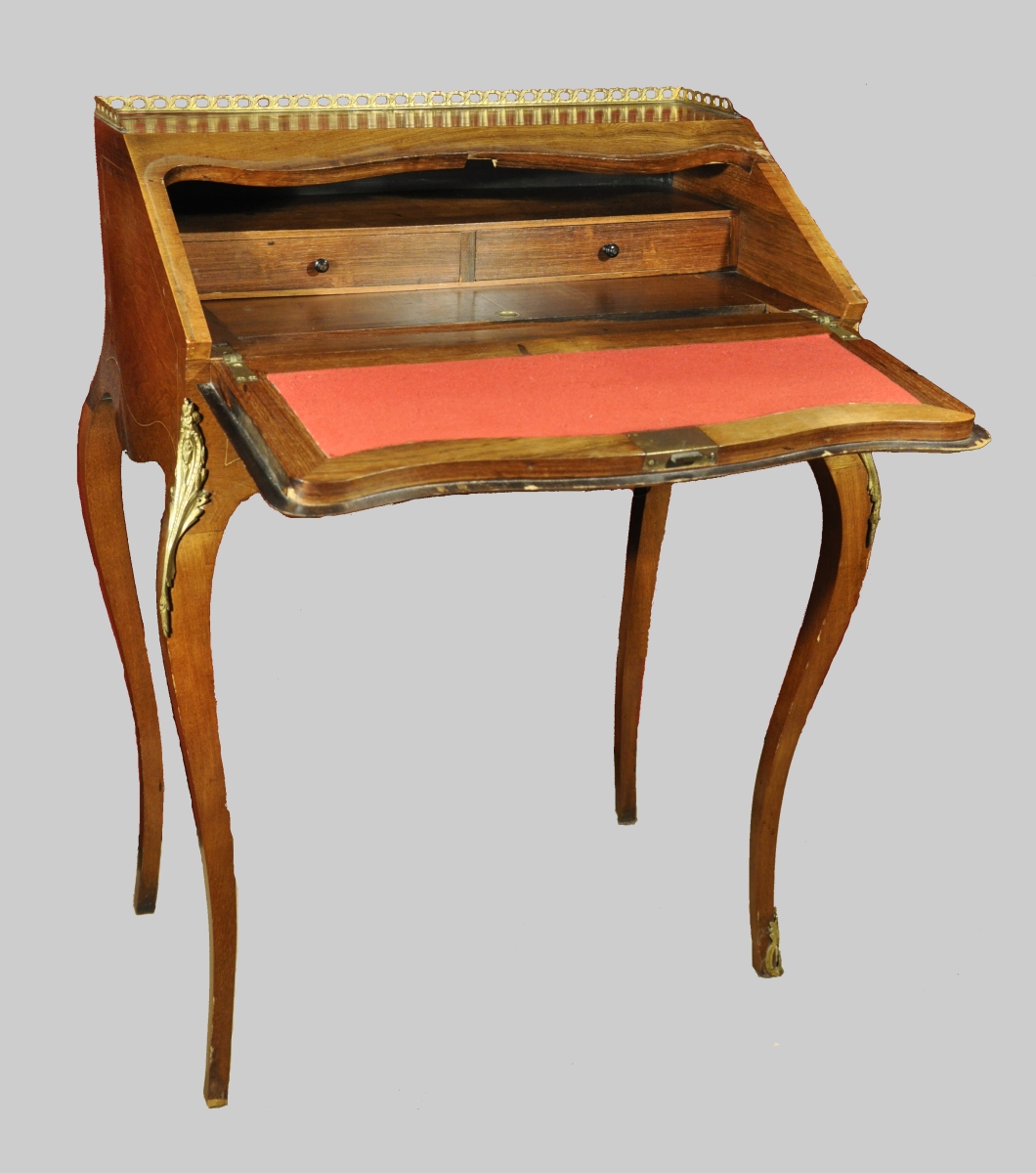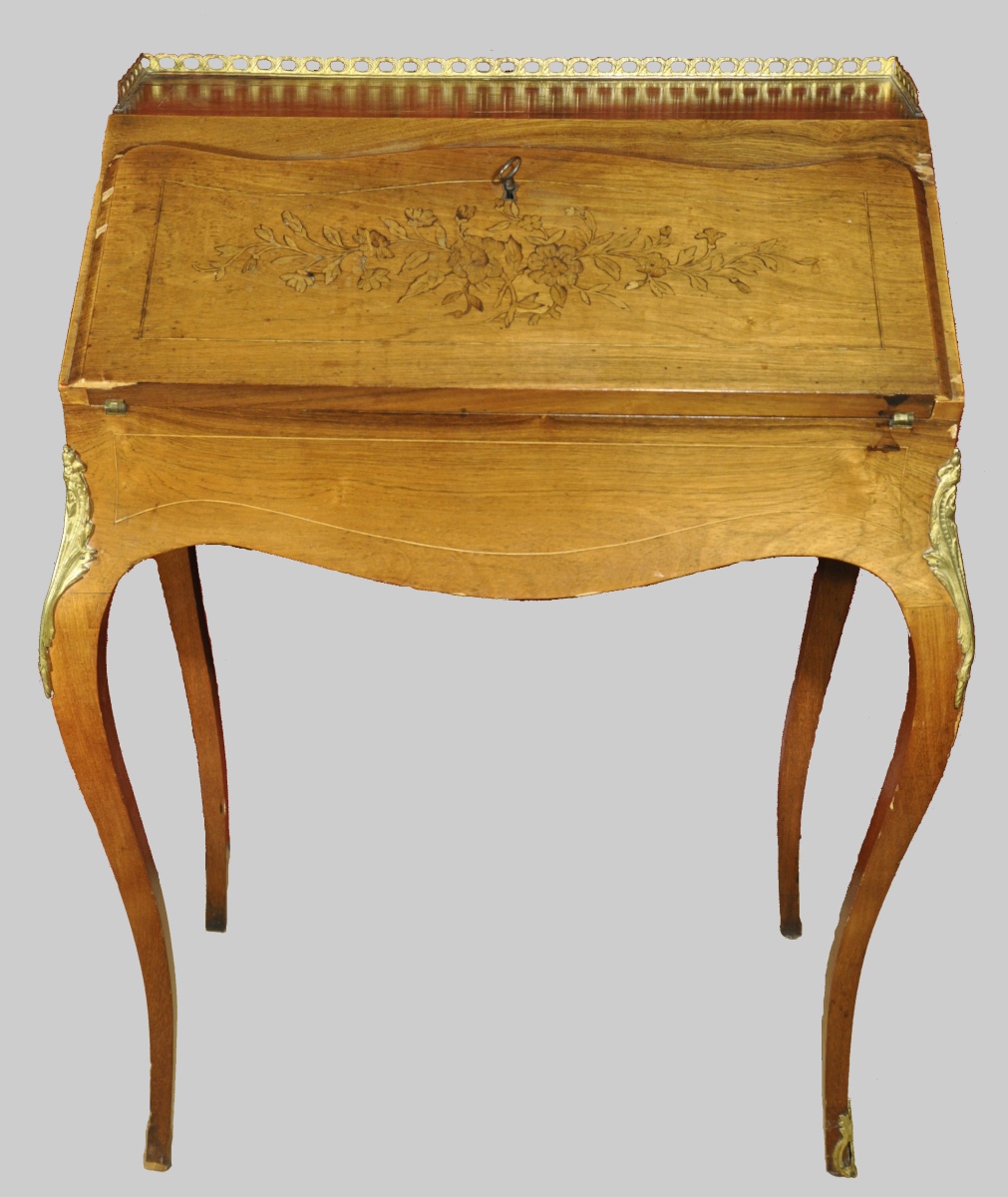 BUREAU de PENTE en noyer et bois de placage. Repose sur quatre pieds galbés. Ornementation de bronzes ciselés et dorés tels que chutes, sabots et galerie ajourée. L'abattant recevant une marqueterie florale et ouvre sur un casier, deux tiroirs et un coffre, l'intérieur garni d'un feutre rouge. Style Louis XV, fin XIXème - début XXème.