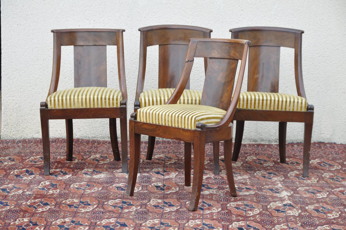 SUITE de quatre CHAISES à dossier gondole en acajou et placage d'acajou. Elles reposent sur quatre pieds sabres. L'amortissement des pieds antérieurs sculpté d'une volute.