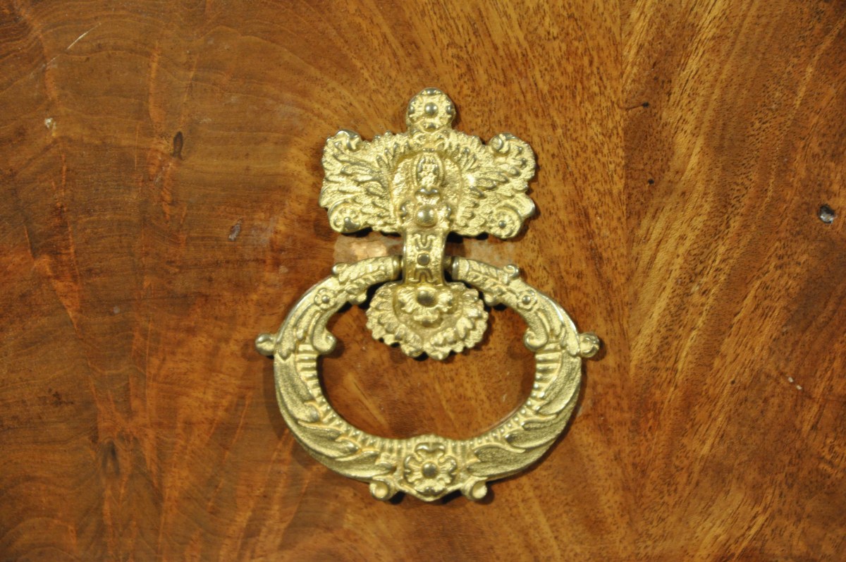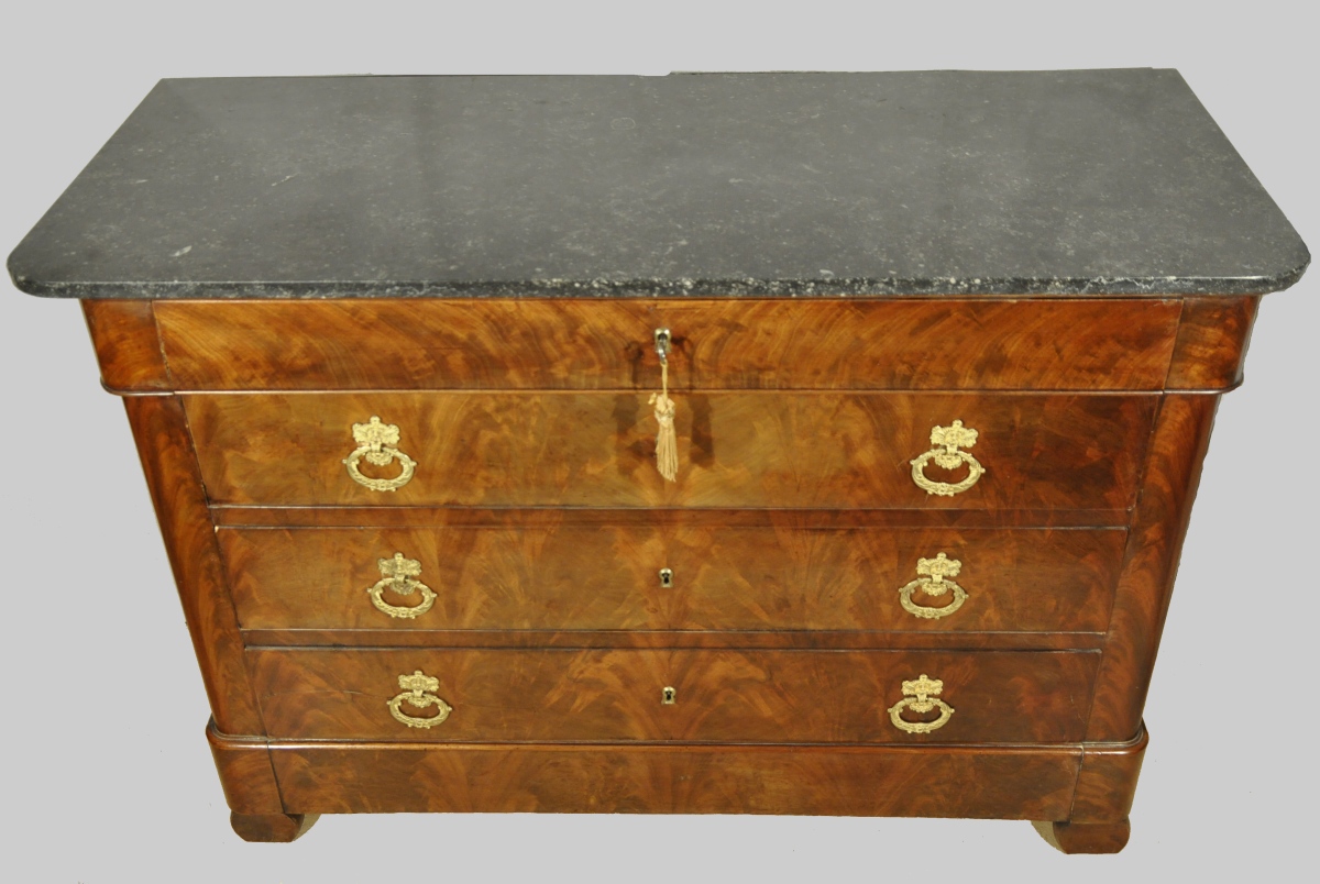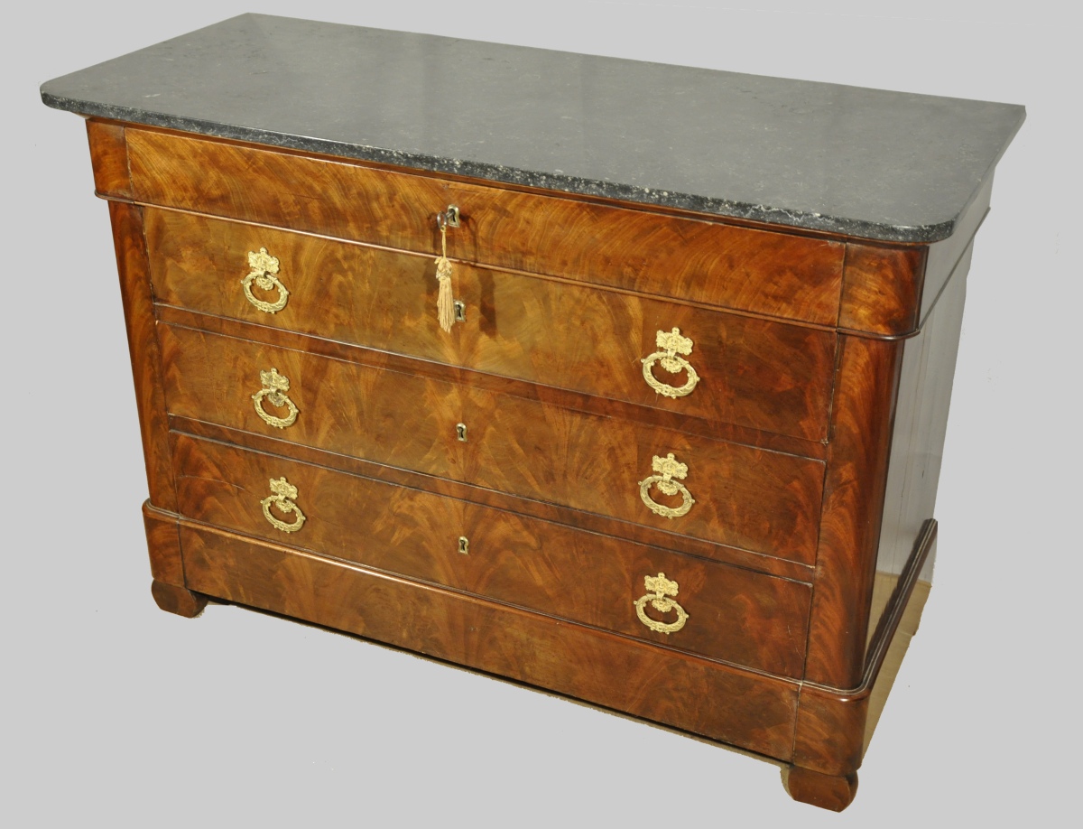 COMMODE en placage d'acajou. Elle ouvre à quatre tiroirs. Garniture de bronzes dorés: anneaux de tirages et entrées de serrures. Dessus de marbre gris.