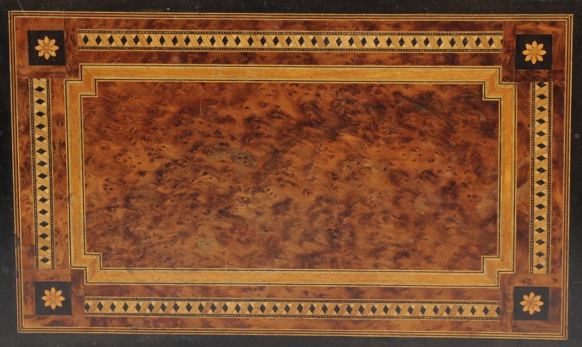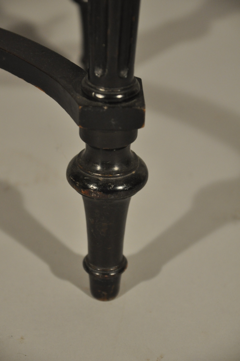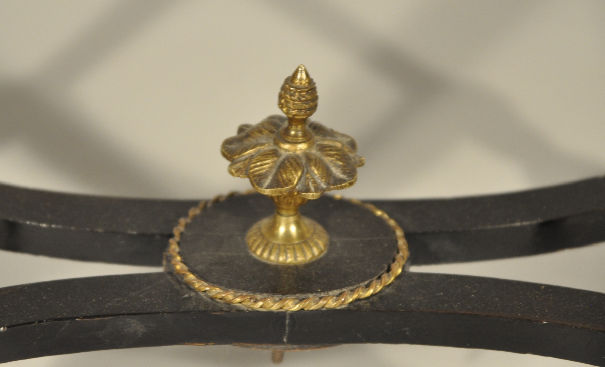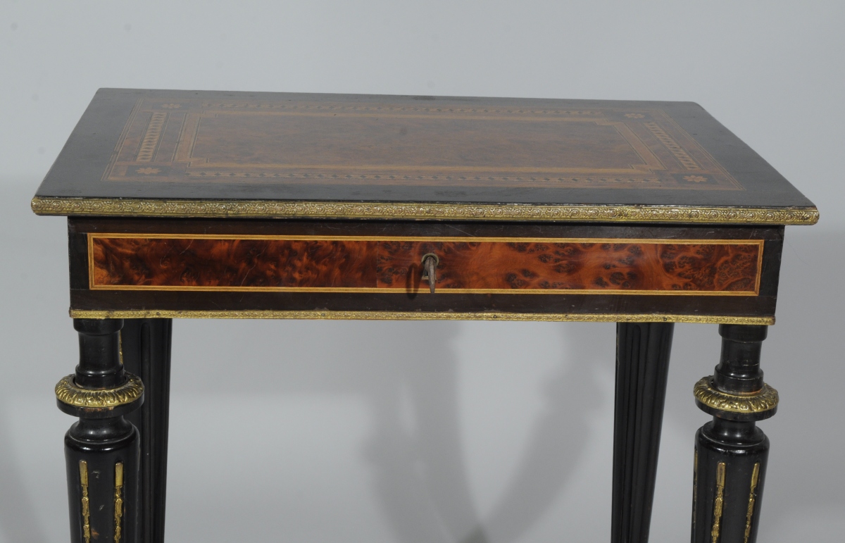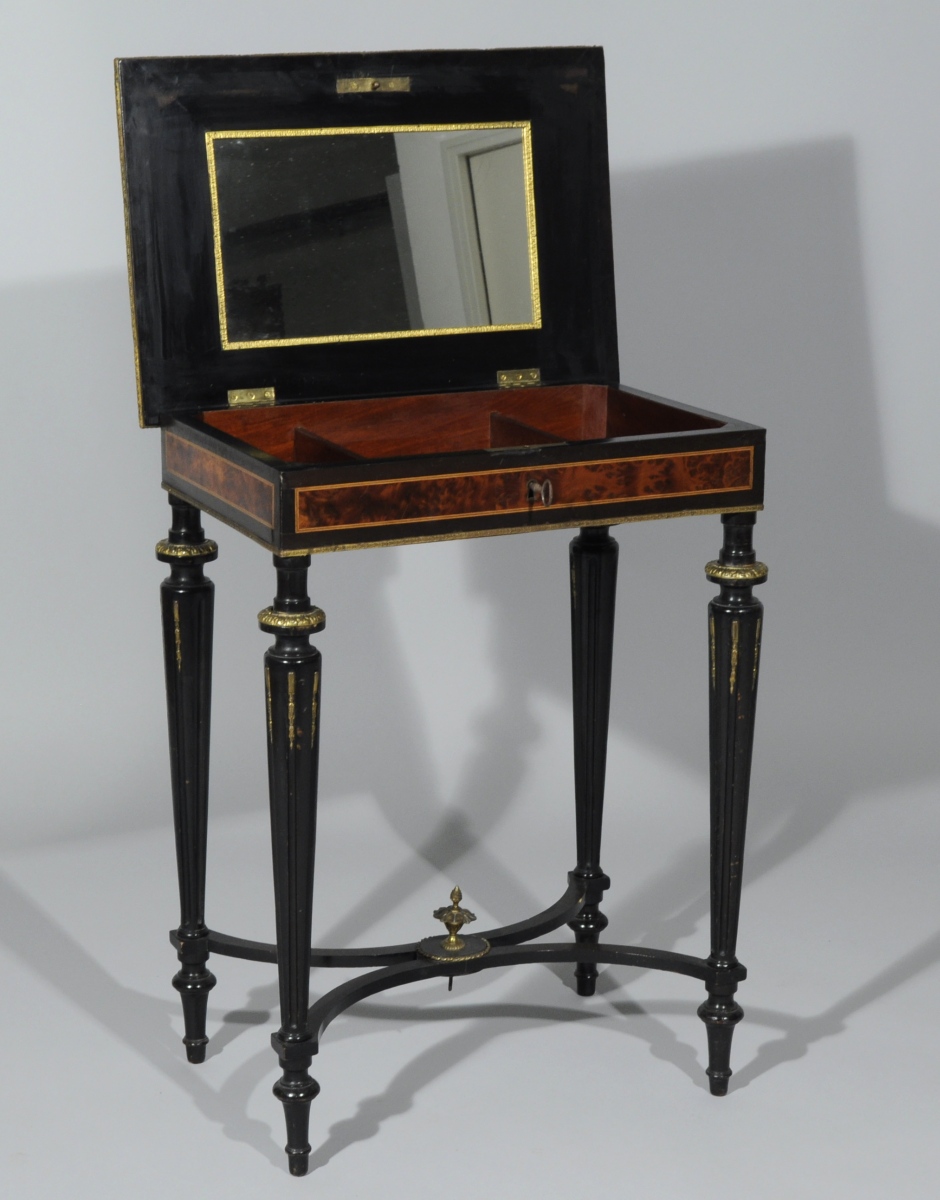 TABLE TRAVAILLEUSE en bois noirci, bois de loupe et bois de placage. Elle ouvre à un abattant découvrant un miroir et trois casiers. Plateau marqueté. Pieds fuselés et cannelés réunis par une entretoise en X. Ornementation de bronzes dorés: lingotière, bagues, cannelures et graine.