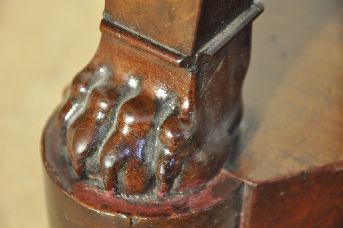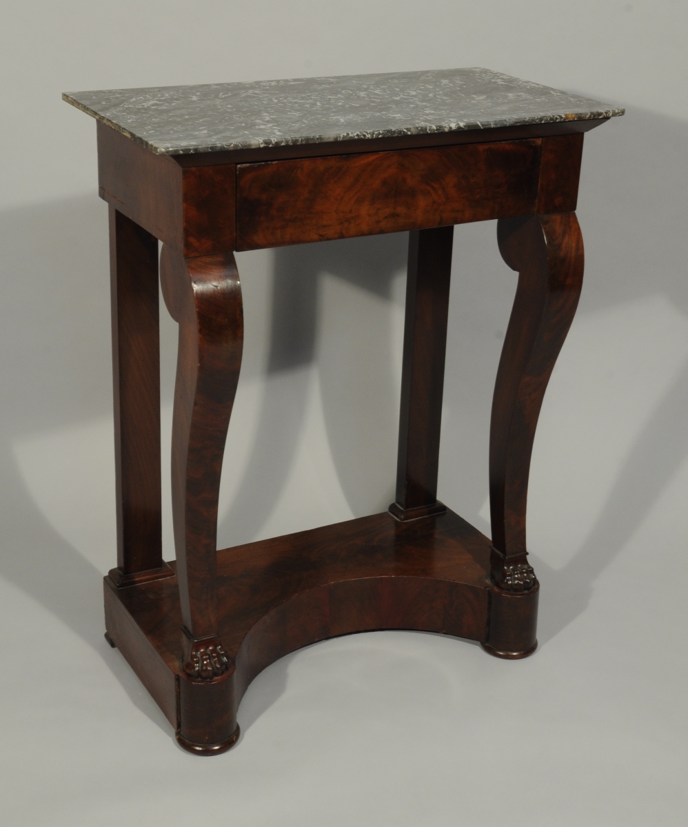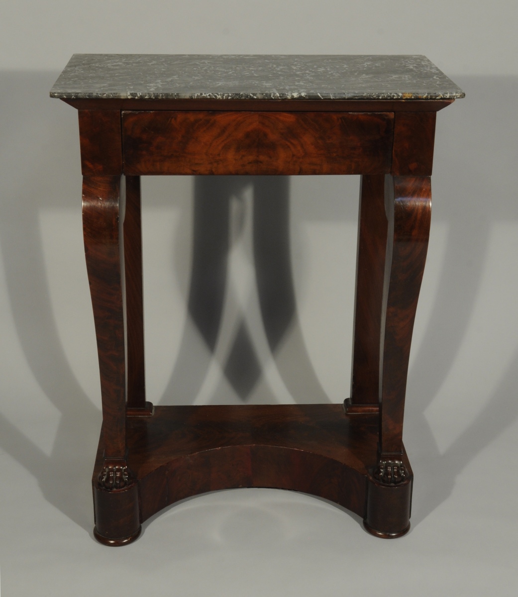 CONSOLE acajou et placage d'acajou ouvrant par un tiroir en ceinture. Pieds antérieurs cambrés terminés en griffes de lion, pieds postérieurs droits. Entretoise à la façade cintrée. Dessus de marbre gris Saint-Anne.