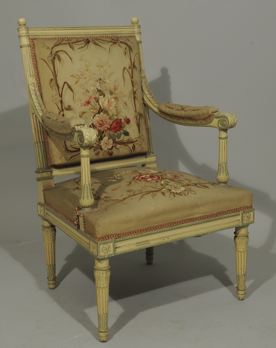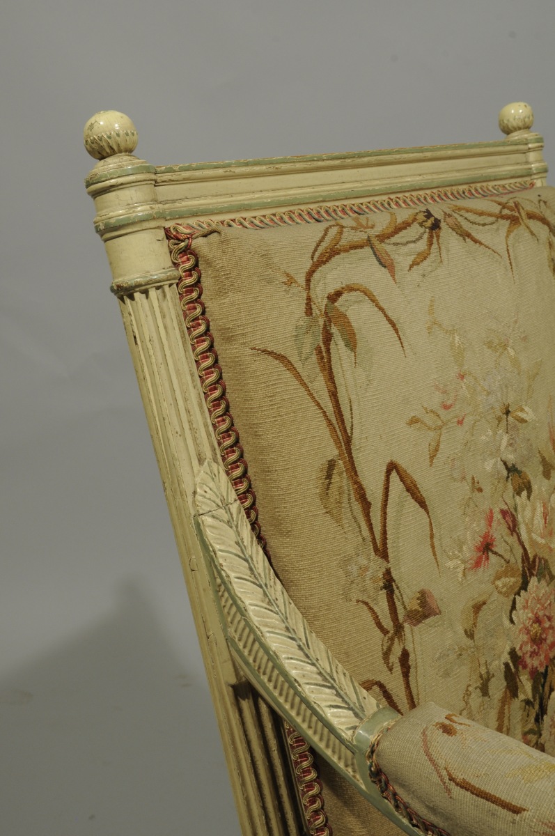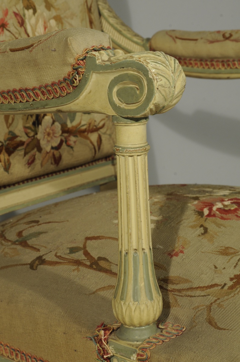FAUTEUIL À LA REINE en bois mouluré, sculpté et rechampi vert et crème. Dossier plat orné de grenades à l'amortissement des montants. Accotoirs ornés de feuilles d'eau se terminant en volutes, et reposant sur des consoles en balustres cannelées et rudentées. Dés de raccordement sculptés de fleurons. Pieds fuselés, cannelés et rudentés, ornés de feuilles d'eau. Garniture de tapisserie aux bouquets fleuris et guirlandes de feuillages.