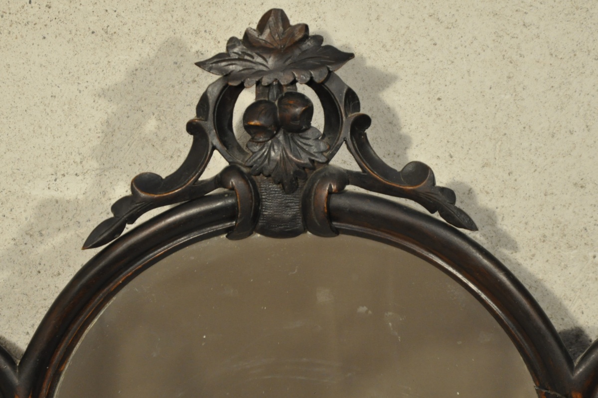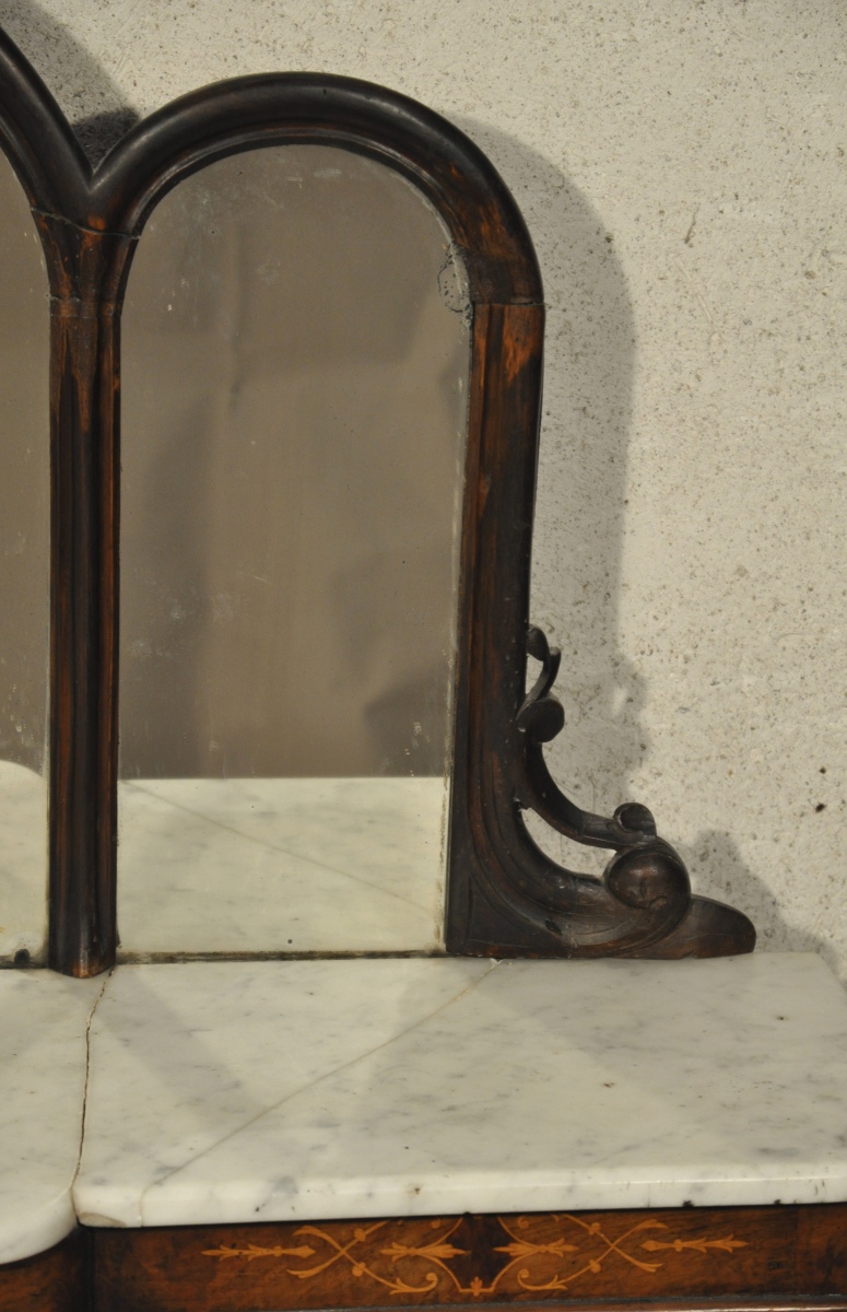 COIFFEUSE à ressaut central en noyer et placage de noyer mouluré et marqueterie de bois clair. Elle ouvre à deux vantaux vitrés encadrant un miroir, lui-même accosté par deux colonnes détachées en bois tourné. Elle est sommée d'un miroir triple à décor sculpté et ajouré de rinceaux, fruits et feuillages. Dessus de marbre blanc.