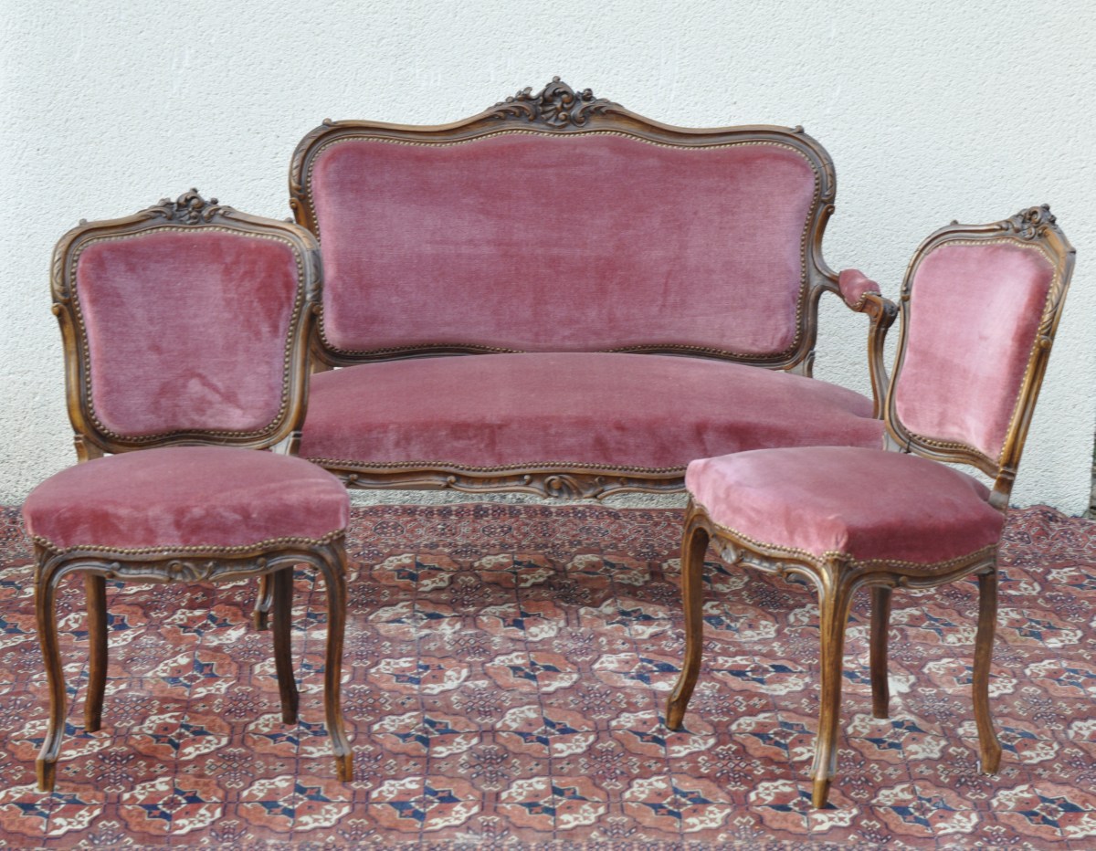 SALON en noyer mouluré et sculpté de roses, rinceaux, coquilles et feuillages stylisés. Pieds cambrés terminés par un enroulement.