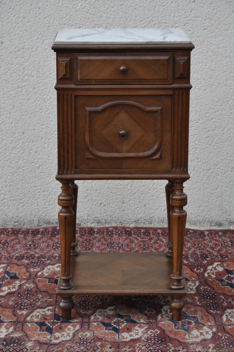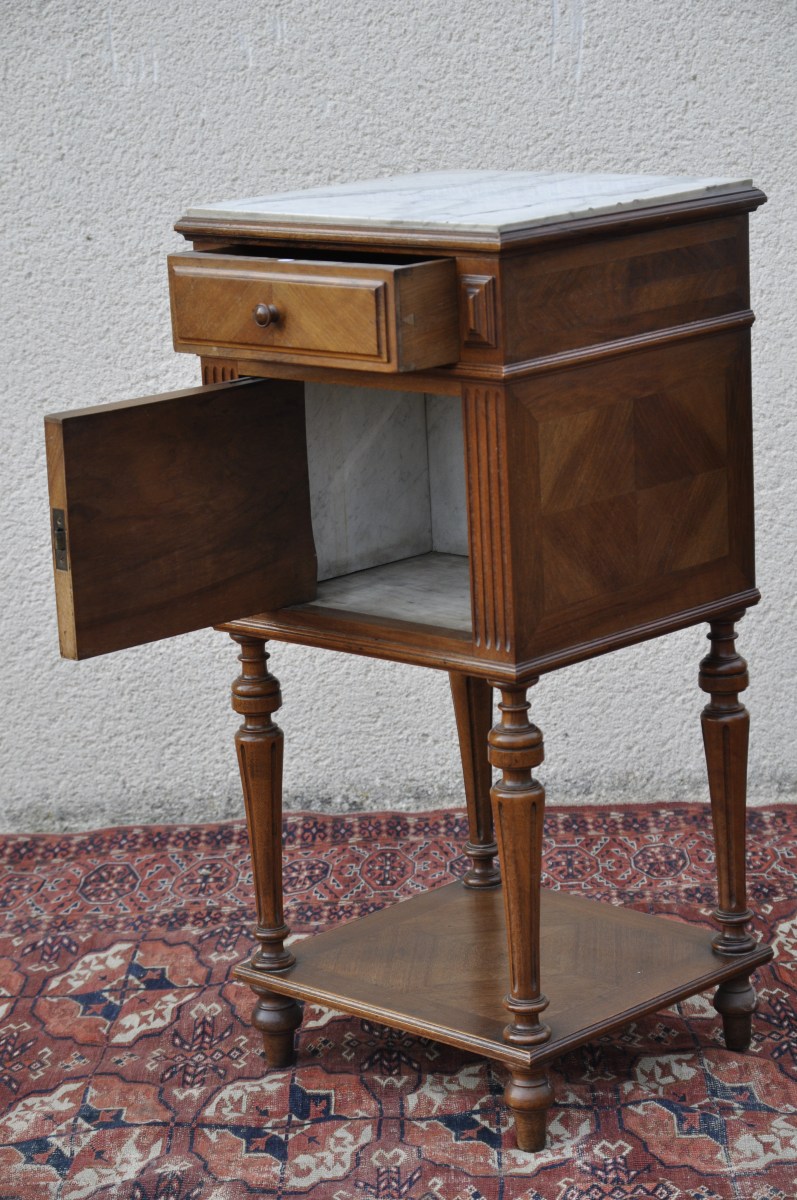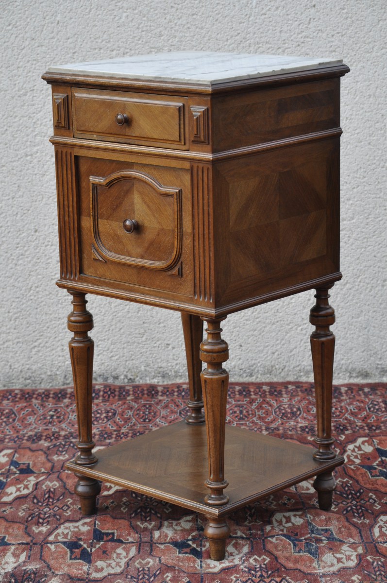 TABLE DE CHEVET en noyer mouluré et sculpté et placage de noyer ouvrant en façade par un tiroir et un vantail. Il repose sur quatre pieds fuselés et cannelés réunis par une entretoise. Dessus de marbre blanc veiné gris.
