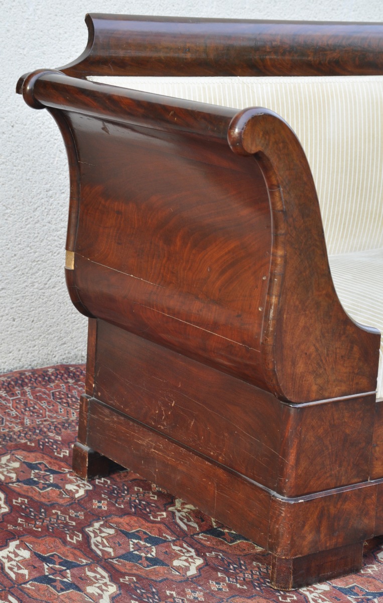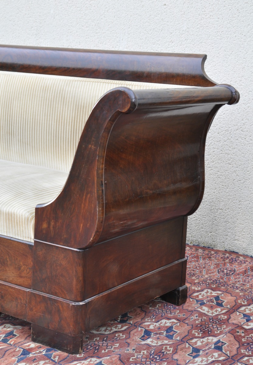 CANAPÉ en placage d'acajou. Dossier et accotoirs légèrement renversés.