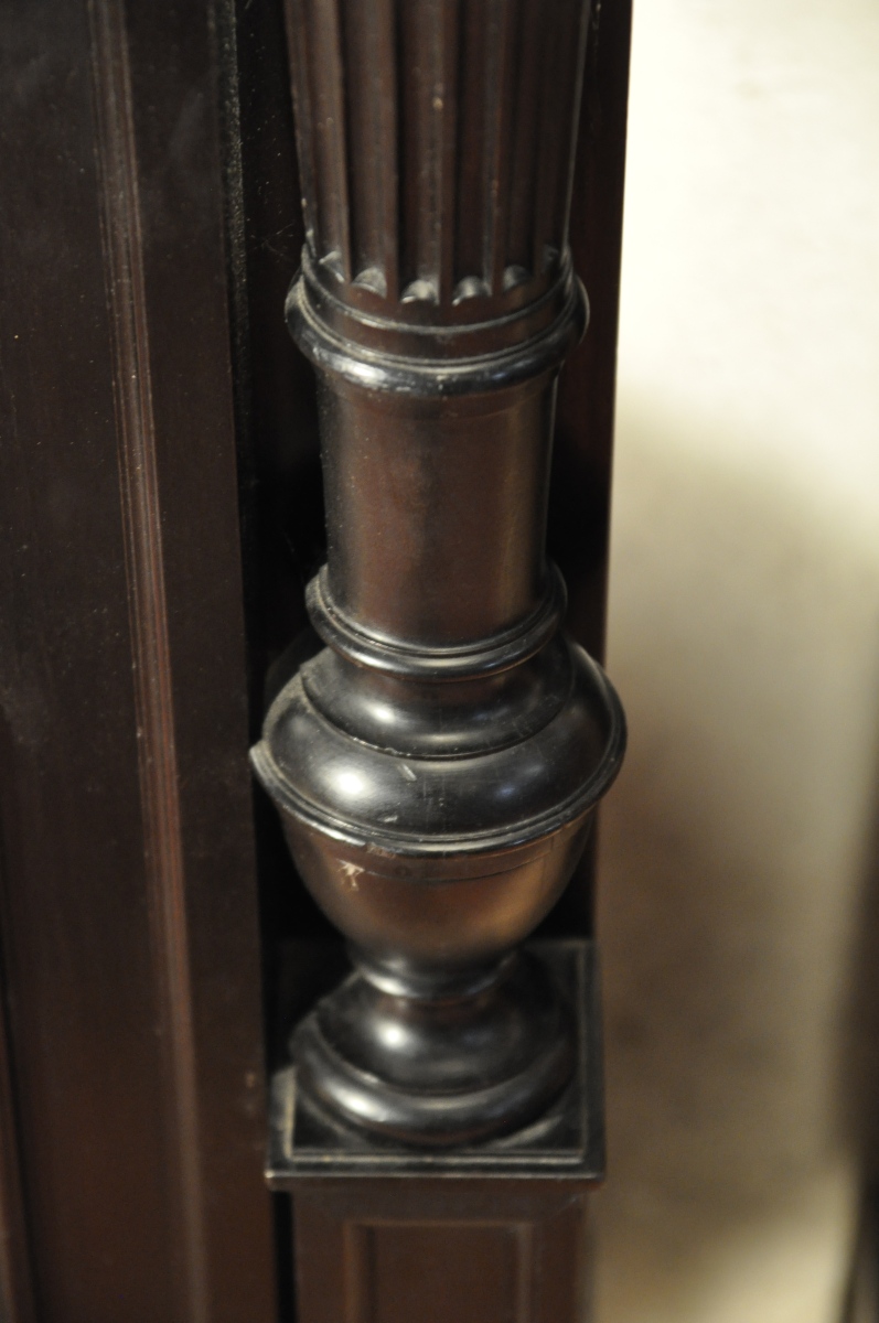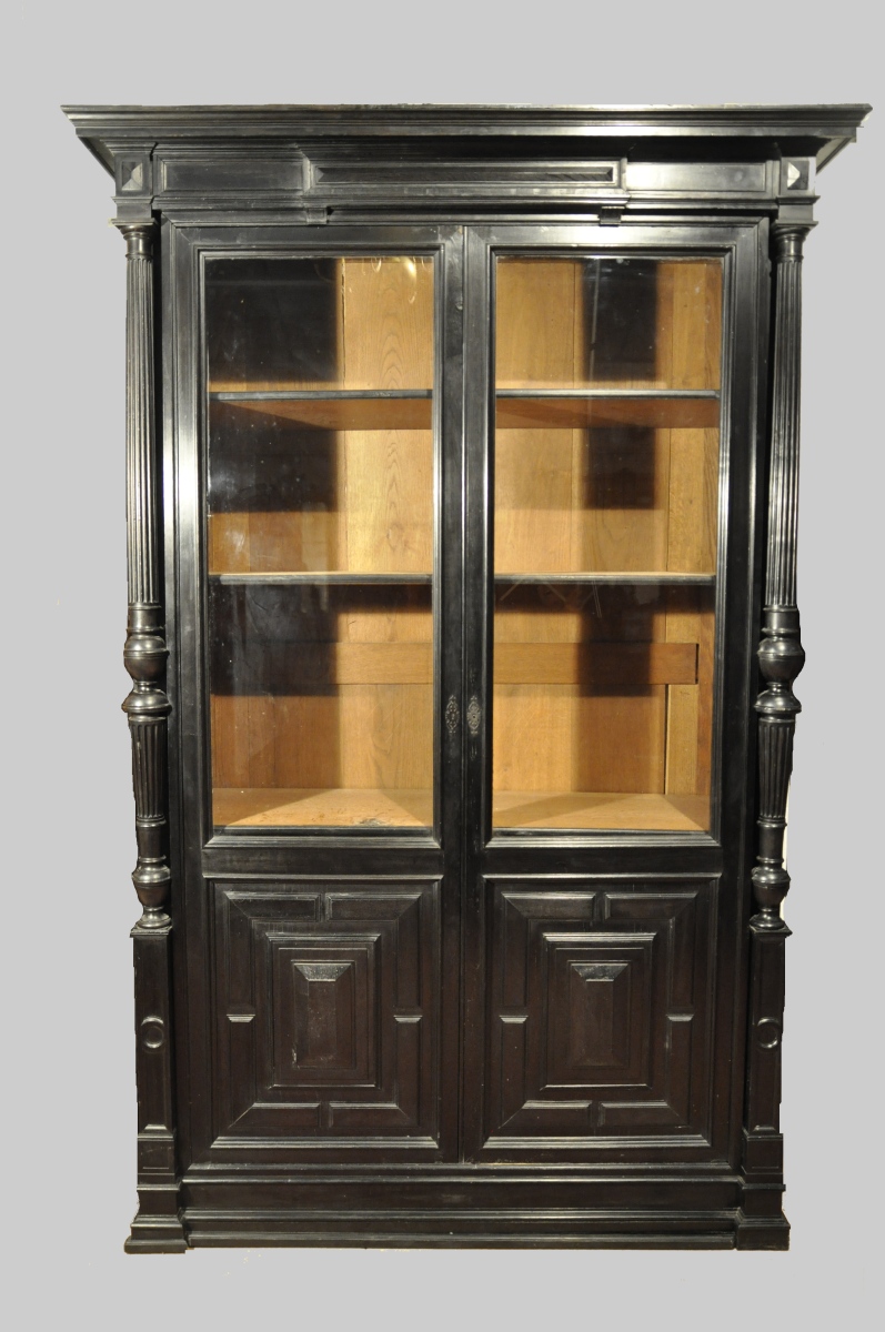 BIBLIOTHÈQUE en bois noirci mouluré et sculpté. Elle ouvre à deux vantaux partiellement vitrés encadrés de colonnes détachées tournées et cannelées.