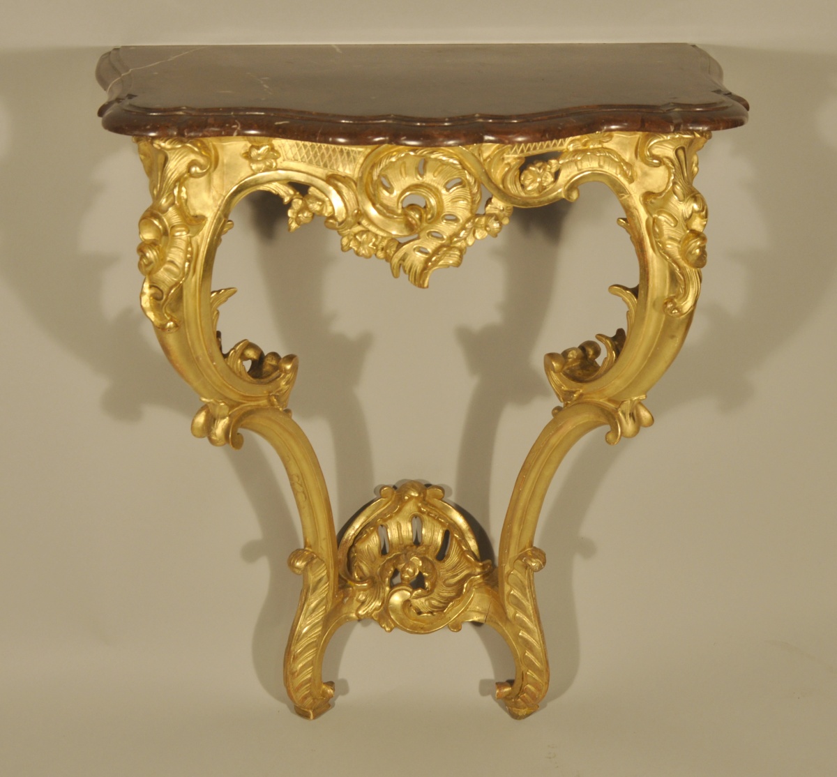 CONSOLE d'APPLIQUE en bois doré, mouluré et sculpté. Ceinture mouvementée à décor ajouré de coquilles, rinceaux et fleurettes. Repose sur deux pieds cambrés figurant deux rinceaux affrontés ornés de feuilles d'eau. Entretoise orné d'une coquille ajourée. Dessus de marbre rouge.