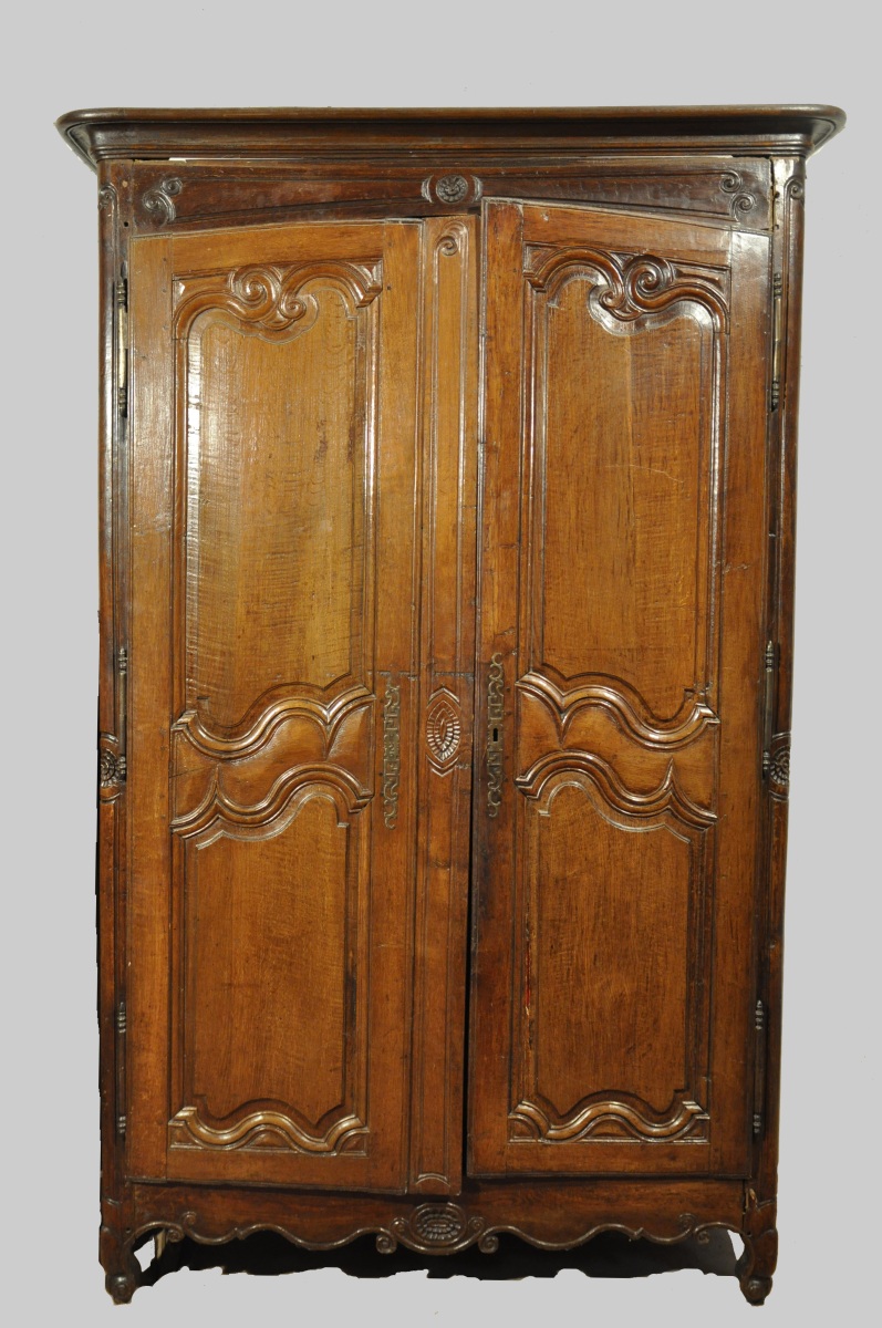 ARMOIRE en chêne mouluré et sculpté. Elle ouvre à deux vantaux à panneaux mouvementés. Décor de rosaces et volutes affrontées. Faux dormant. Pieds cambrés.