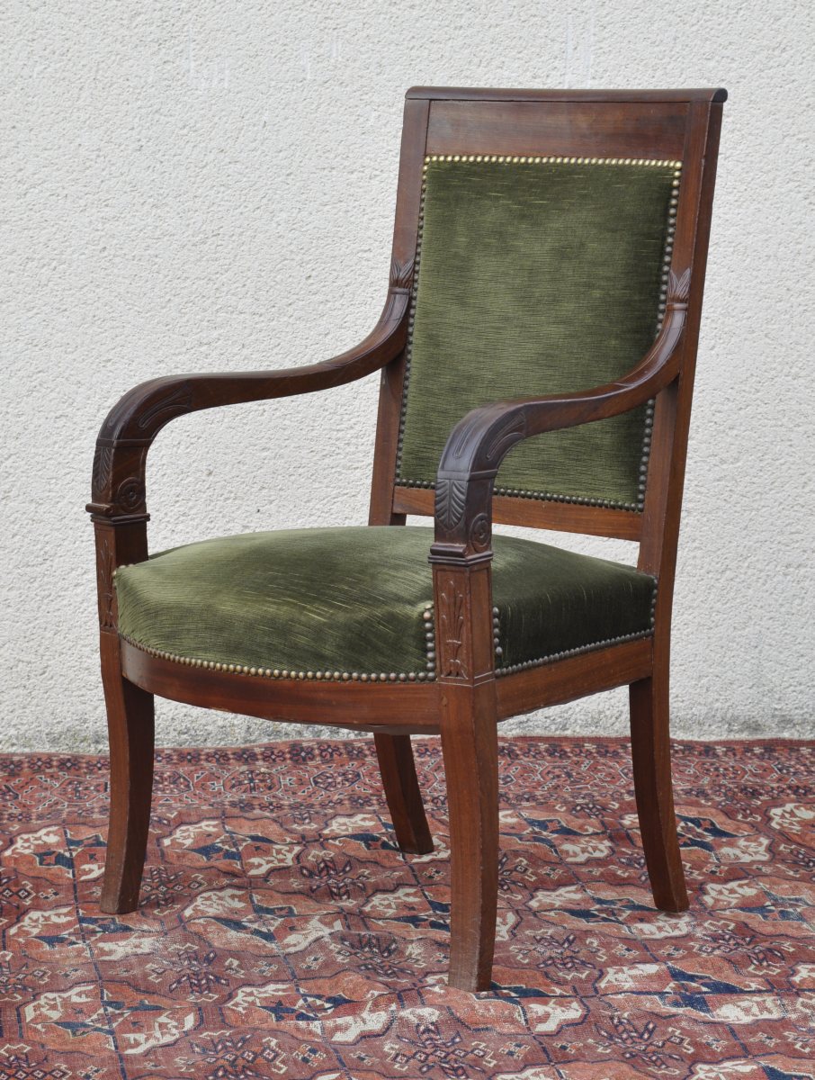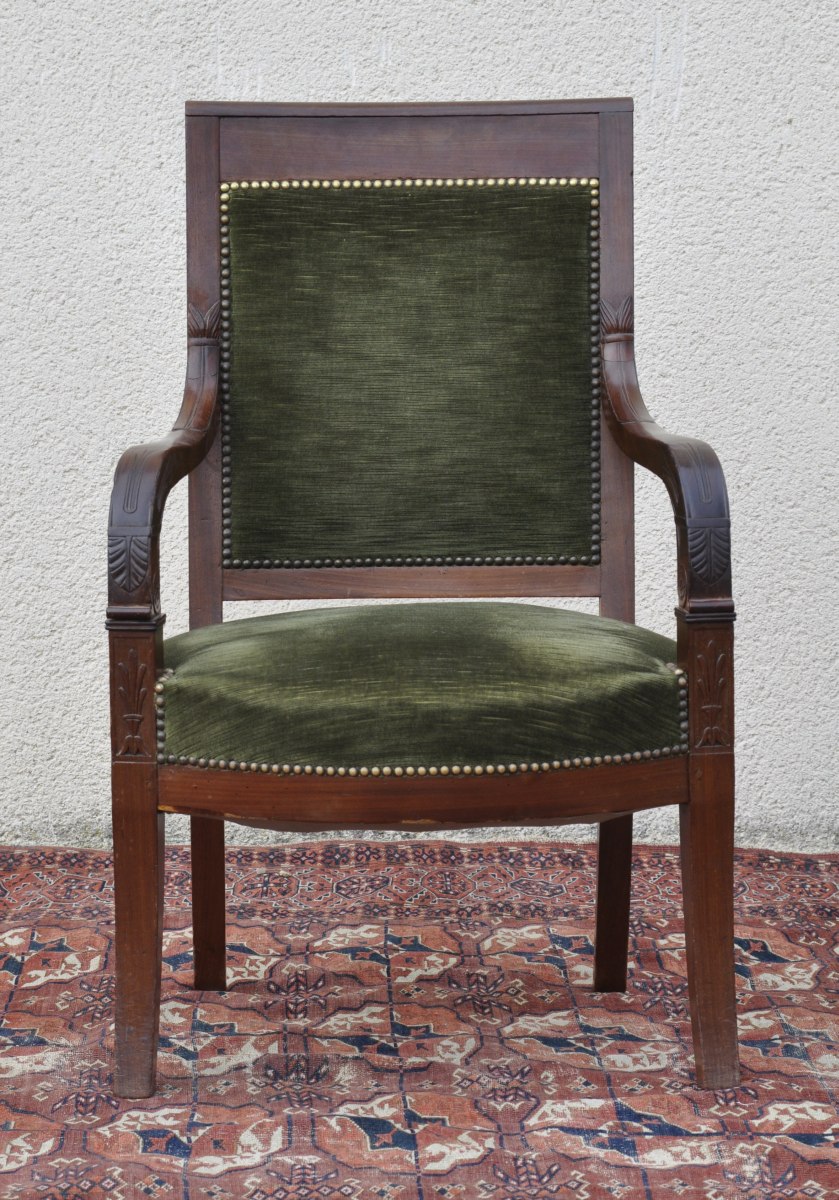 FAUTEUIL en acajou et placage d'acajou mouluré et sculpté. Accotoirs galbés à décor de feuilles d'eau et fleurettes. Dés de raccordement ornés de palmettes. Pieds sabre.