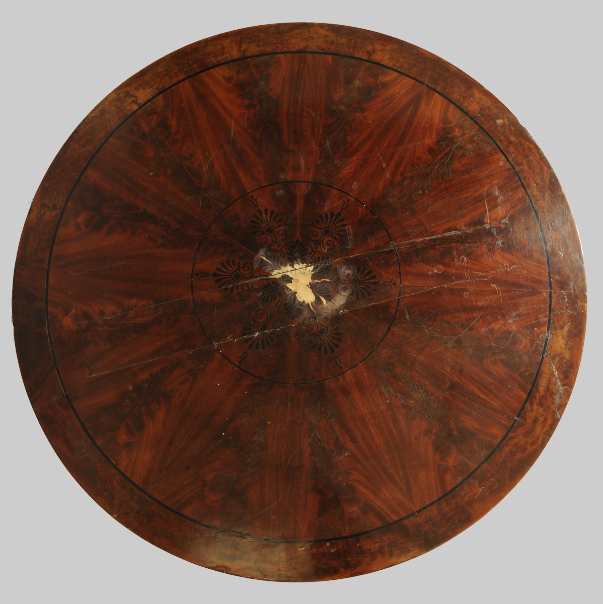 TABLE ronde tripode en placage d'acajou ouvrant par un tiroir en ceinture. Plateau orné au centre de palmettes rayonnantes et de filets de bois noirci. Pieds en jarrets terminés par des pattes de lion et réunis par une tablette d'entrejambe montée sur roulettes.