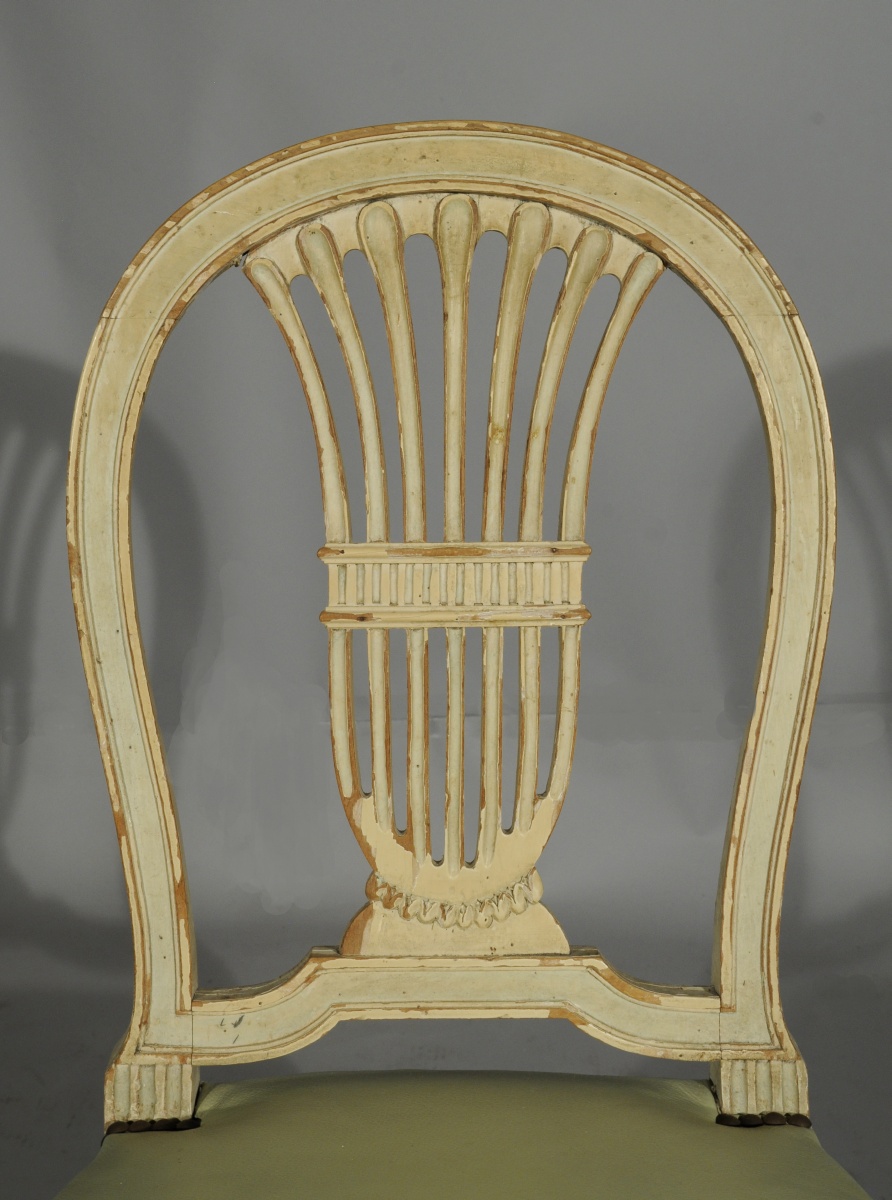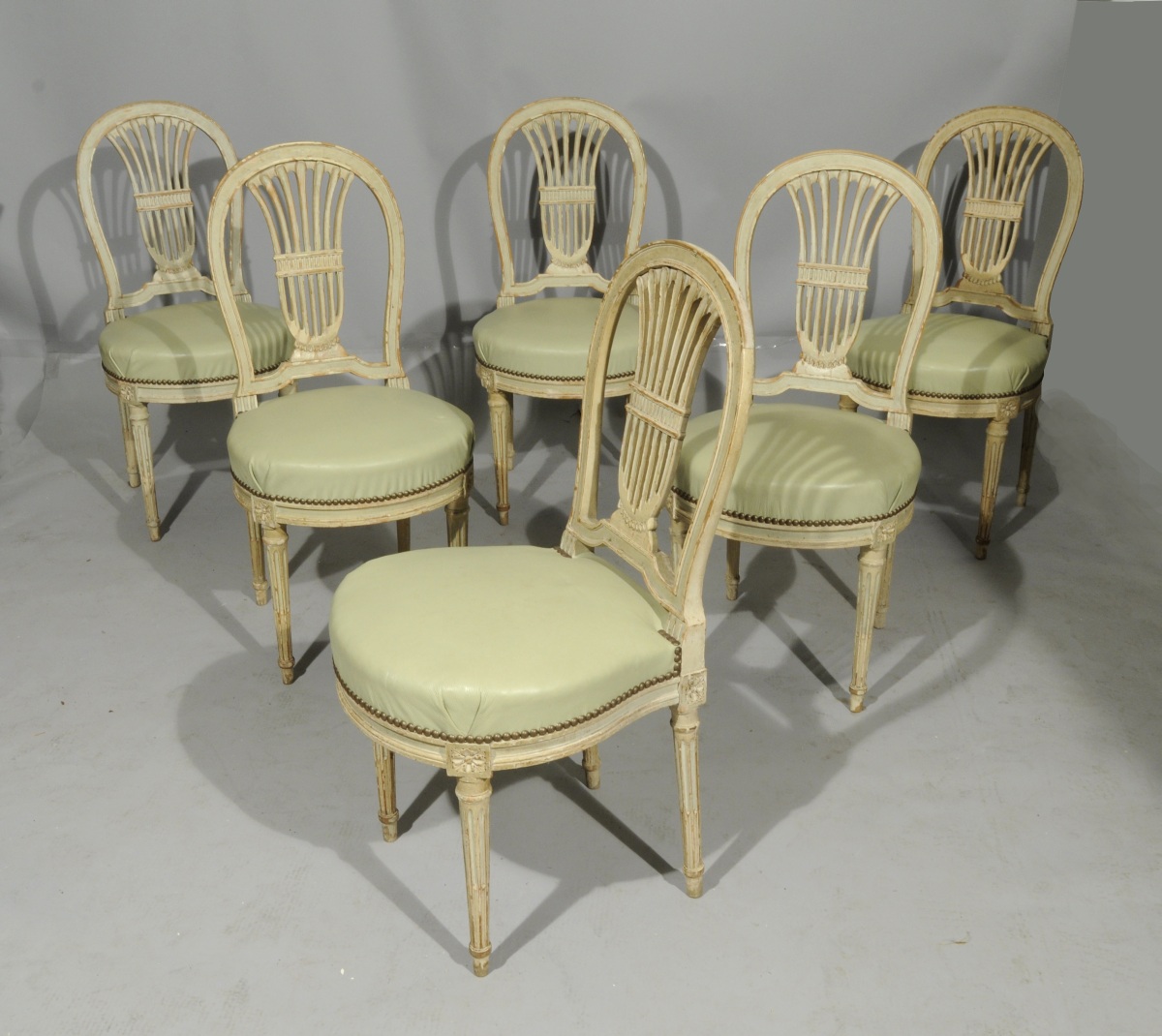 SUITE DE SIX CHAISES "à la montgolfière" en hêtre mouluré et sculpté, rechampi vert et crème. Dossier ajouré. Assise adoptant la forme d'un fer à cheval. Dés de raccordement sculptés de fleurettes. Pieds fuselés, cannelés, et rudentés.