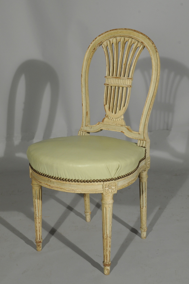 Travail de qualité de style Louis XVI. Garniture de cuir céladon. (usures)