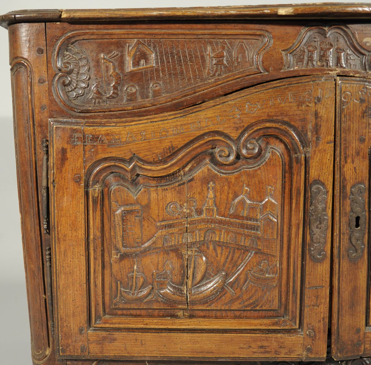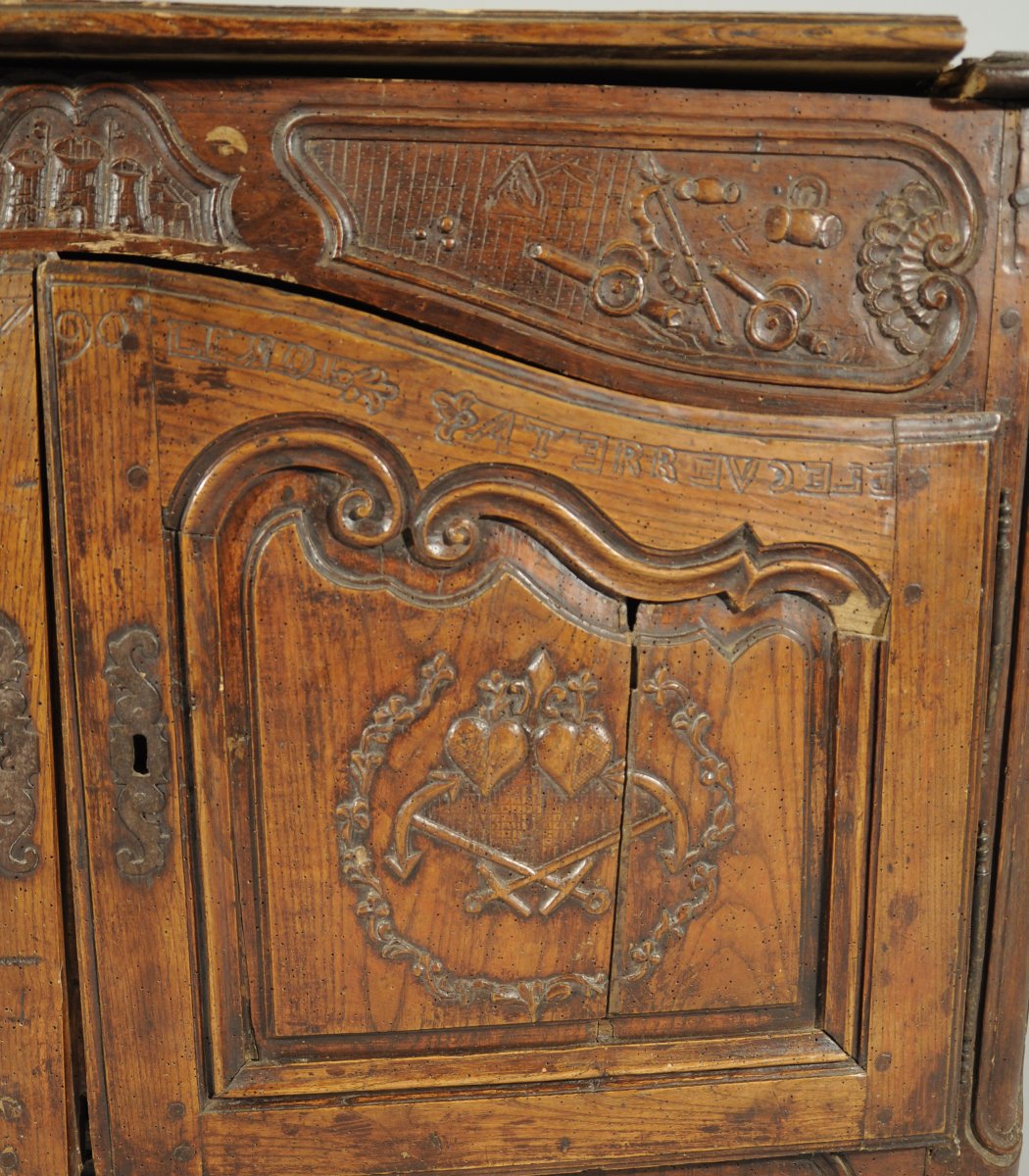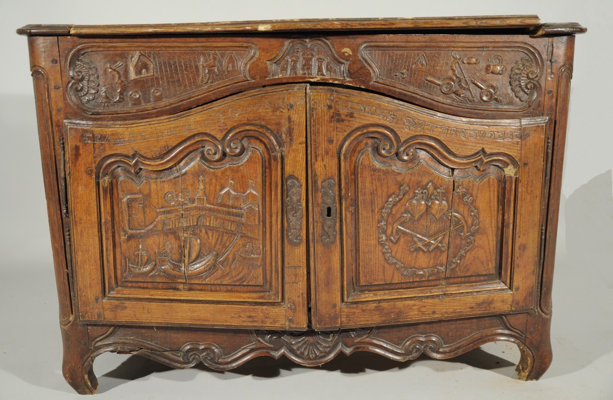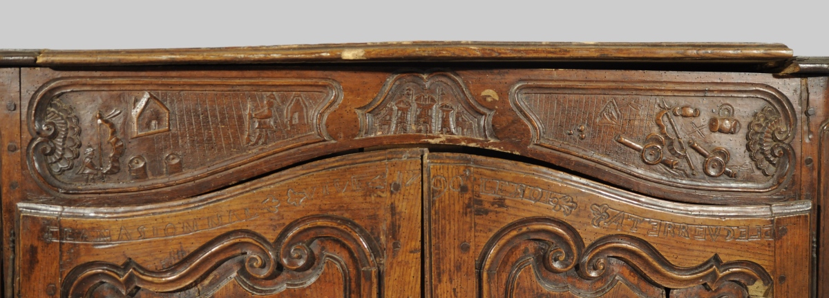 BUFFET-BAS rustique en bois naturel mouluré et sculpté ouvrant en façade par deux vantaux. Traverse haute chantournée à décor de combattants, château et canons dans trois réserves. Les vantaux reçoivent un décor de navires, épées croisées, curs et rinceaux sommés de l'inscription " LANASIONNAL / VIVE LE ROI / 1790 / ATERREVCELE (?) ". Traverse basse chantournée à décor de coquille, feuillages et volutes affrontées. Pieds antérieurs cambrés, pieds postérieurs droits (antés).