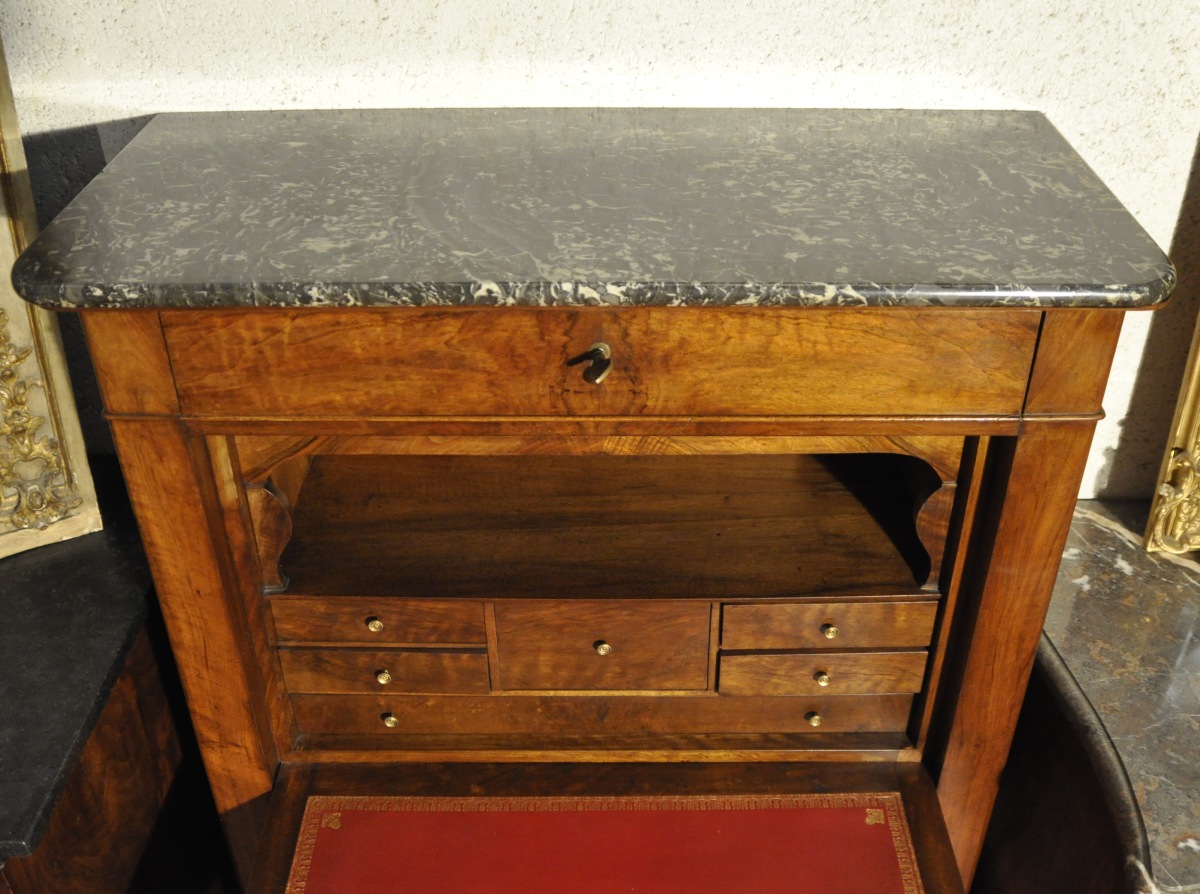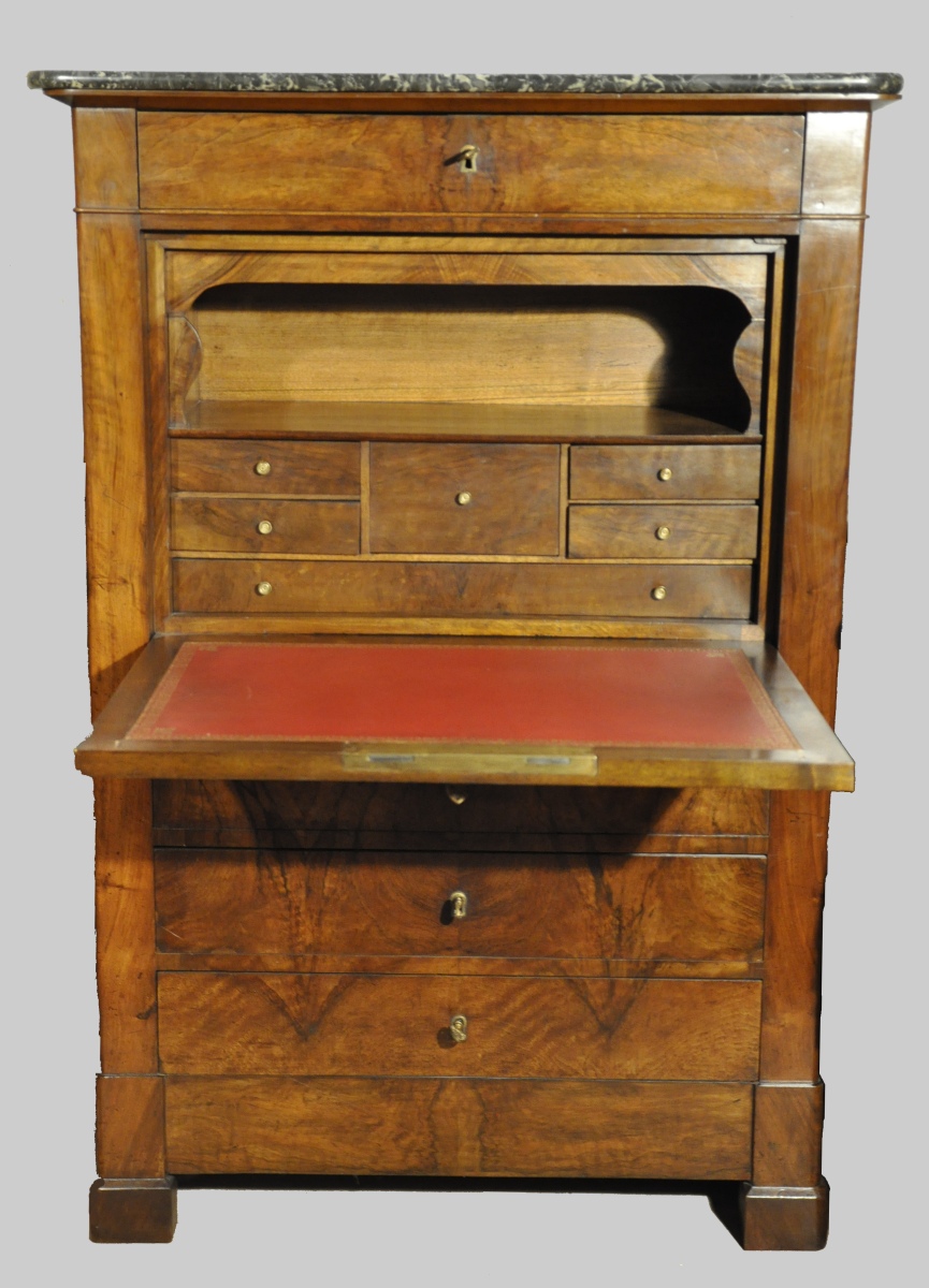 SECRÉTAIRE VERTICAL en acajou et placage d'acajou. Il ouvre en façade par quatre tiroirs et un abattant dissimulant un casier et six tiroirs. Dessus de marbre gris veiné blanc.