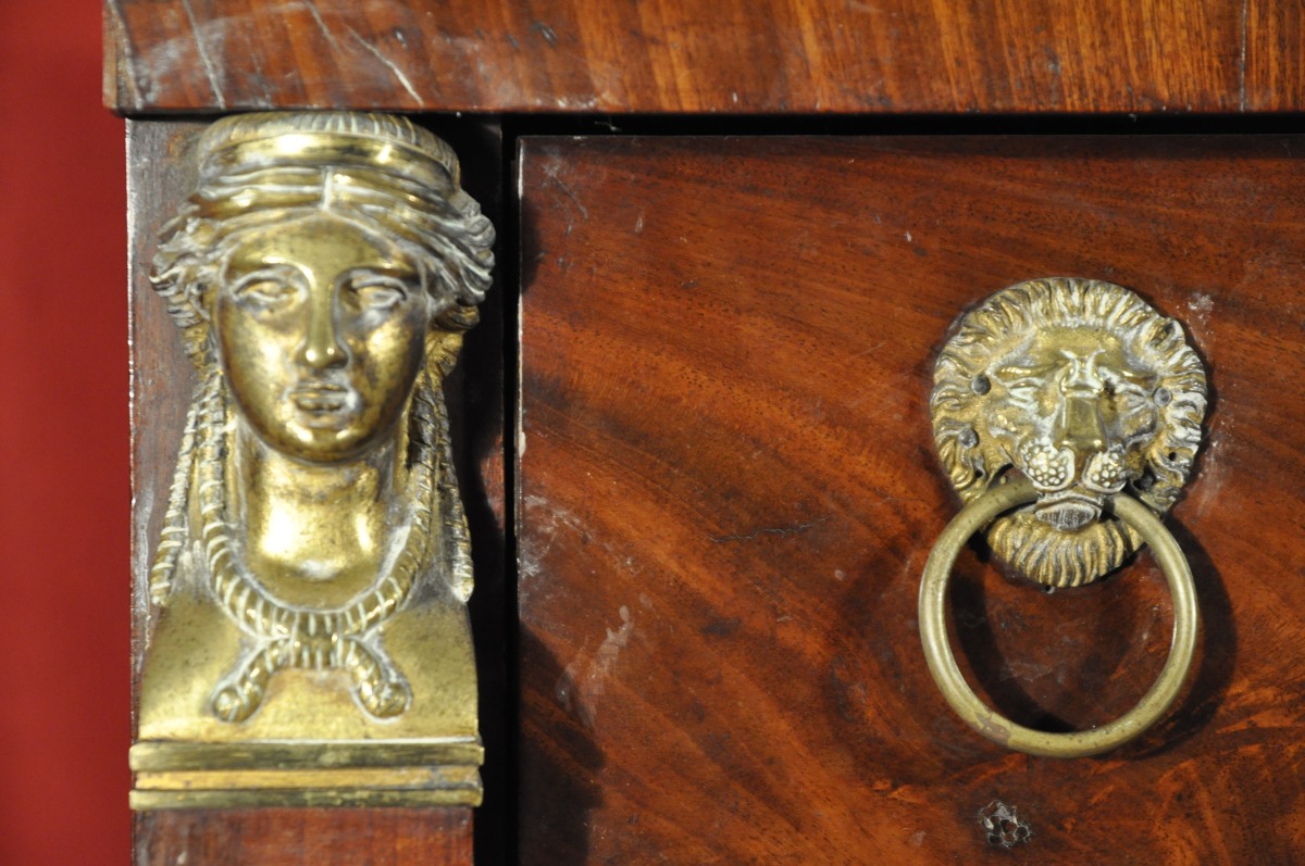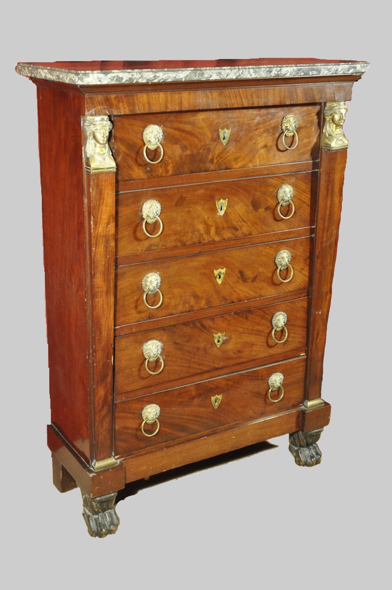 CHIFFONIER en acajou et placage d'acajou ouvrant en façade par cinq tiroirs. Riche ornementation de bronzes ciselés et dorés tels que têtes de caryatides, poignées de tirage à tête de lion. Pieds antérieurs à pattes de lions en bois noirci. Serrures à trèfle. Dessus de marbre gris Sainte Anne.