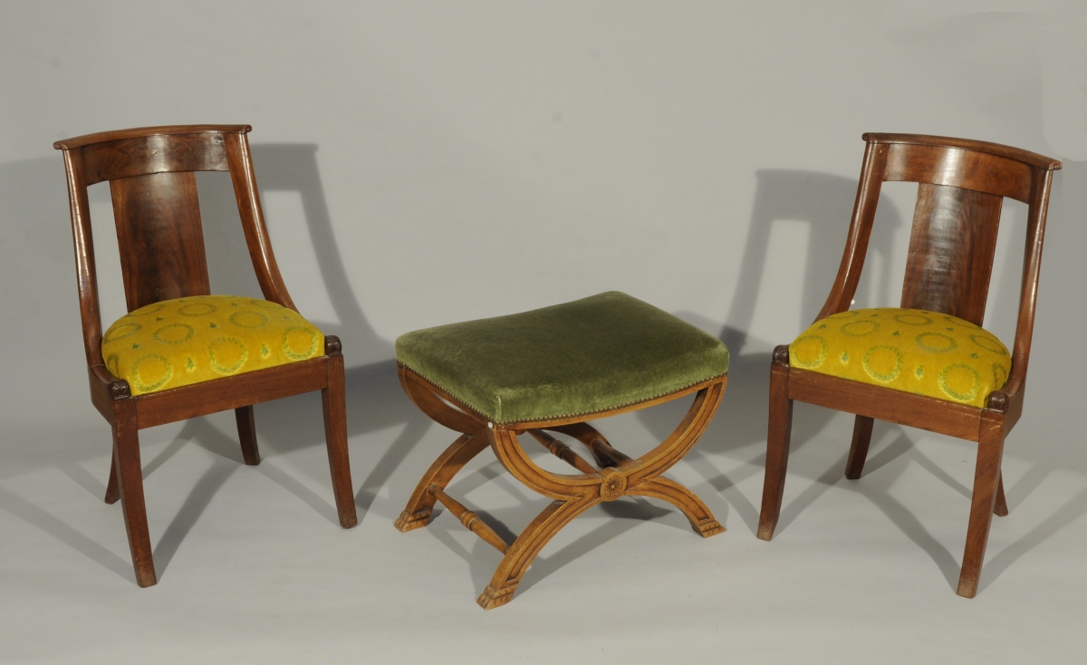 -SIÈGE CURULE en bois clair mouluré et sculpté à décor d'une rosace. Pieds réunis par trois entretoises tournées en balustre et se terminant par des griffes. Fin XIXème-début XXème. Garniture de velours vert.