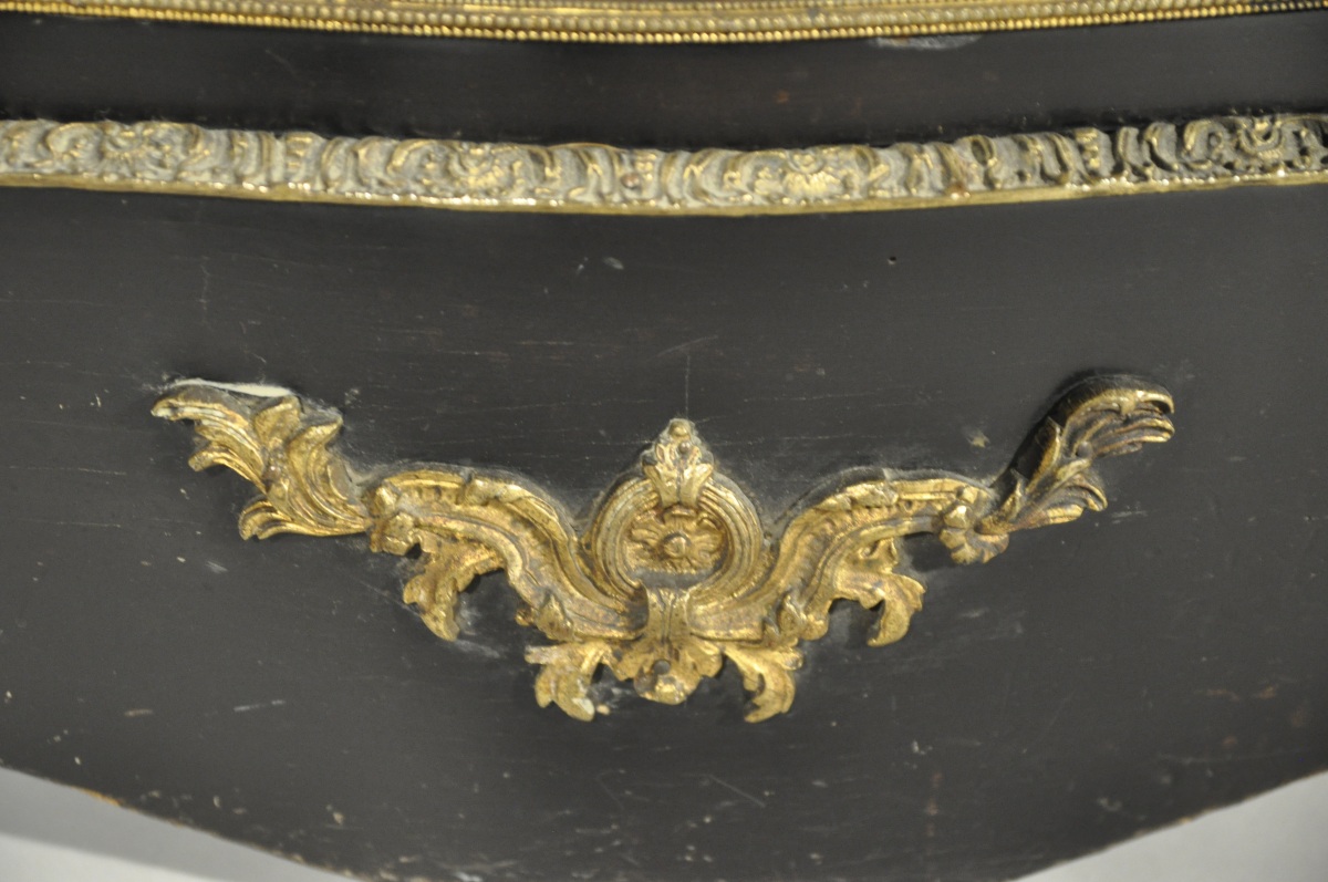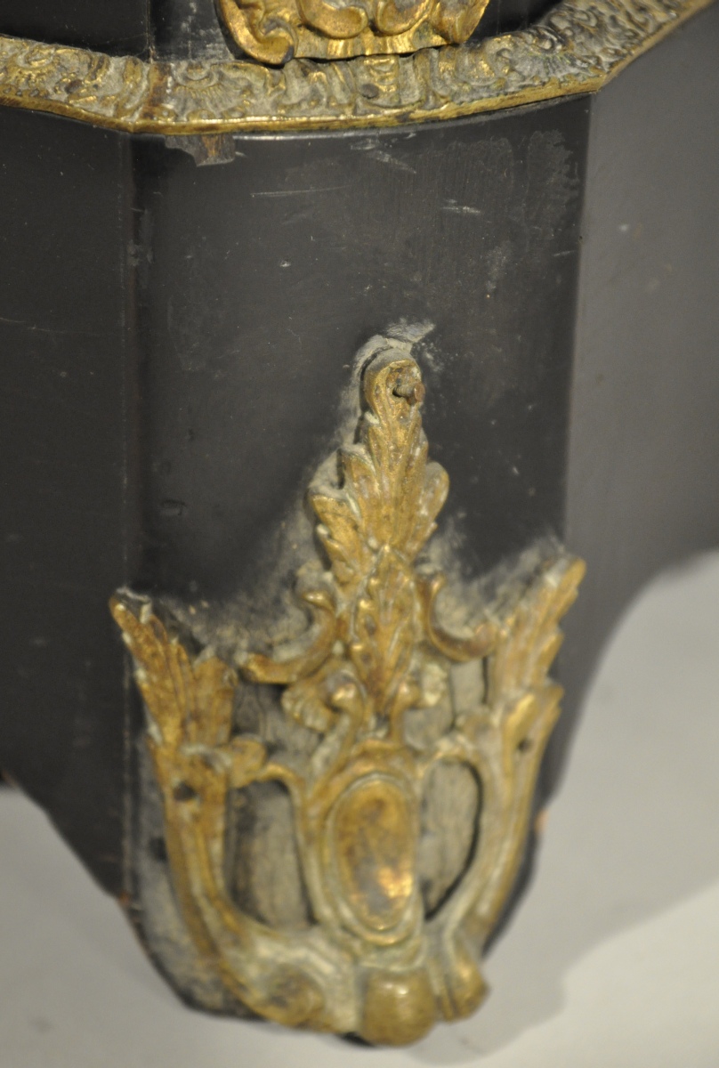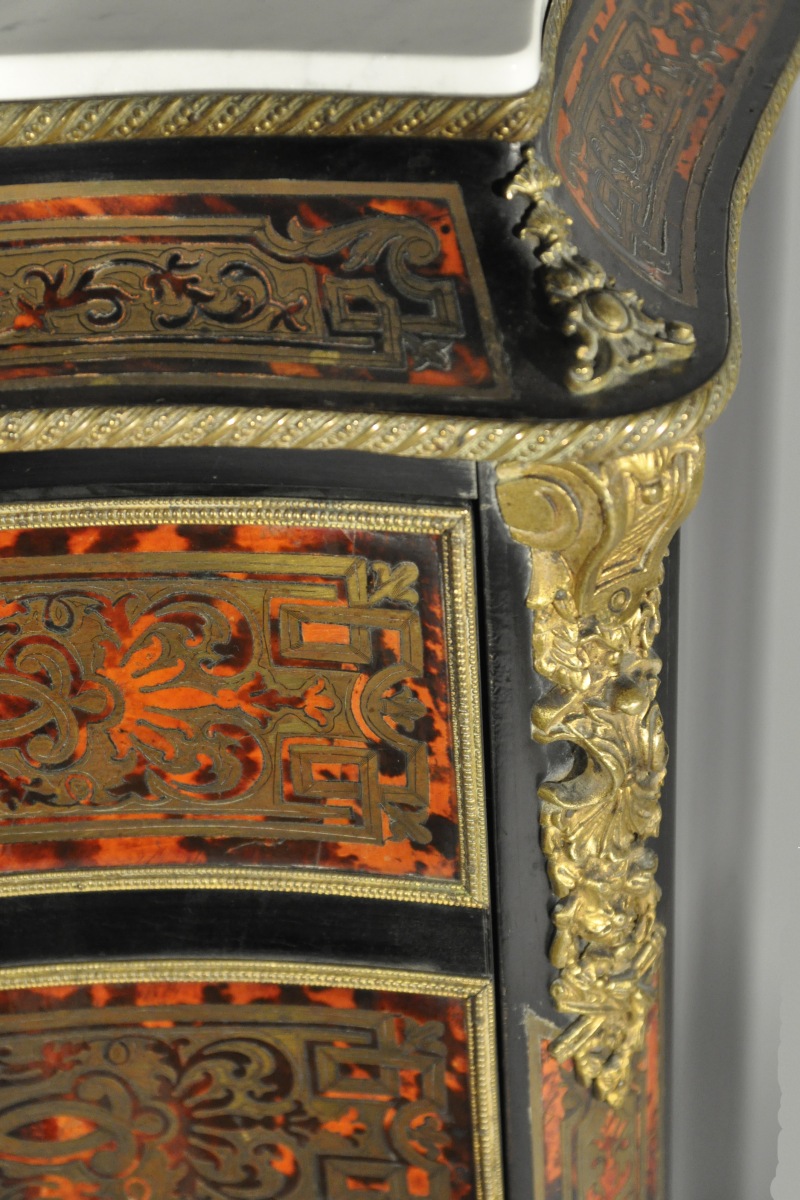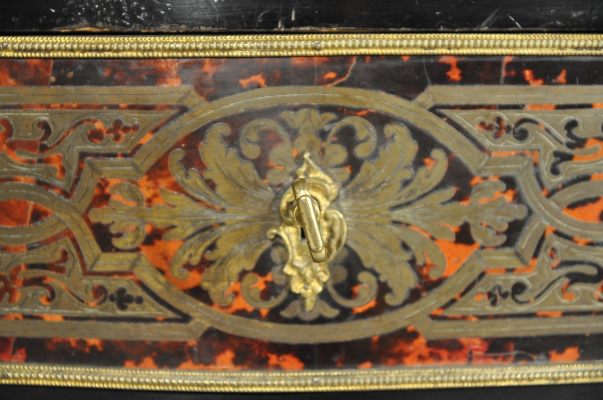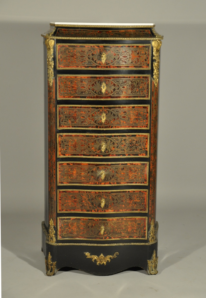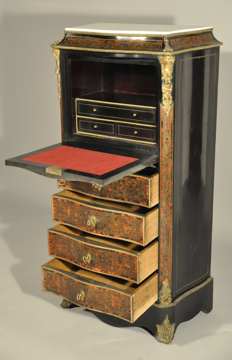 SECRÉTAIRE SEMAINIER en bois noirci et marqueterie d'écaille et de laiton de style Boulle. Il ouvre à quatre tiroirs et un abattant simulant trois tiroirs découvrant un casier et trois tiroirs. Côtés galbés. Traverse mouvementée. Garniture de bronzes dorés: lingotière, chutes, entrées de serrures, cul de lampe et sabots. Dessus de marbre blanc.