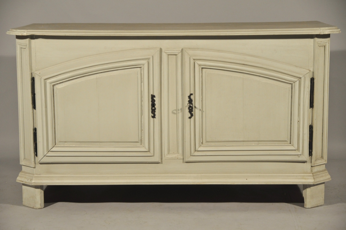 BUFFET BAS en bois mouluré et relaqué gris clair ouvrant en façade par deux vantaux à cartouches. Montants mouluré à pans coupés.