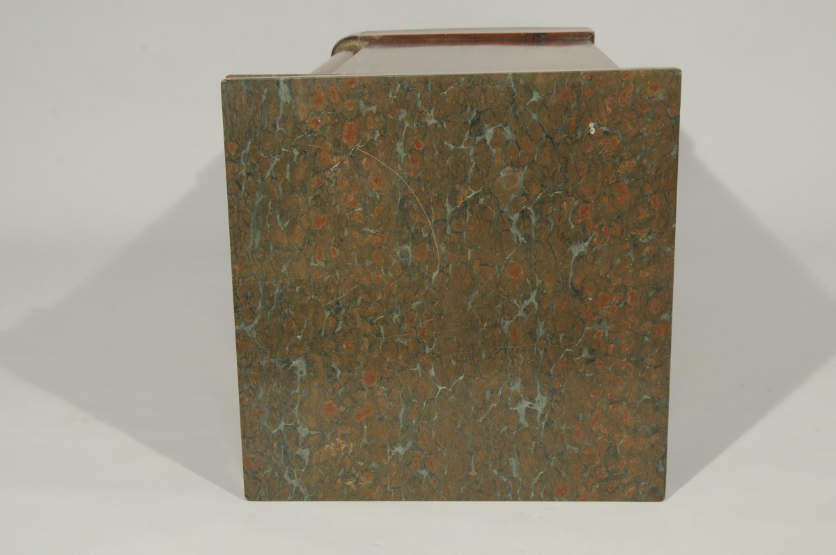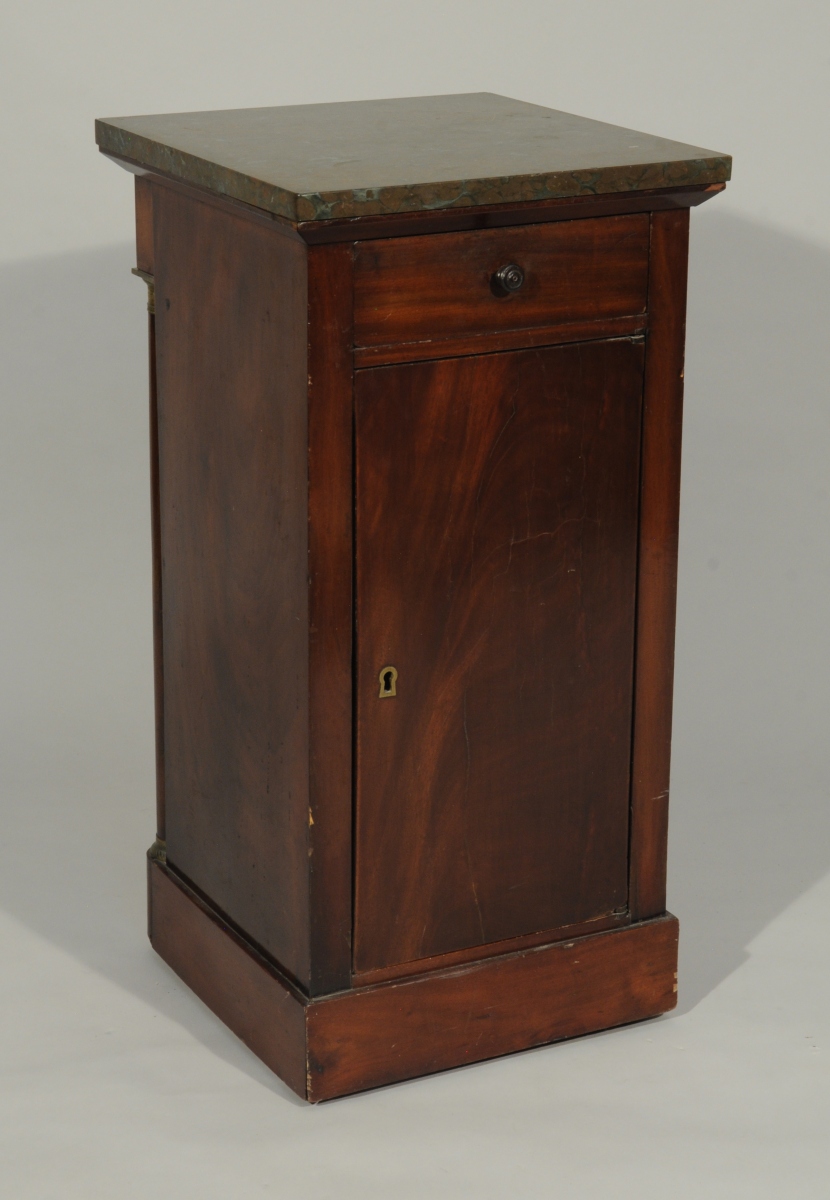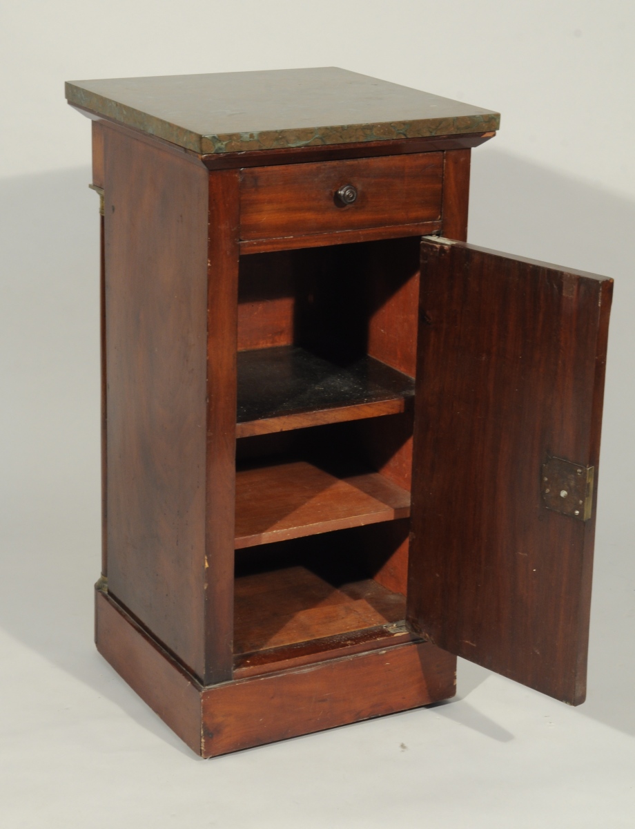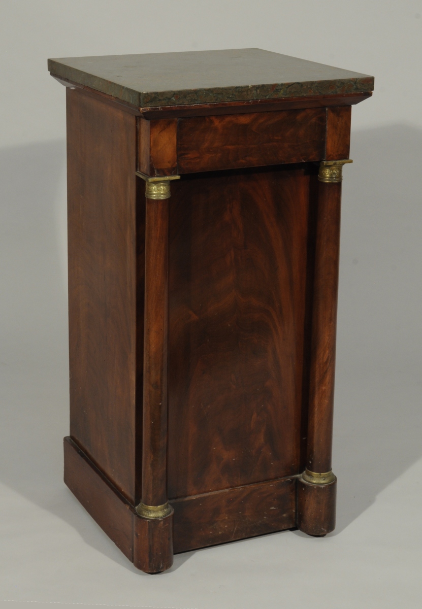 CHEVET double-face en acajou et placage d'acajou ouvrant par un tiroir et un vantail en façade. L'autre face à colonnes détachées. Ornementation de bronze doré tel que chapiteaux à décor de pampres et bagues. Dessus de marbre probablement griotte.