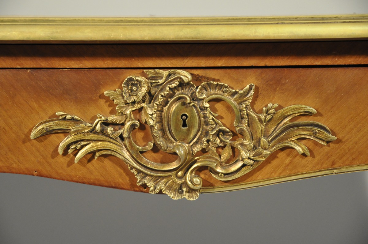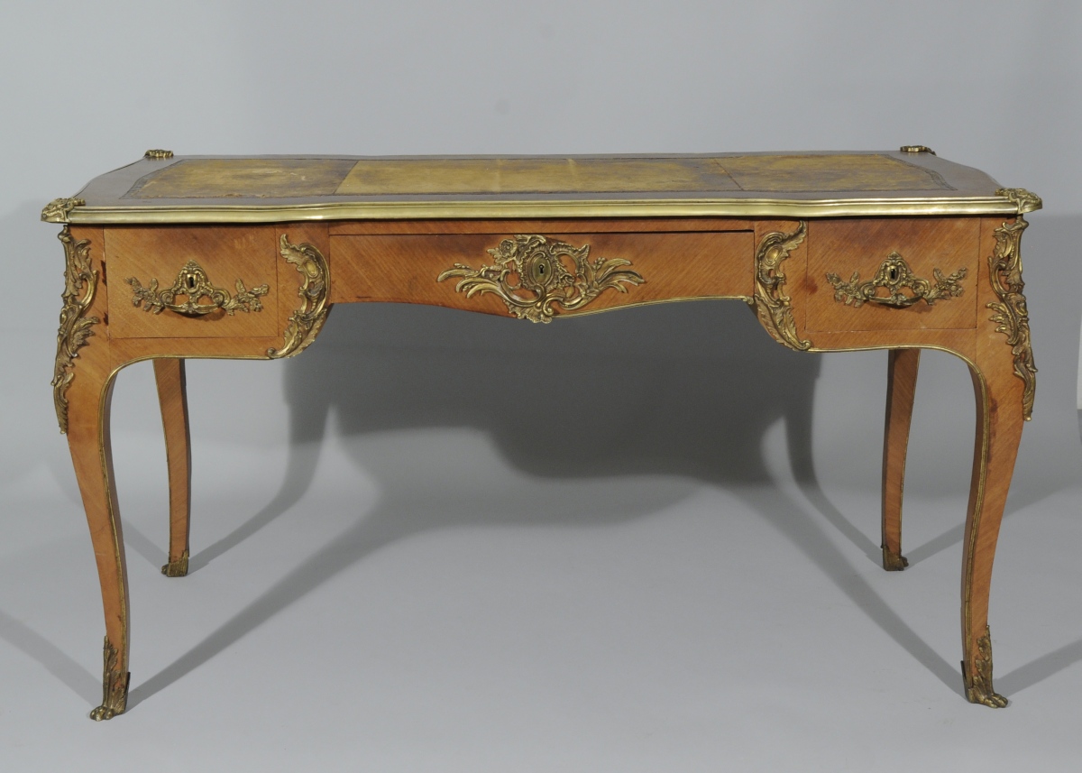 BUREAU plat en bois de placage ouvrant par trois tiroirs en ceinture. Plateau mouvementé foncé d'un cuir fauve doré aux petits fers. Ceinture chantournée. Il repose sur quatre pieds cambrés. Ornementation de bronzes dorés de style Rocaille tels que: lingotière, chutes d'angle, poignées de tirage, entrées de serrure et sabots en griffe de lion.