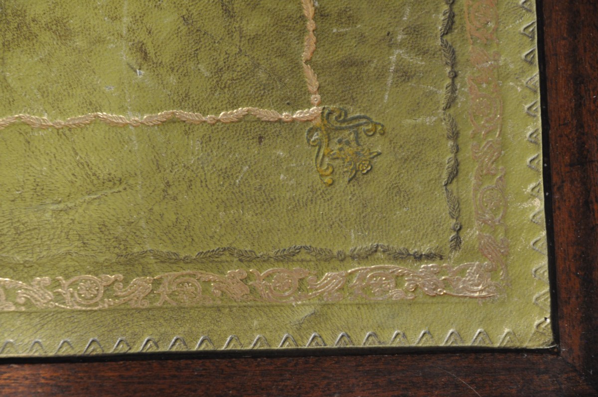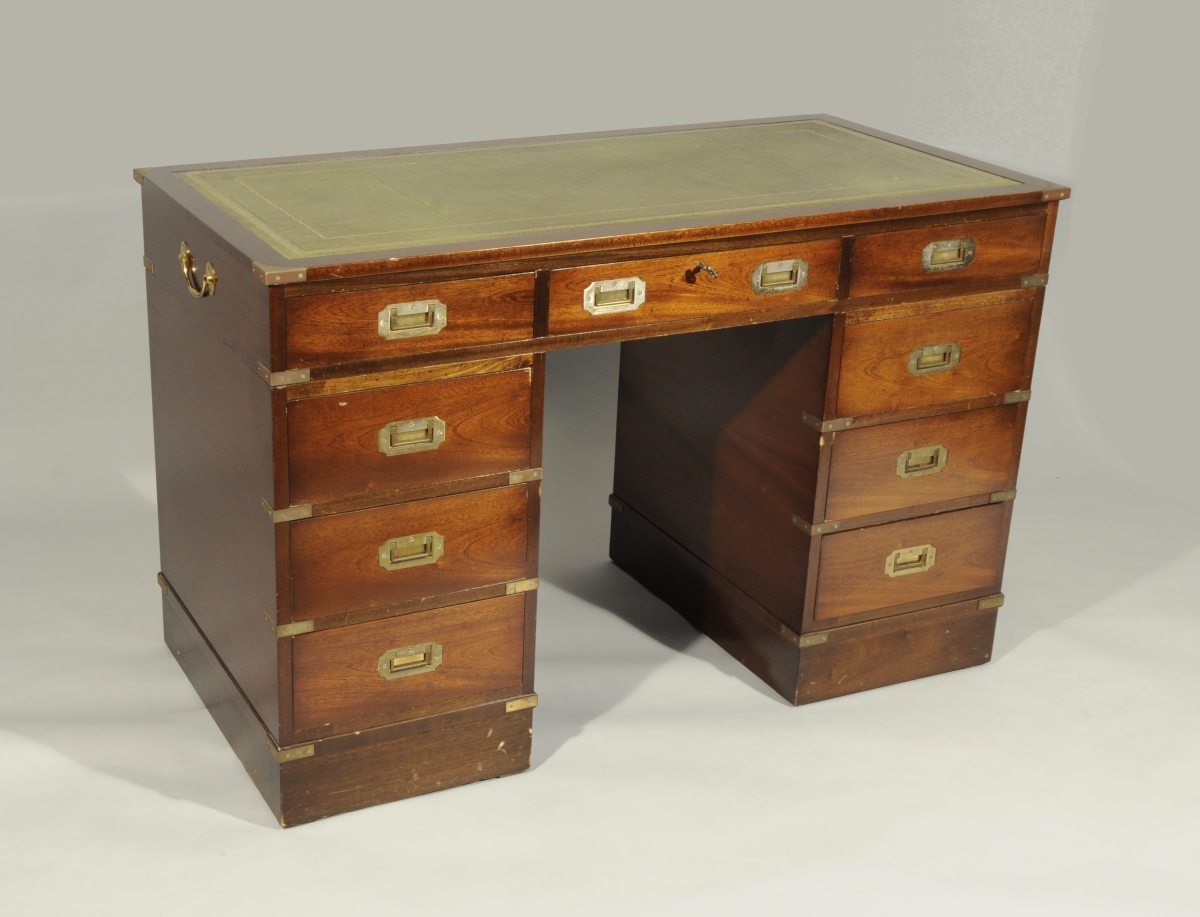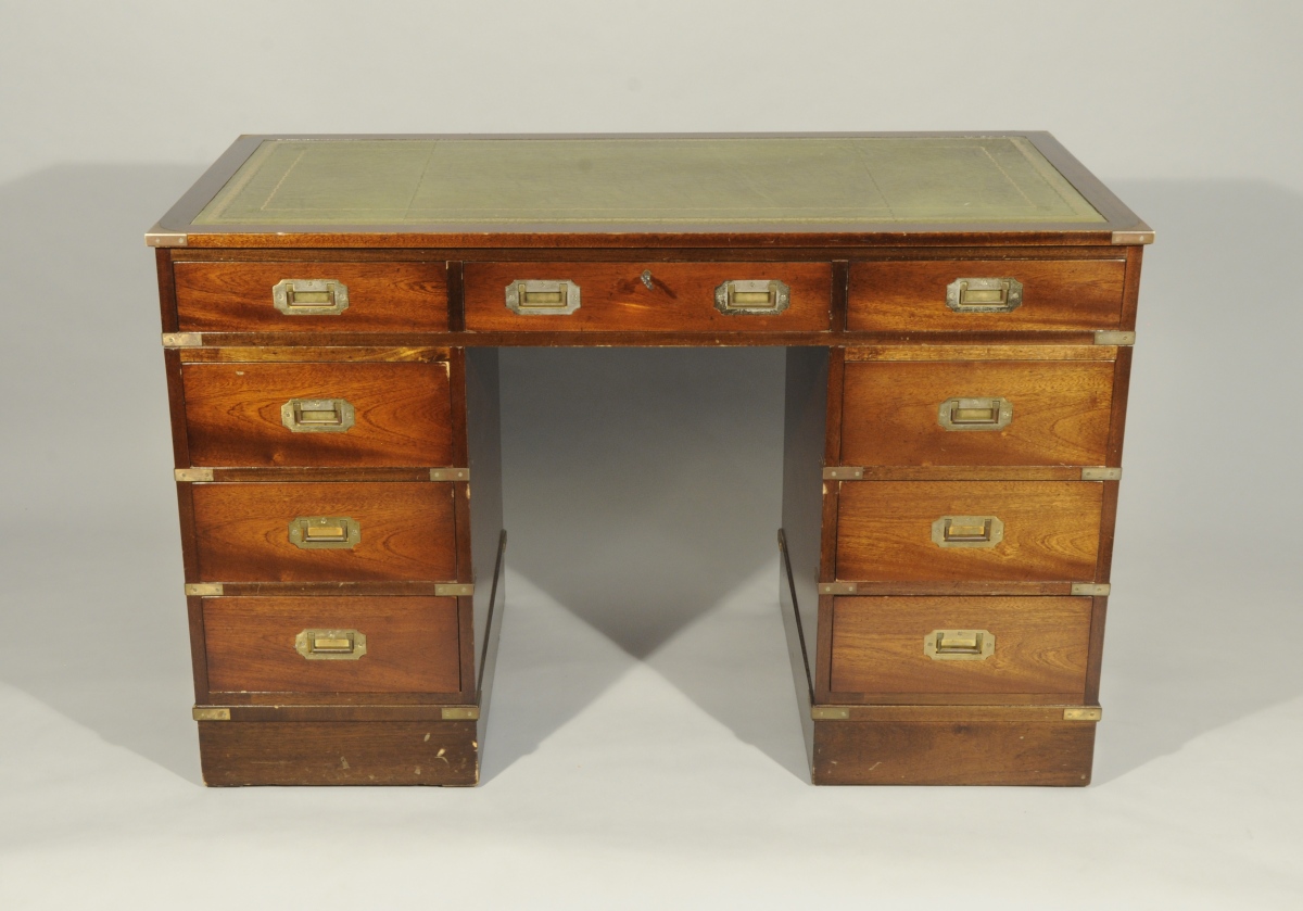 BUREAU PLAT en acajou ouvrant en façade par neuf tiroirs. Plateau foncé de cuir vert doré aux petits fers. Garnitures de laiton: poignées de tirage, écoinçons et écoignures.
