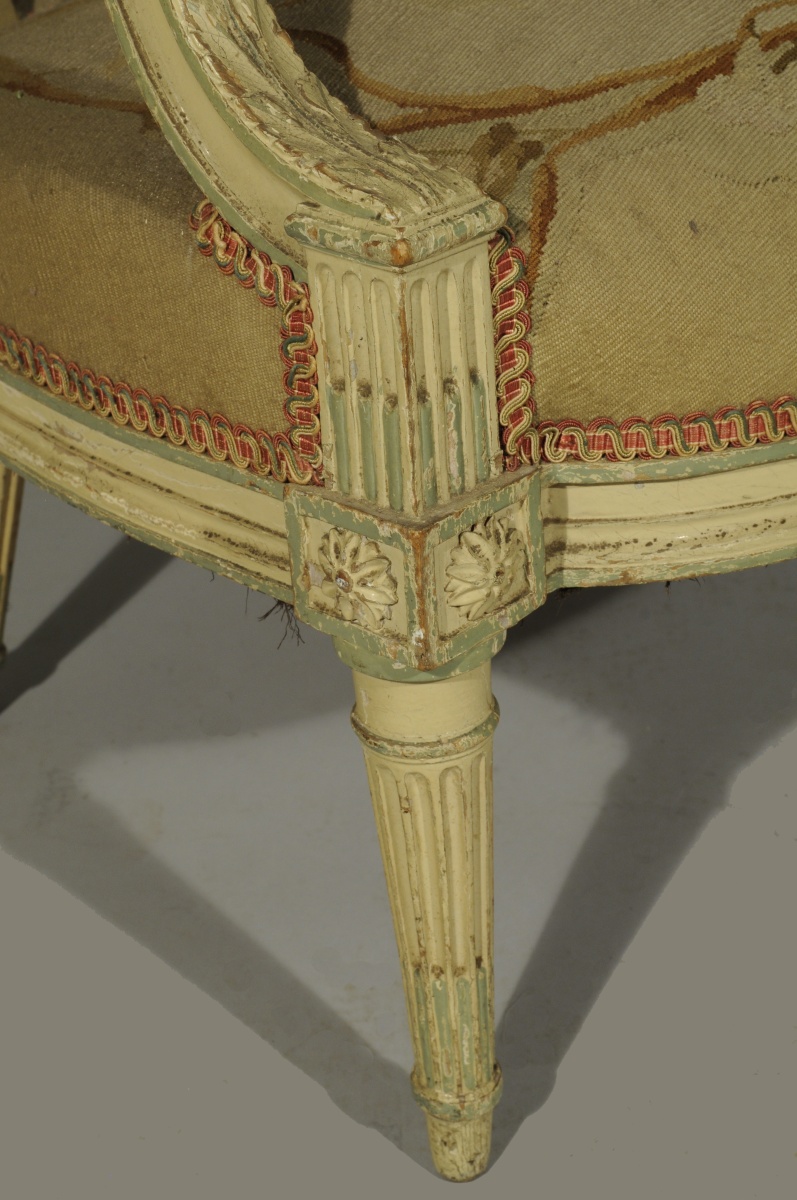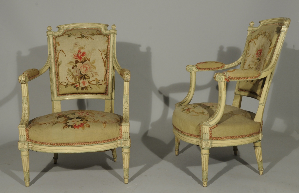 PAIRE de CHAUFFEUSES en en hêtre mouluré, sculpté et rechampi vert et crème. Dossier en chapeau de gendarme, grenades éclatées à l'amortissement des montants. Accotoirs se terminant en volutes, et reposant sur des consoles galbées. Dés de raccordement sculptés de fleurons. Pieds fuselés, cannelés et rudentés. Garniture de tapisserie aux bouquets fleuris et guirlandes de feuillages.
