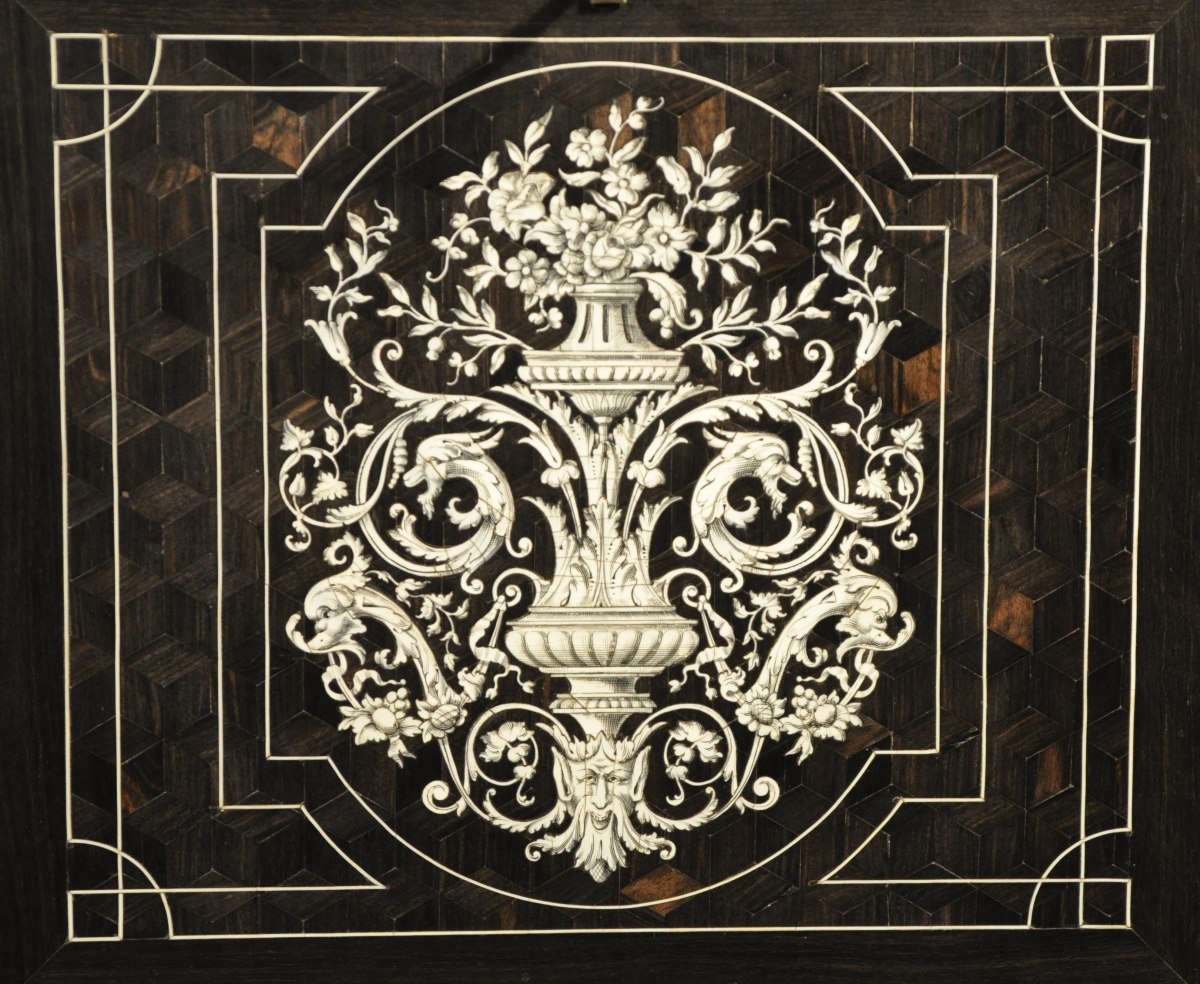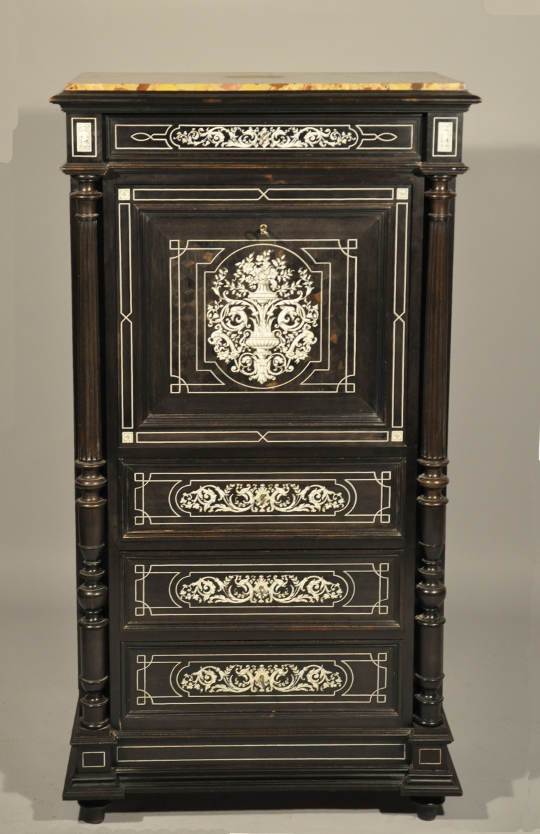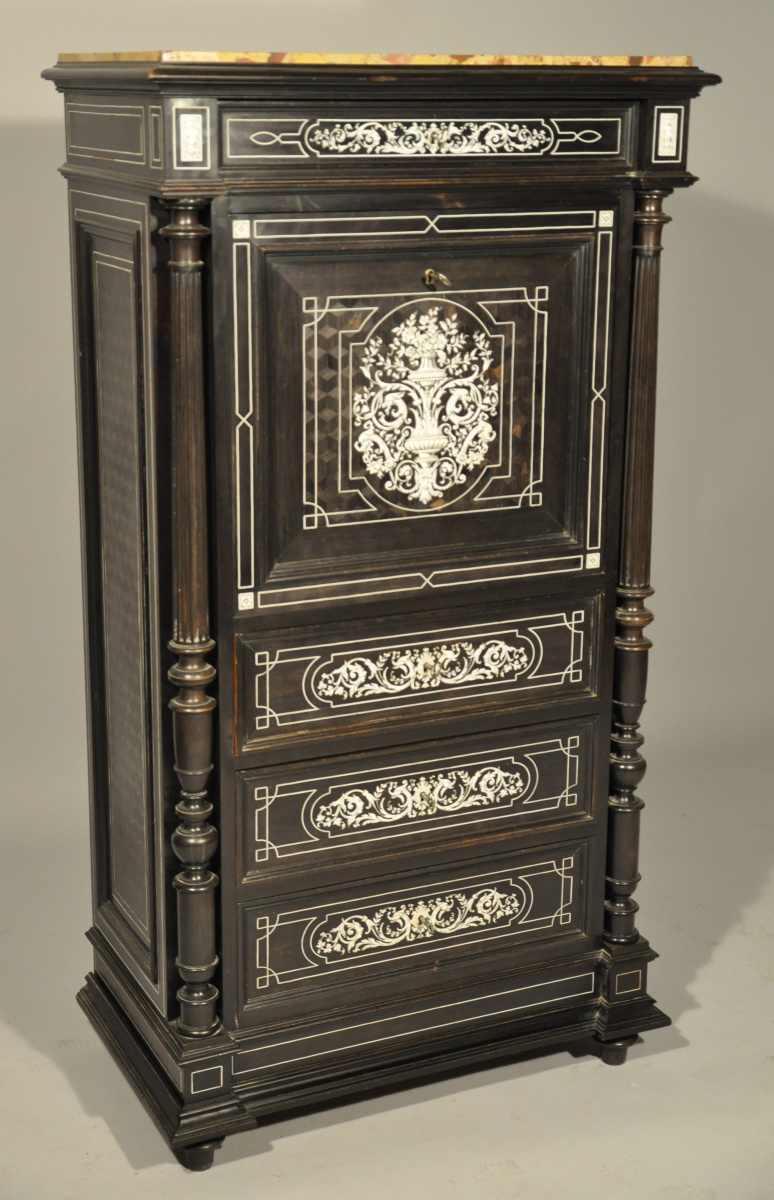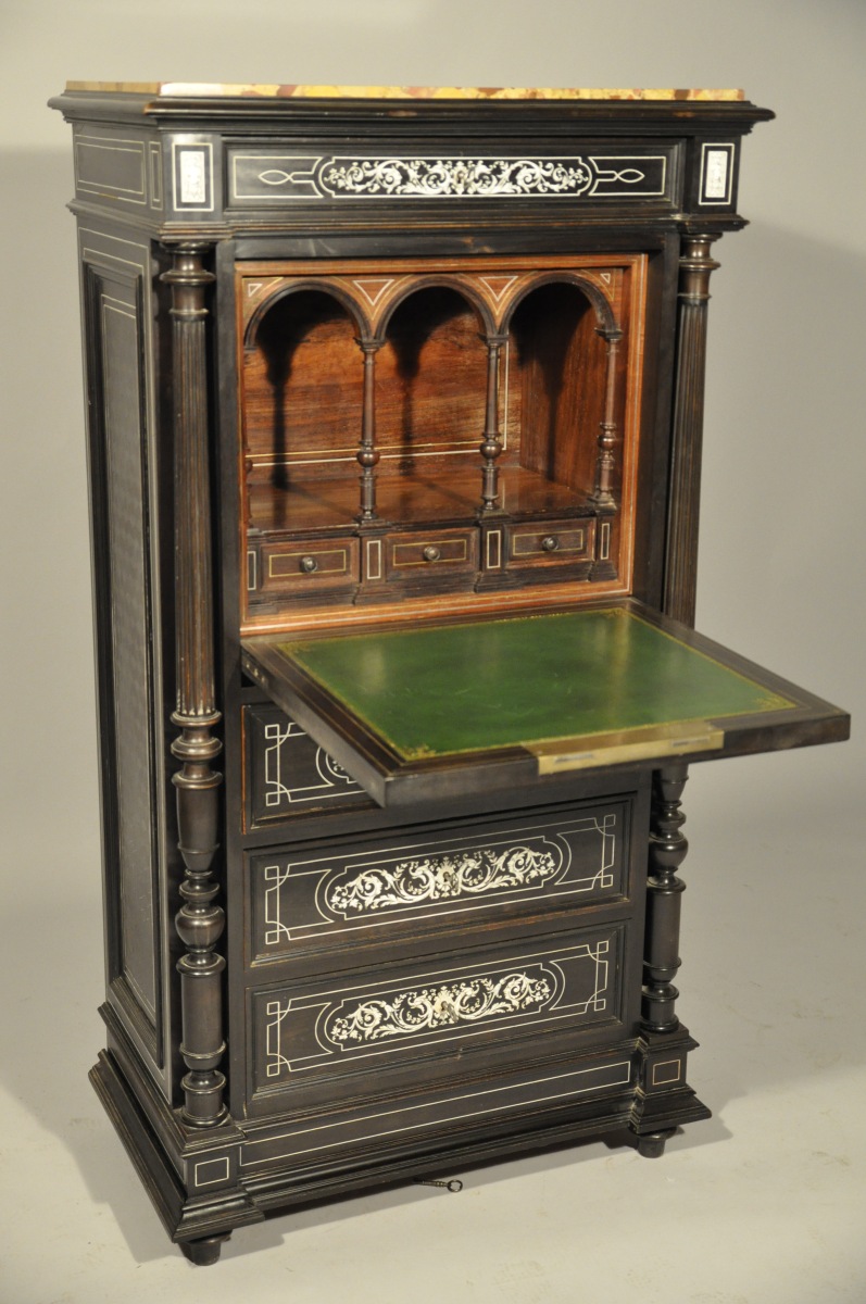SECRÉTAIRE à ABATTANT à la "BÉRAIN" à décors marquetté en bois noirci mouluré et tourné. Il ouvre à quatre tiroirs et un abattant. L'abattant, les tiroirs et les montants sont richement décoré dans le goût de Bérain d'incrustations d'ivoire: rinceaux, grotesques, vase fleuri, cartouches, fleurons et figures hybrides. L'abattant découvre un théâtre à décor architecturé dans le goût mauresque, souligné de filets d'étain et de laiton. Trois tiroirs intérieurs formant soubassement sont plaqués de bois de loupe. L'écritoire est foncé de cuir vert doré aux petits fers. Montants à colonnes détachées tournées et cannelées. Dessus en brèche d'Alep.