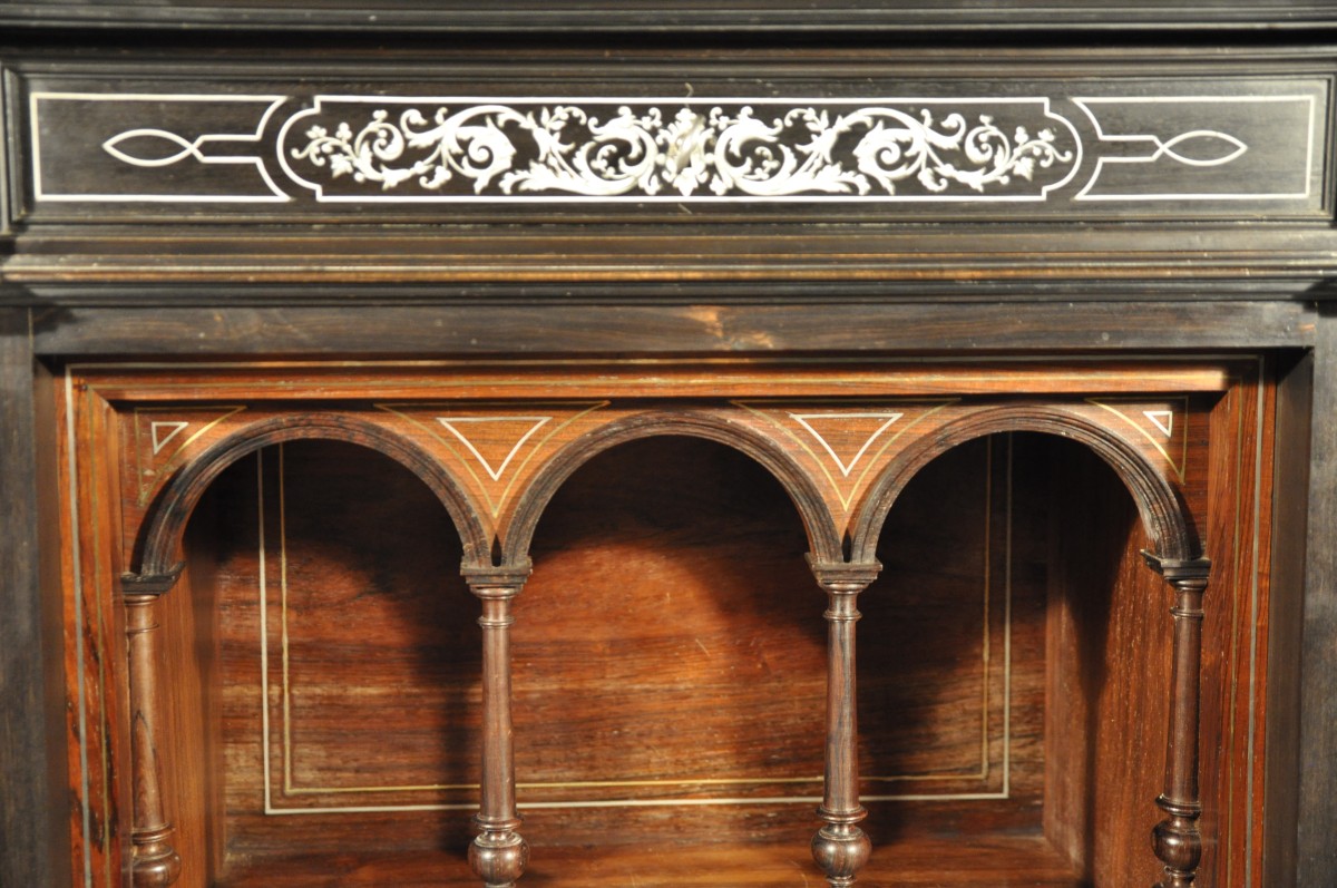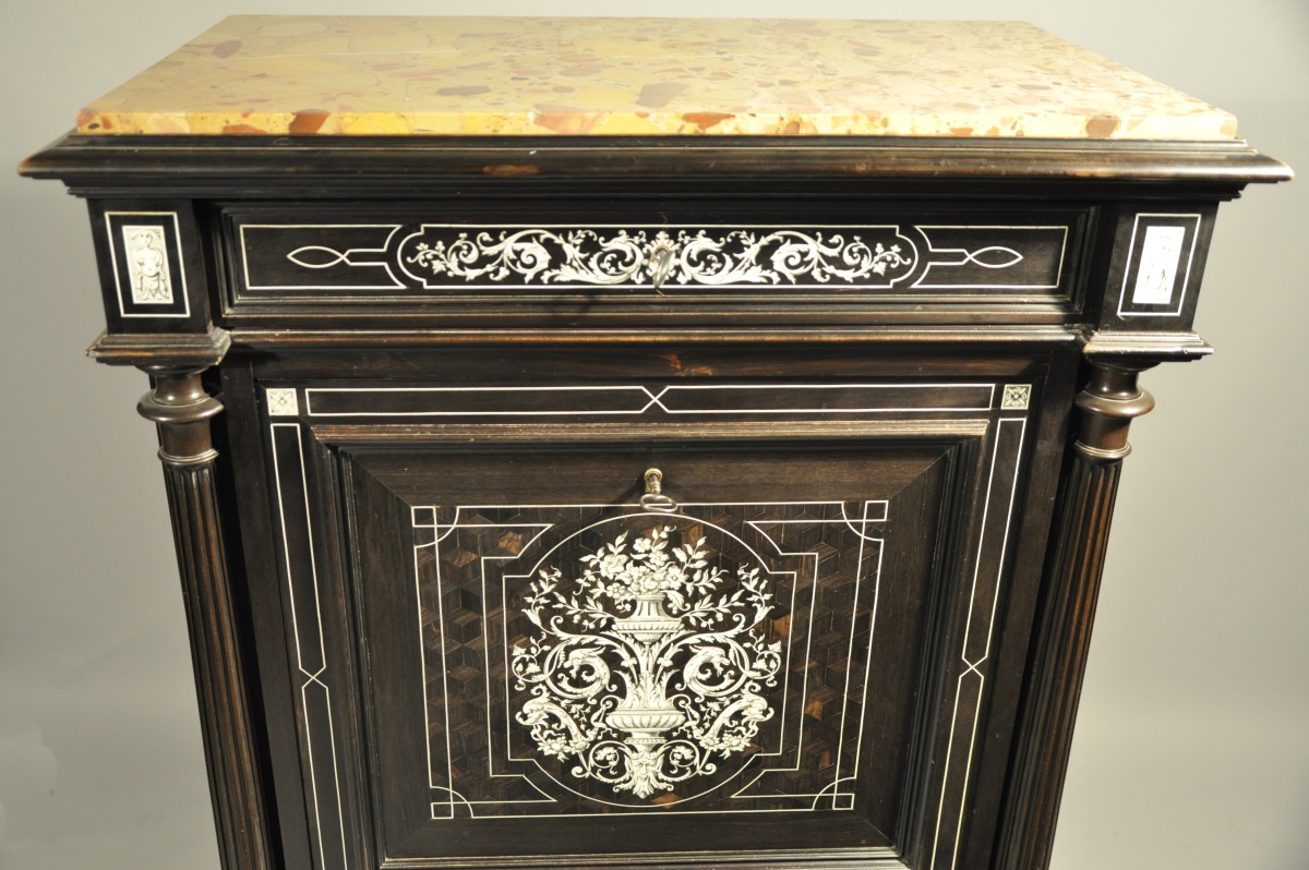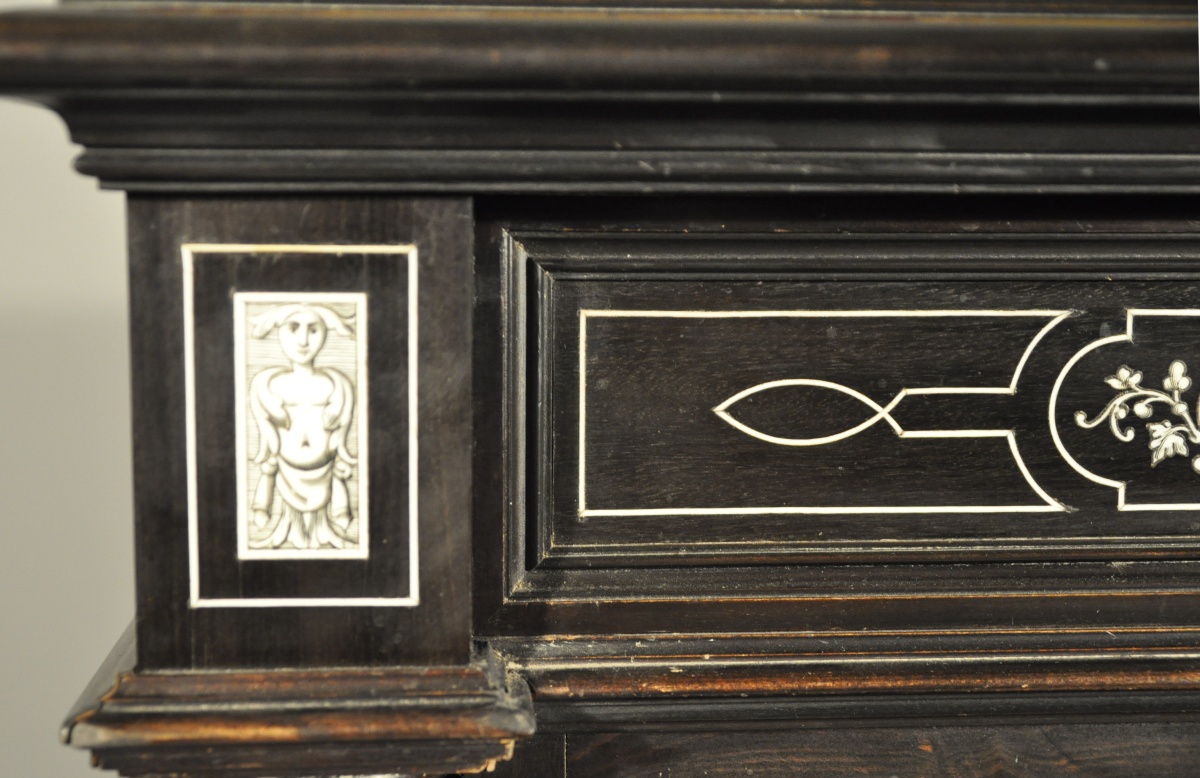 SECRÉTAIRE à ABATTANT à la "BÉRAIN" à décors marquetté en bois noirci mouluré et tourné. Il ouvre à quatre tiroirs et un abattant. L'abattant, les tiroirs et les montants sont richement décoré dans le goût de Bérain d'incrustations d'ivoire: rinceaux, grotesques, vase fleuri, cartouches, fleurons et figures hybrides. L'abattant découvre un théâtre à décor architecturé dans le goût mauresque, souligné de filets d'étain et de laiton. Trois tiroirs intérieurs formant soubassement sont plaqués de bois de loupe. L'écritoire est foncé de cuir vert doré aux petits fers. Montants à colonnes détachées tournées et cannelées. Dessus en brèche d'Alep.