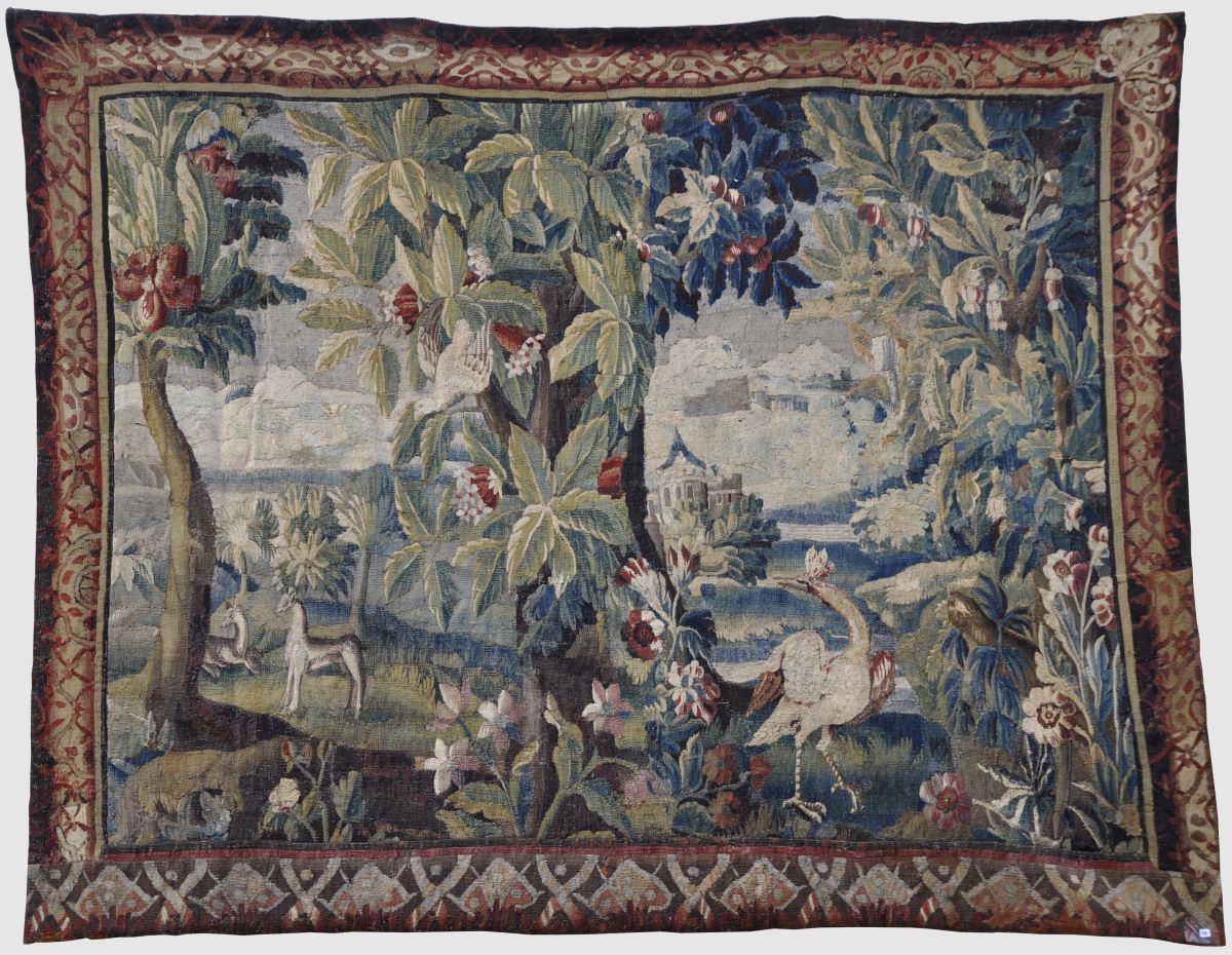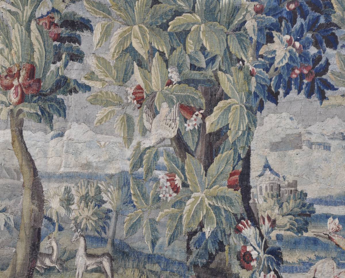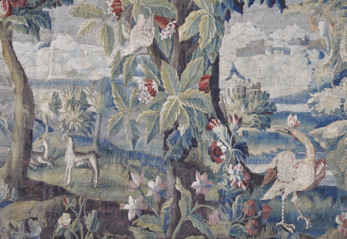 AUBUSSON. TAPISSERIE en laine et soie. Verdure au château animée de deux biches et d'un échassier.